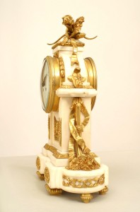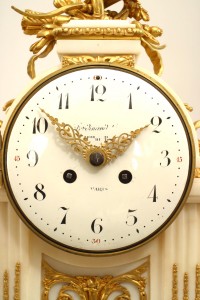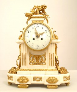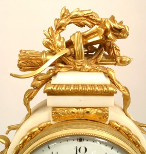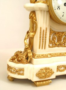 French Louis XVI-style (19th Century) white marble mantle clock with gilt bronze trim and a pediment with a wreath & arrows. (Clock face signed: HGER DU ROI, PARIS) (Not working)