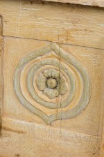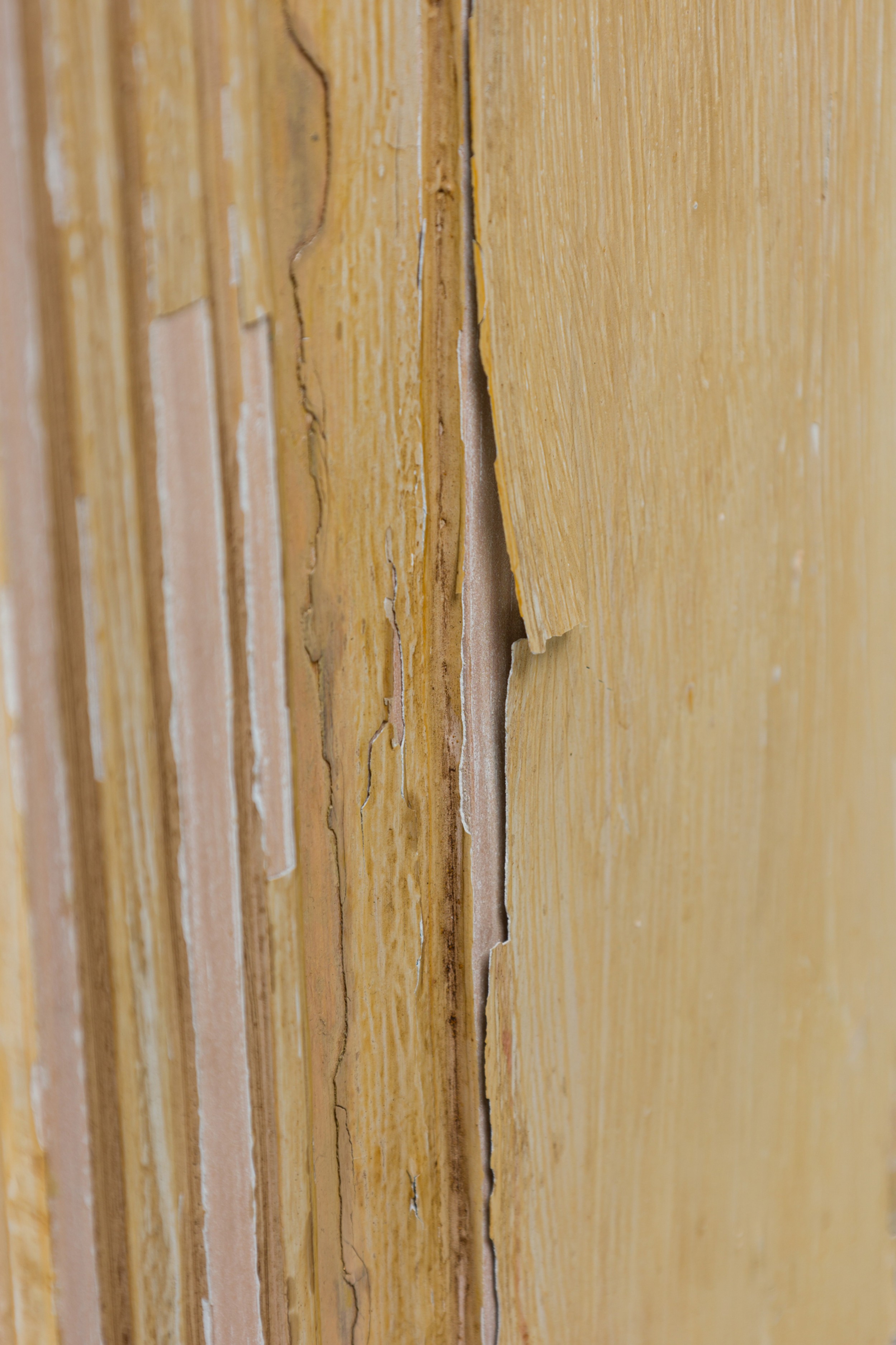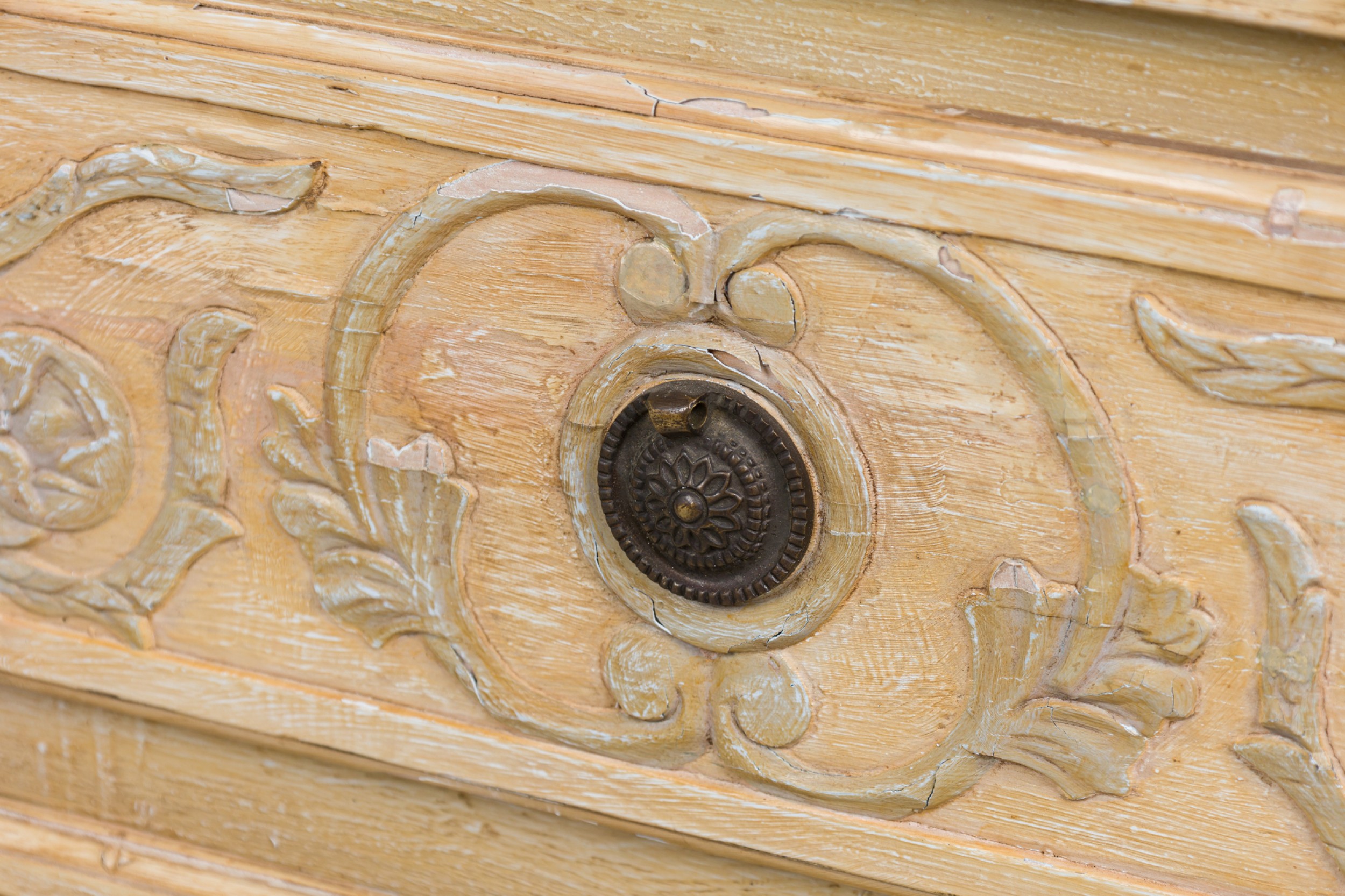 Style: French Materials & Techniques: Metal, painted, wood Category: Dining Room Condition: Losses and separation of painted finish throughout. Top right drawer pull is missing its ring. Separation between drawer fronts and drawer bottoms. Top is loose. Good; Minor losses