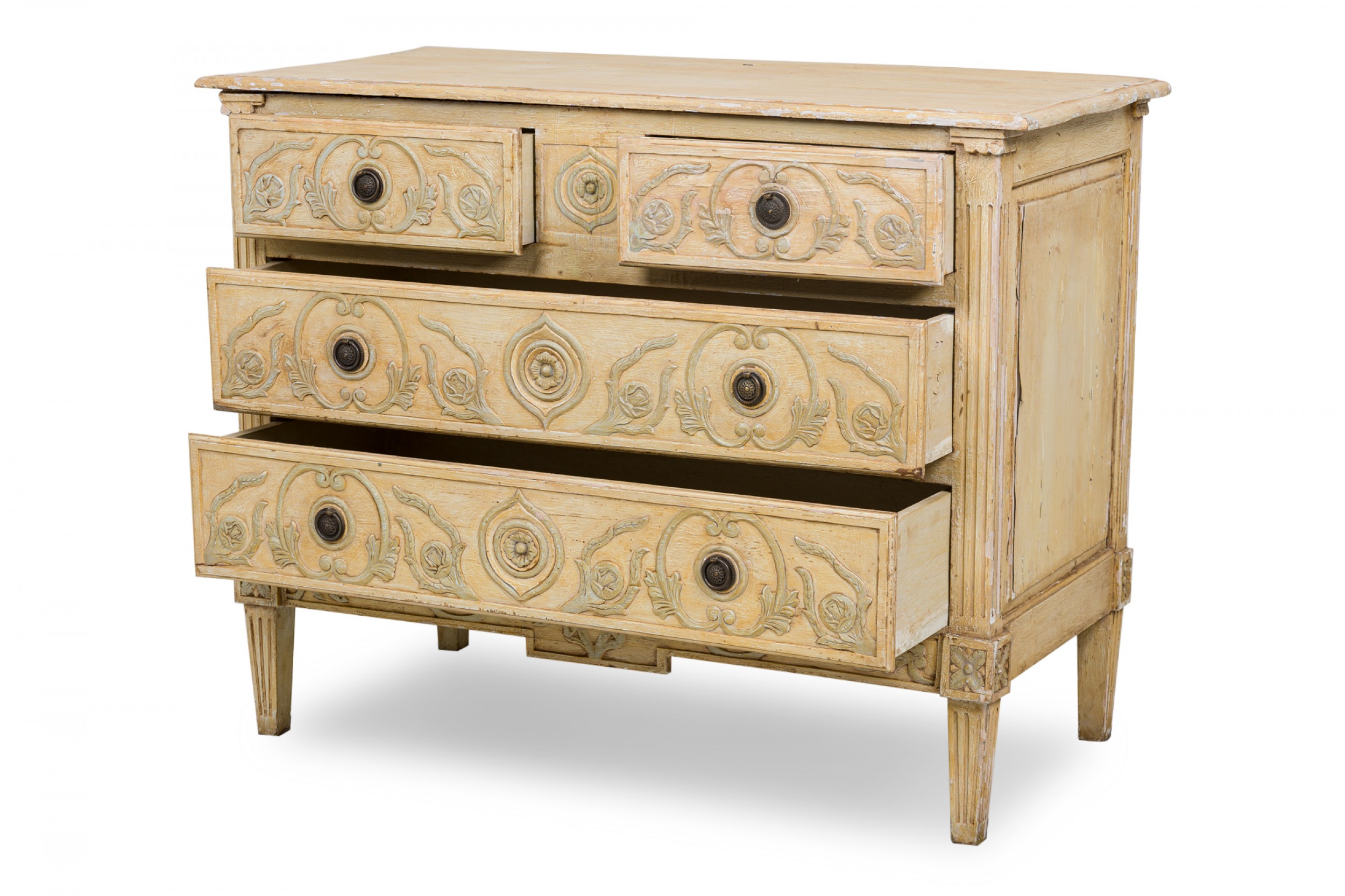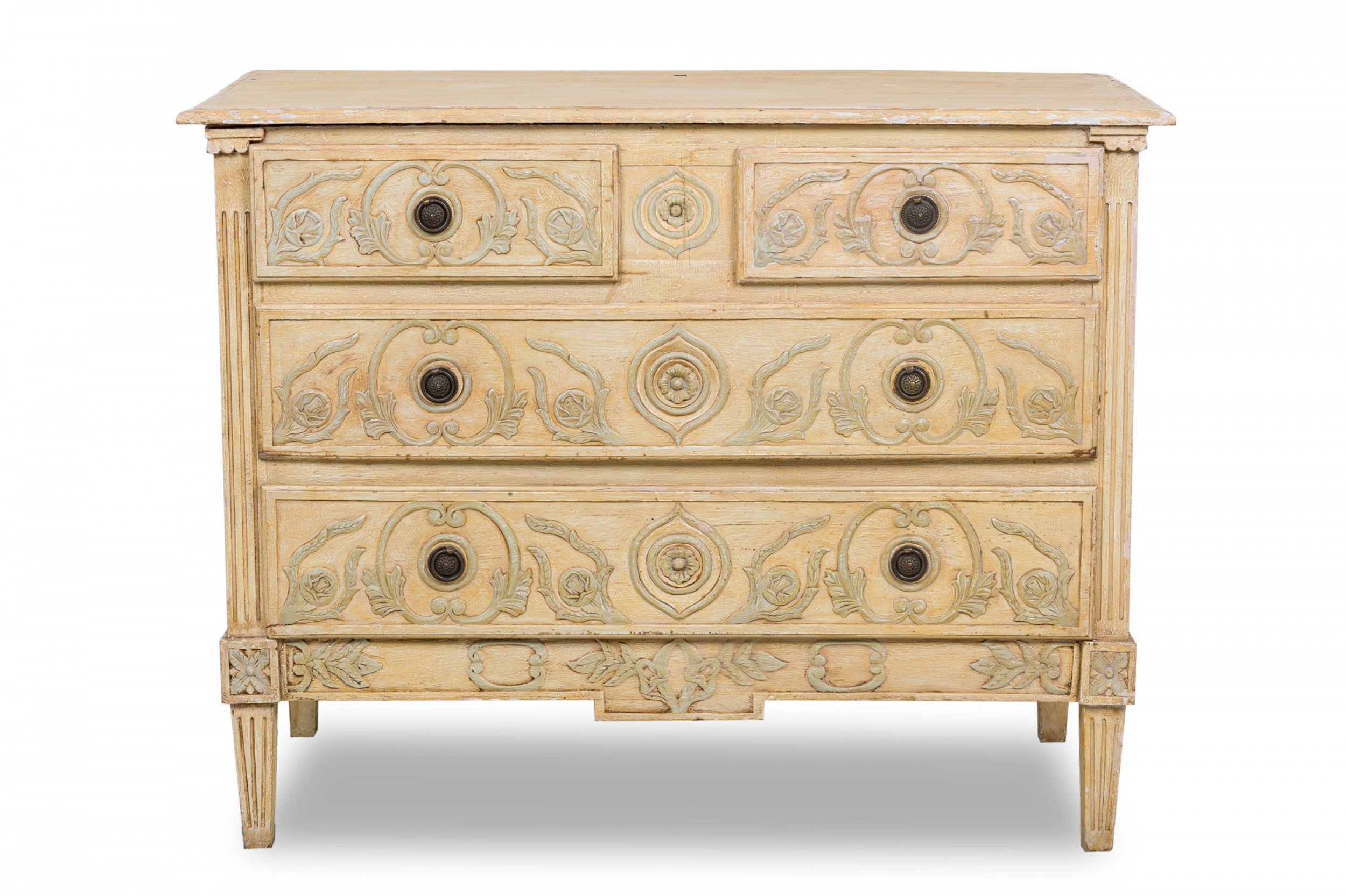 French Louis XVI Provincial Style 4-Drawer Beige and Gray Painted Commode