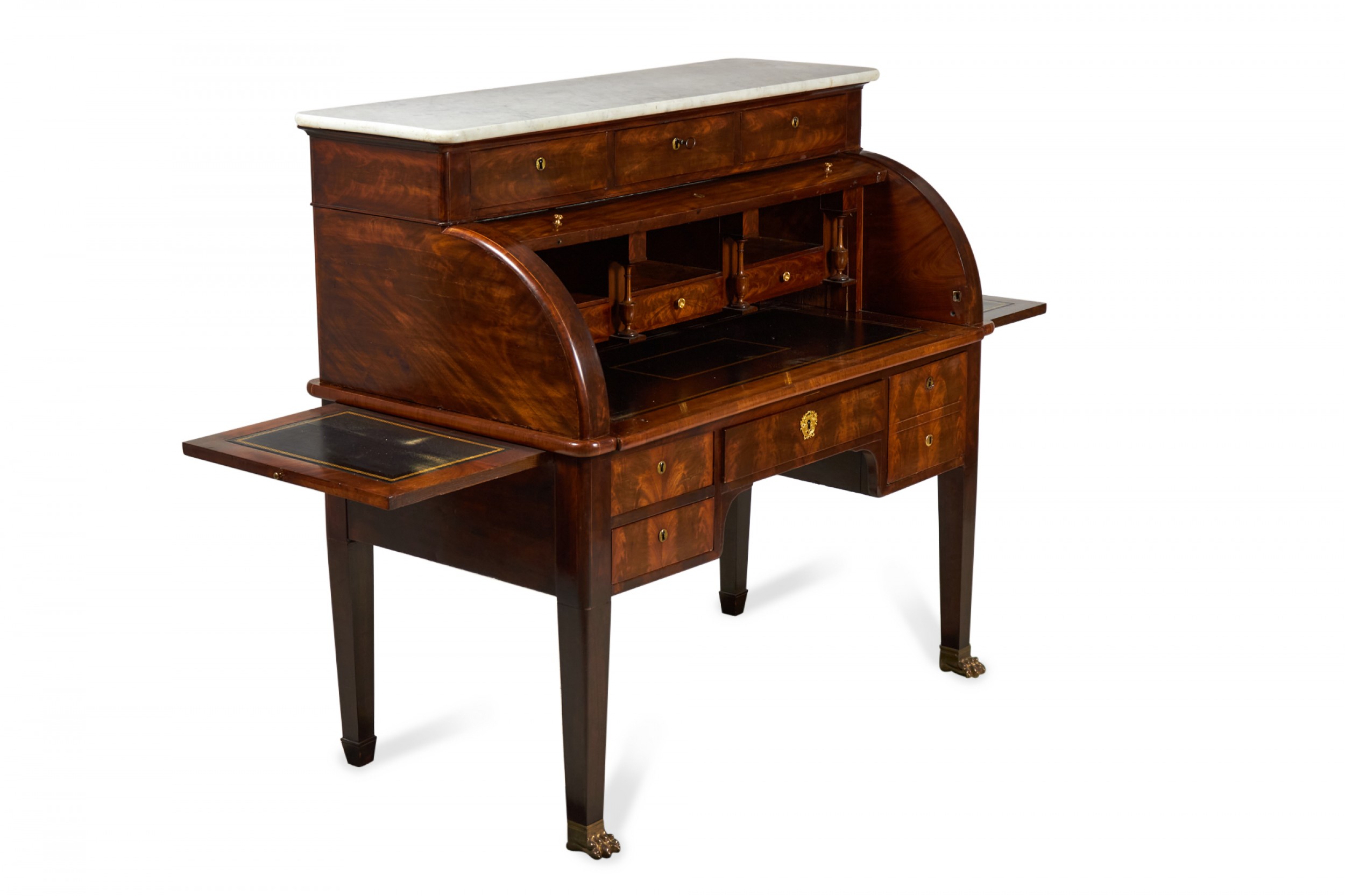 French Louis XVI-style mahogany roll top desk with rectangular gallery marble top resting above 3 keyed drawers. The roll top reveals a gilt embossed leather desk top, under 3 brass pull drawers. Four lockable drawers are positioned around the kneehole, with the rightmost drawer containing a hidden compartment..