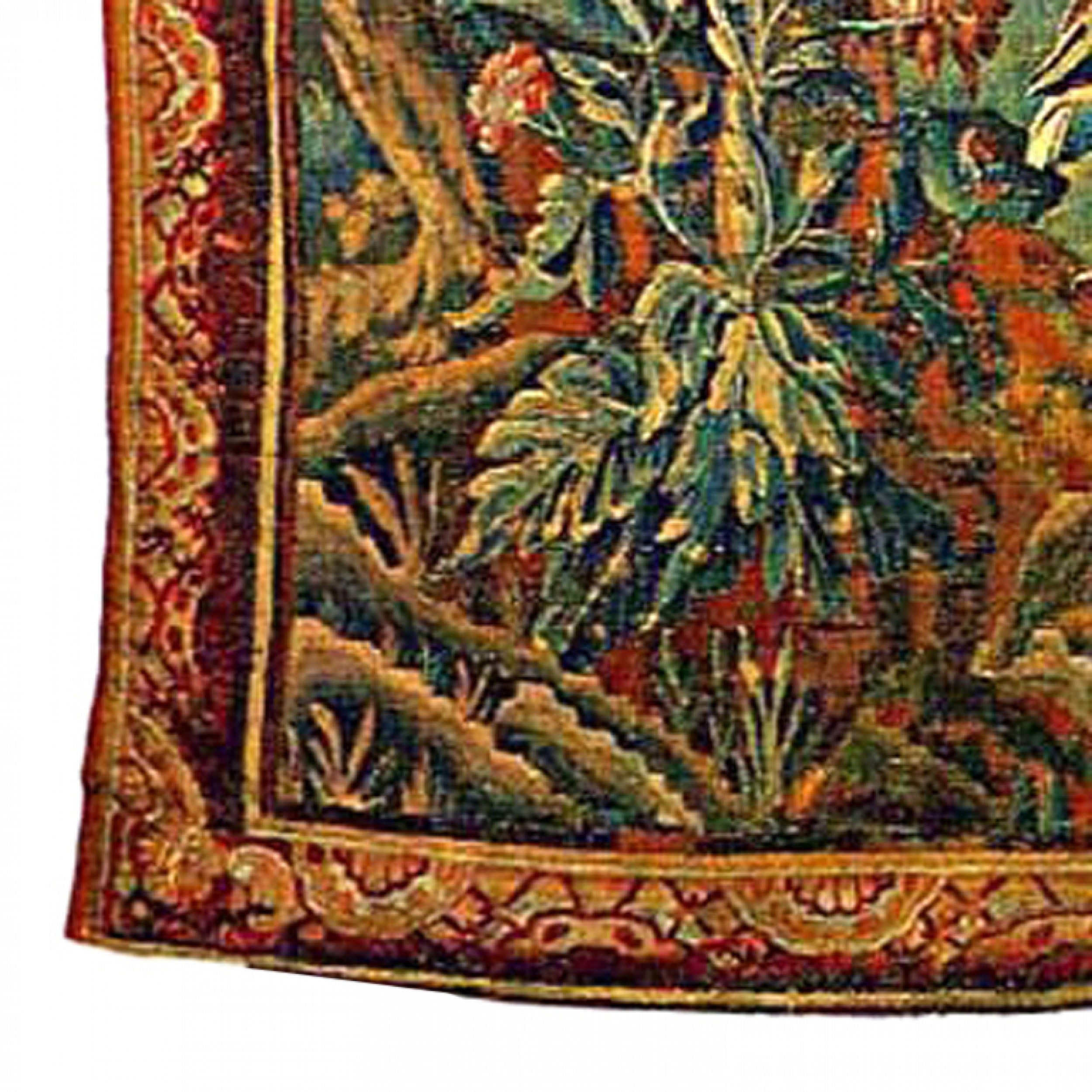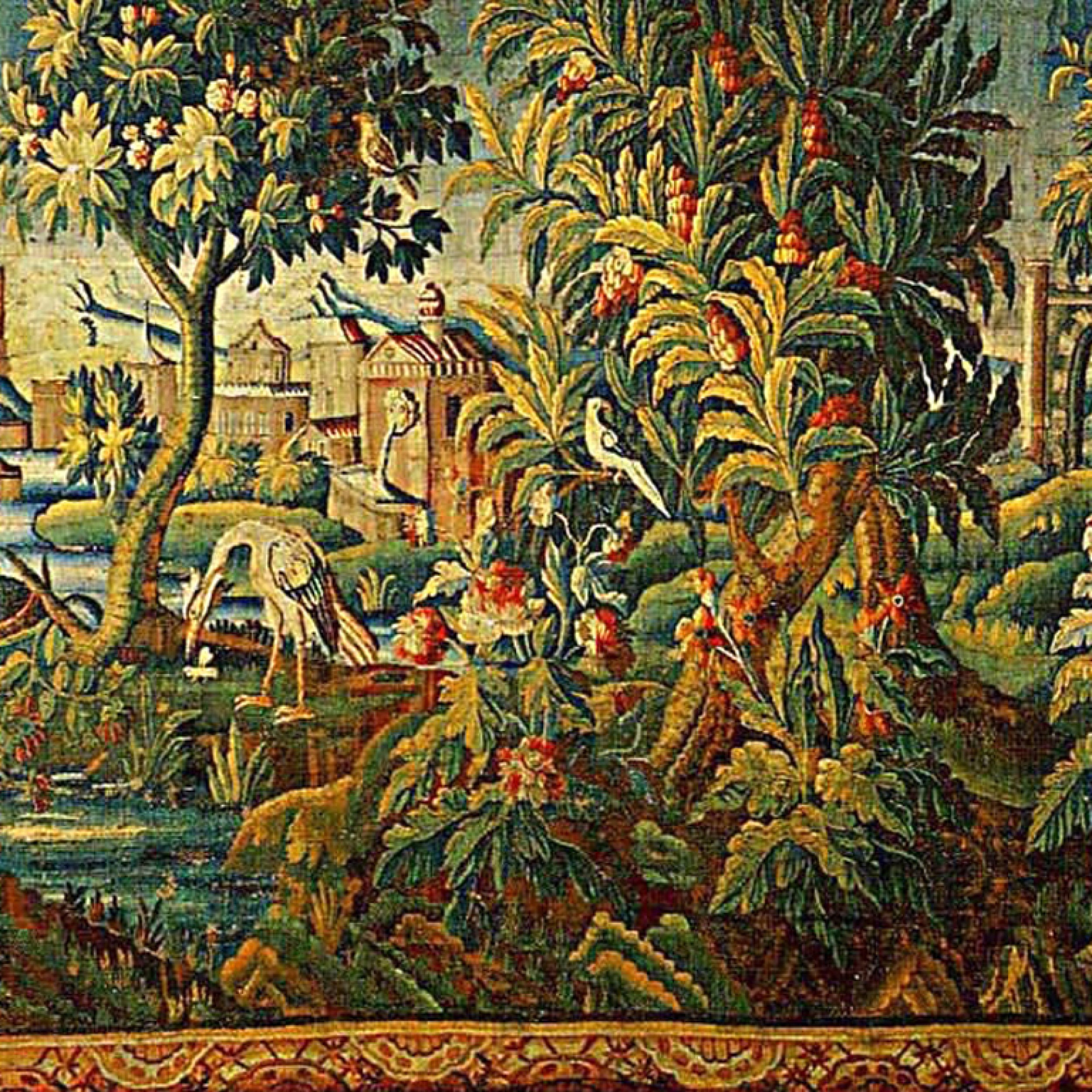 French Louis XVI style (18th Century) blue & green Aubusson Verdue landscape tapestry with castle in background and herons in foreground with rust colored border..
