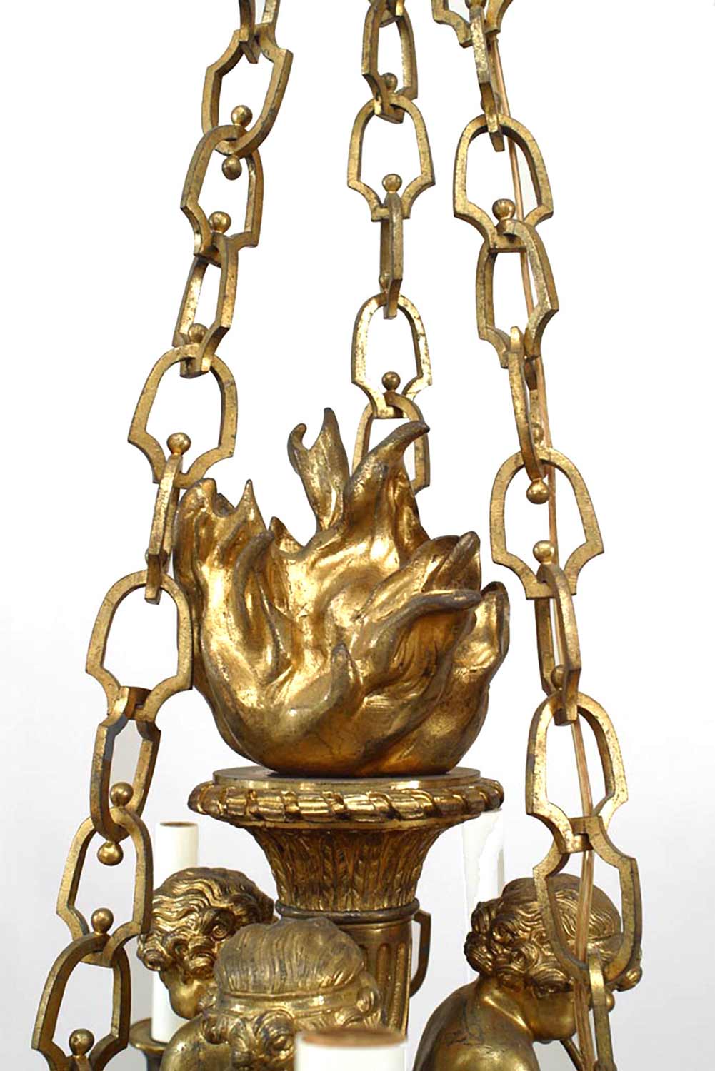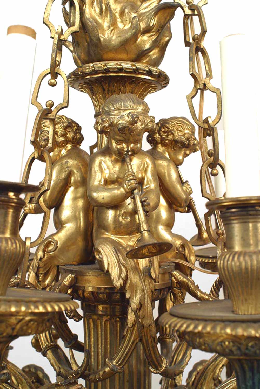 French Louis XVI-Style (19th Century) bronze dore 9 scroll arm chandelier with 3 cupids playing instruments and flame top.