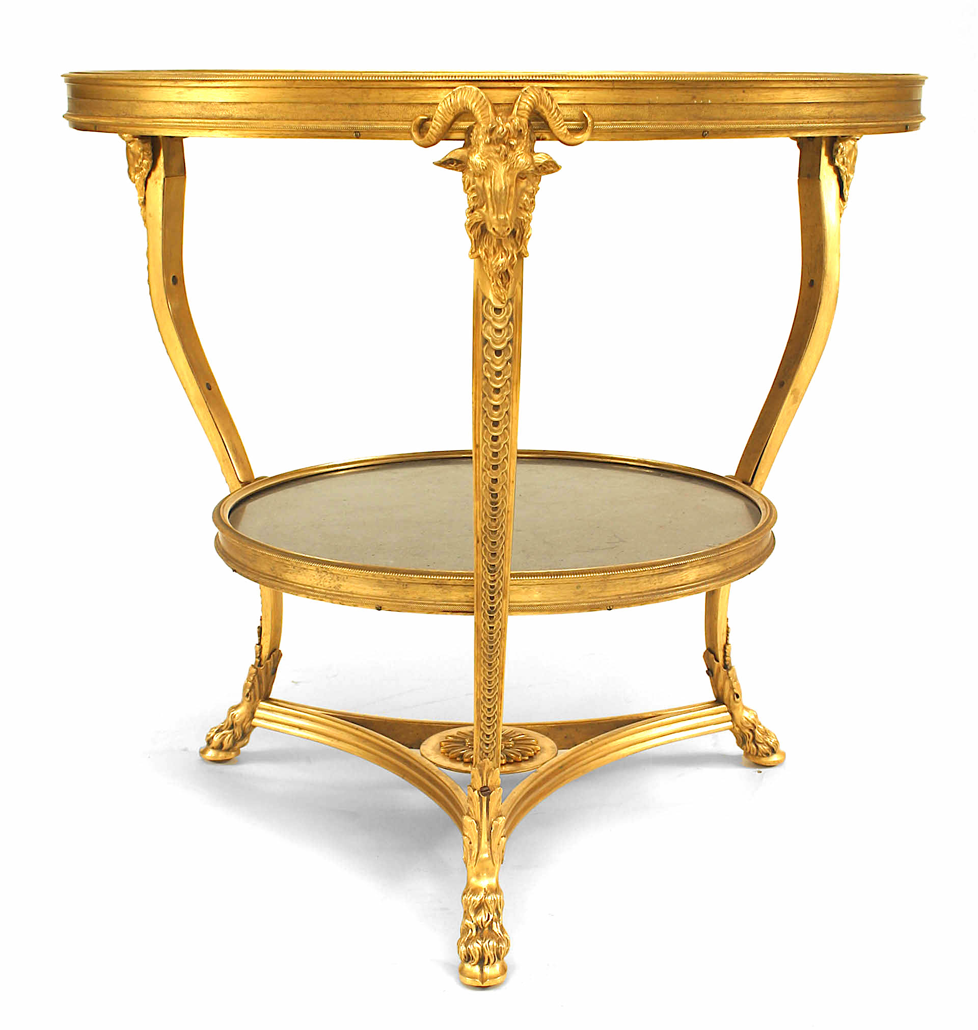 French Louis XVI-style (19/20th Century) bronze dore ram head design round end table with 3 legs supporting an inset black marble top and shelf with a bottom stretcher..