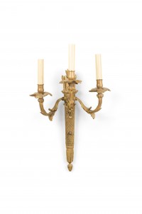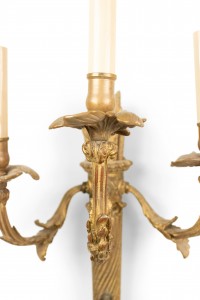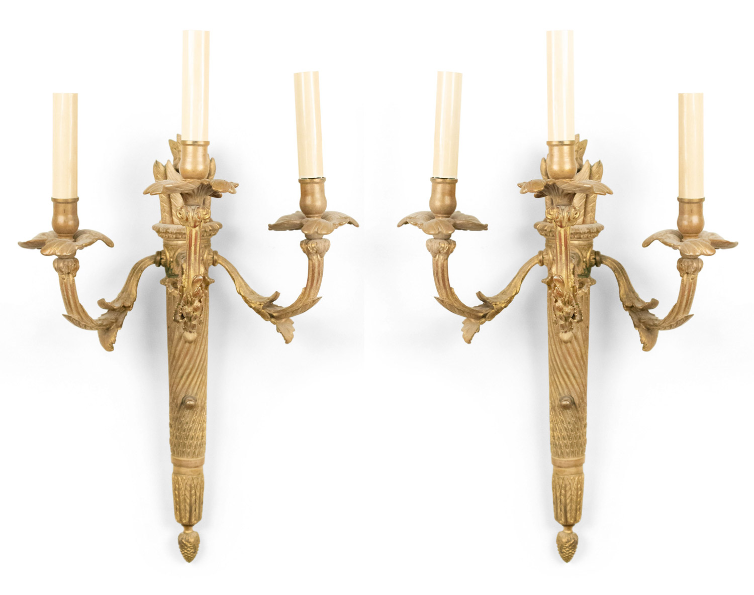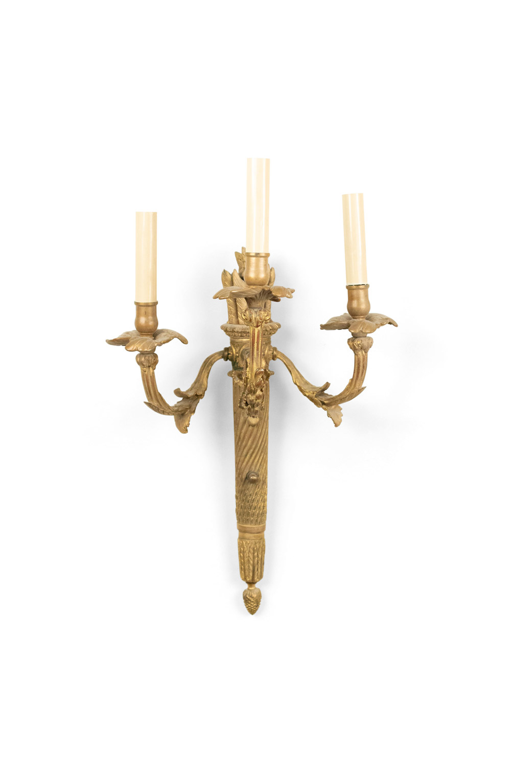 PAIR of French Louis XVI-style (19th Century) bronze dore wall sconces with three arms with torch designs and arrow tops. (PRICED AS PAIR).