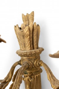 PAIR of French Louis XVI-style (19th Century) bronze dore wall sconces with three arms with torch designs and arrow tops. (PRICED AS PAIR)