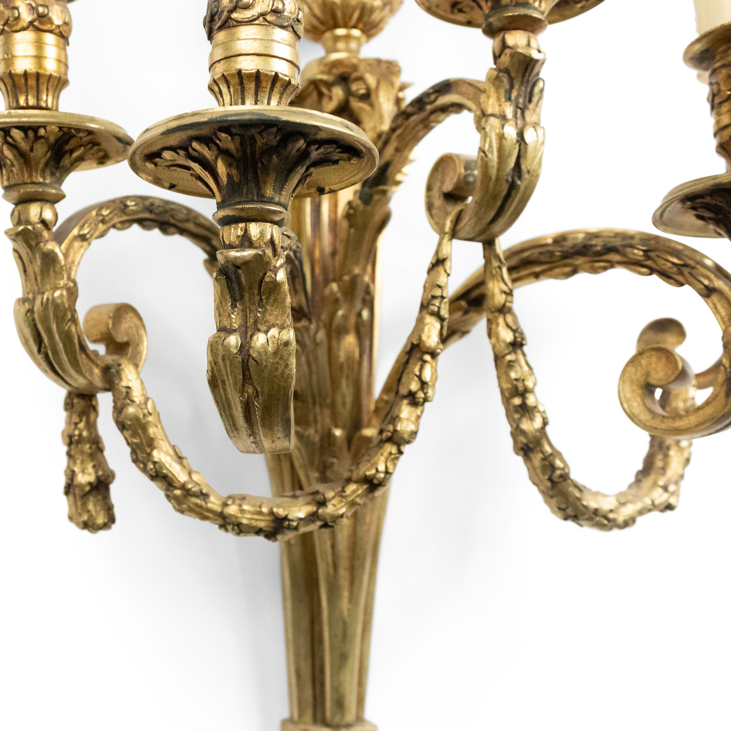 PAIR of French Louis XVI-style (19/20th Century) bronze dore wall sconces with five arms, festoon design, and finial tops with ram heads (PRICED AS PAIR)