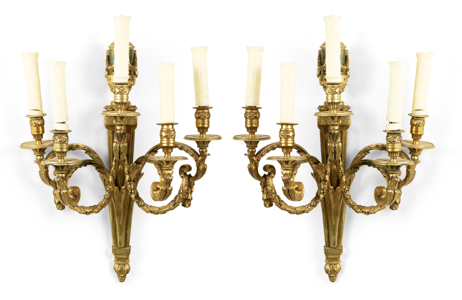 PAIR of French Louis XVI-style (19/20th Century) bronze dore wall sconces with five arms, festoon design, and finial tops with ram heads (PRICED AS PAIR).