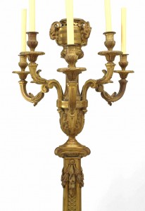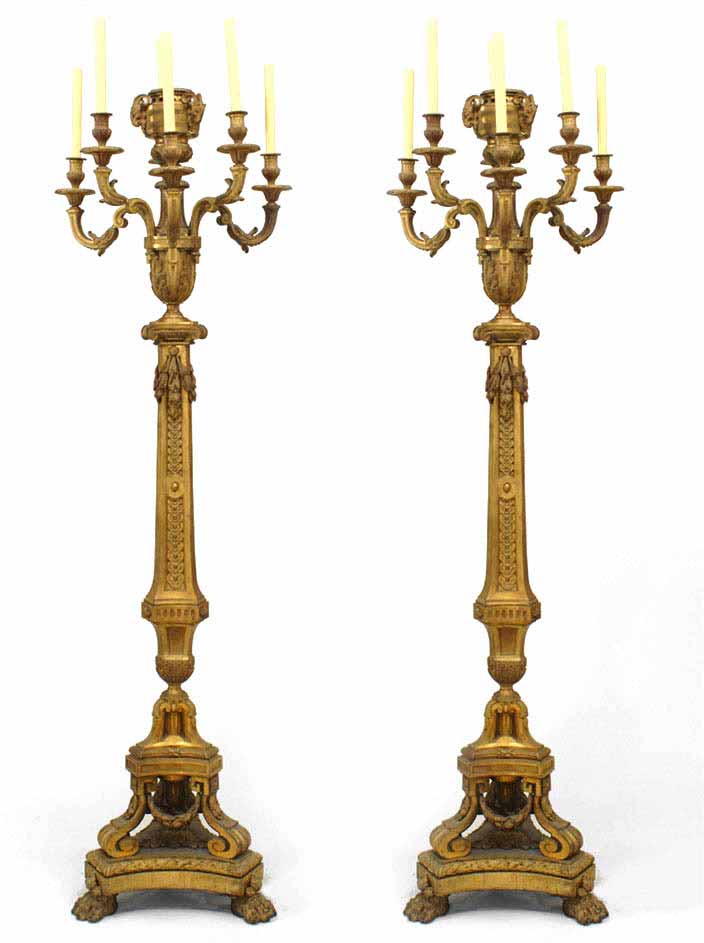 Pair of French Louis XVI-style (19th Century) bronze festoon design floor torchiere with 6 arms and claw foot base (PRICED AS PAIR).