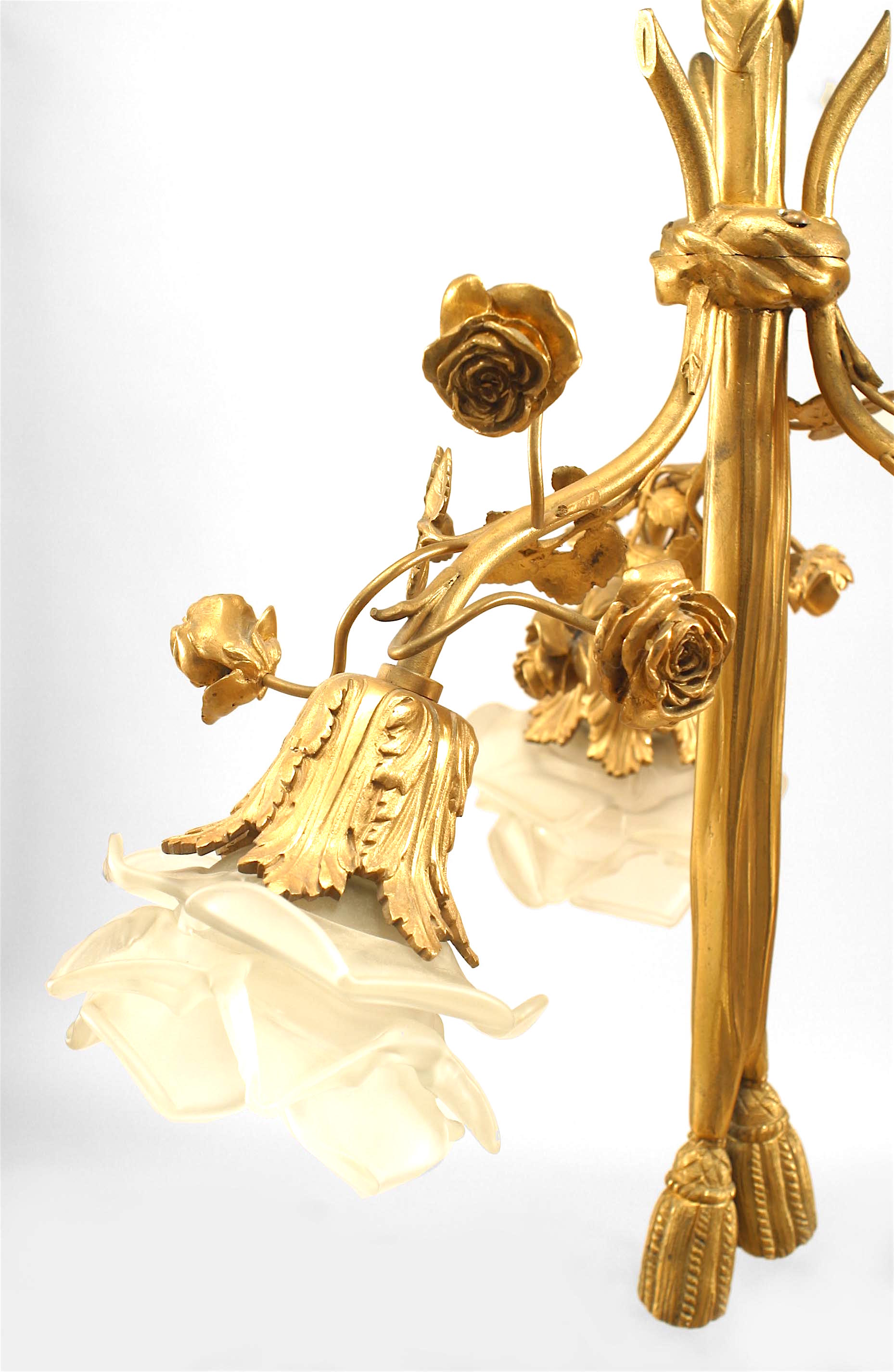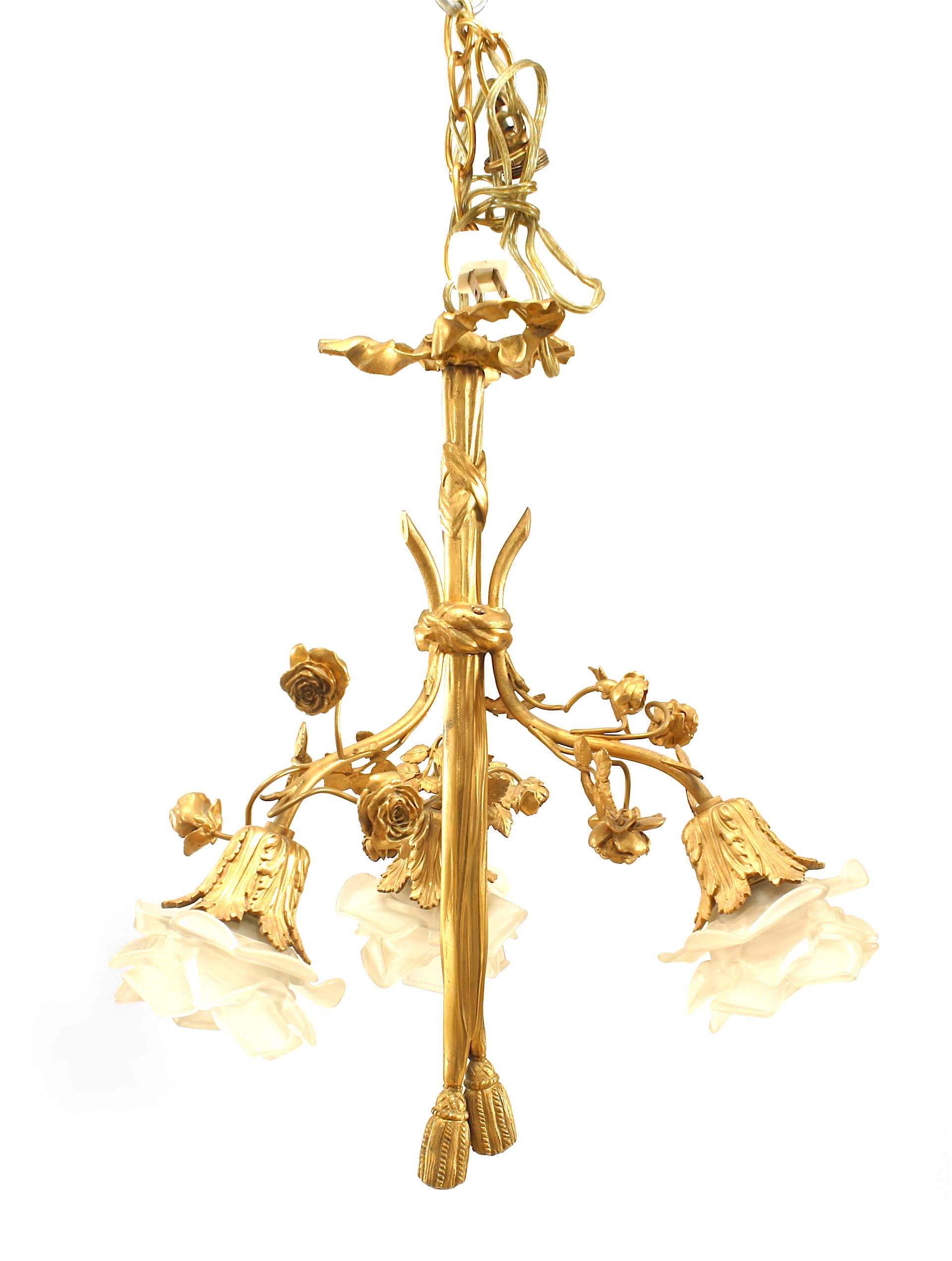 French Louis XVI-style gilt bronze chandelier with embellished with flowers and centered with a drape ending in tassels with 3 arms ending with glass flower shades..