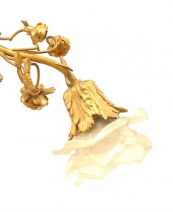 French Louis XVI-style gilt bronze chandelier with embellished with flowers and centered with a drape ending in tassels with 3 arms ending with glass flower shades.