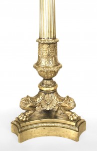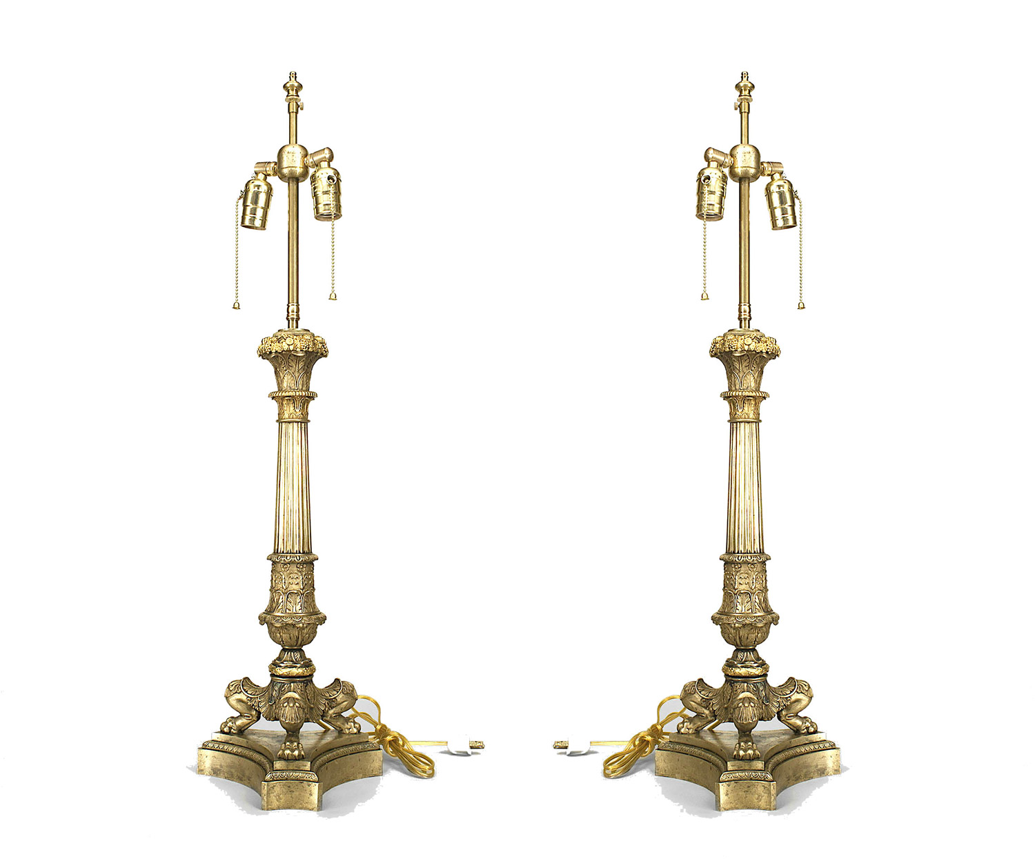 PAIR of French Louis XVI style (19th Century) gilt bronze table lamps with a tall fluted column supported on three feet and resting on a triangular base, originally converted candelabras (PRICED AS PAIR).