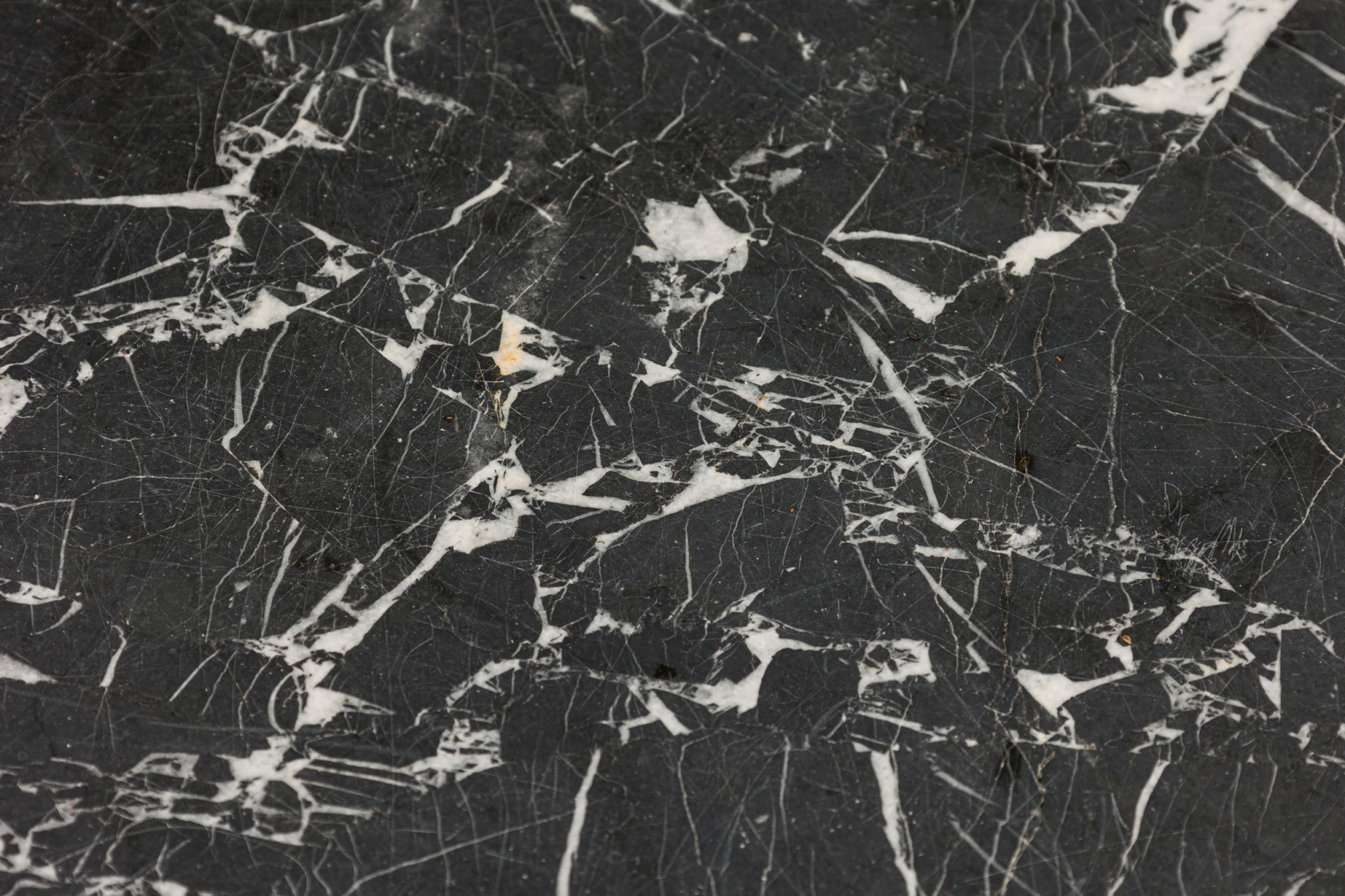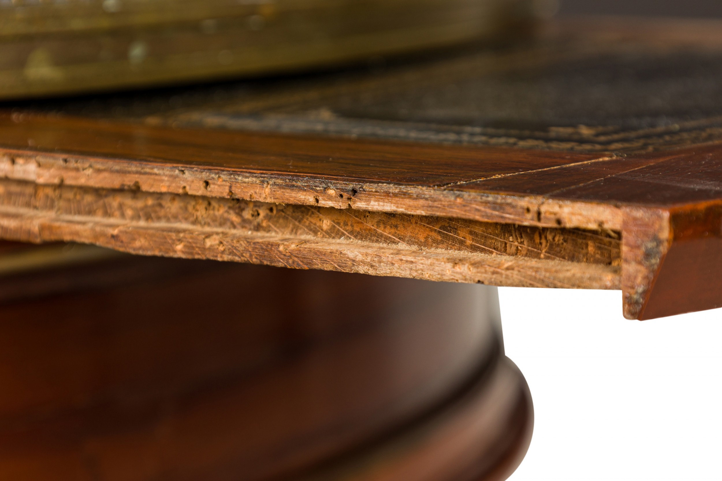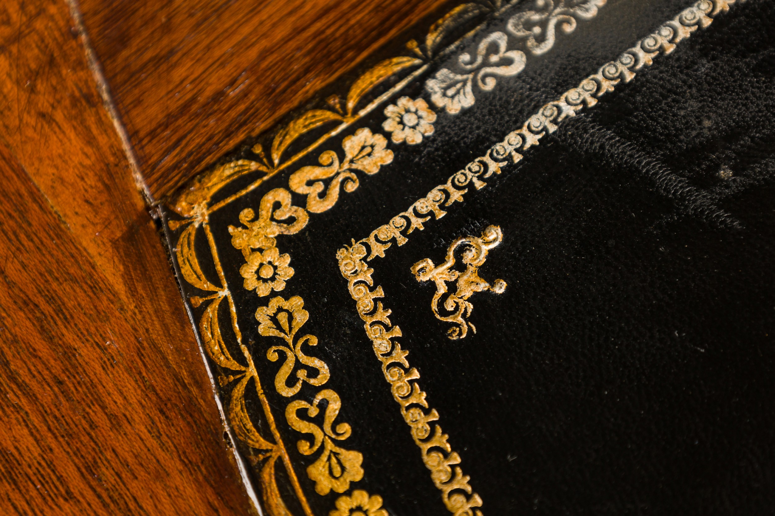 Style: French Materials & Techniques: Brass, marble, wood Category: Tables Condition: Minor scuffing to finish, damage to leather insets consistent with use. Good; Wear consistent with age and use