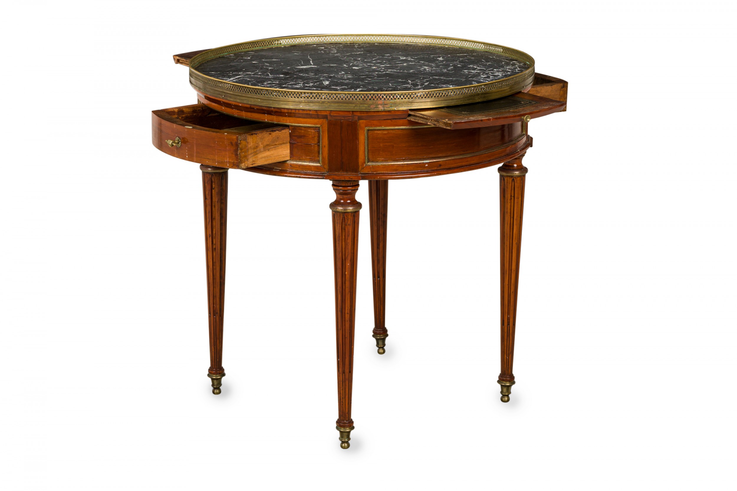 French Louis XVI-style (2nd half 19th Century) circular mahogany bouillotte table with a black marble top with a bronze filigree gallery above two drawers with hand-shaped bronze pulls and two black gold embossed leather inset side shelves having circular bronze pulls, resting on four tapered and fluted legs ending in bronze sabots.