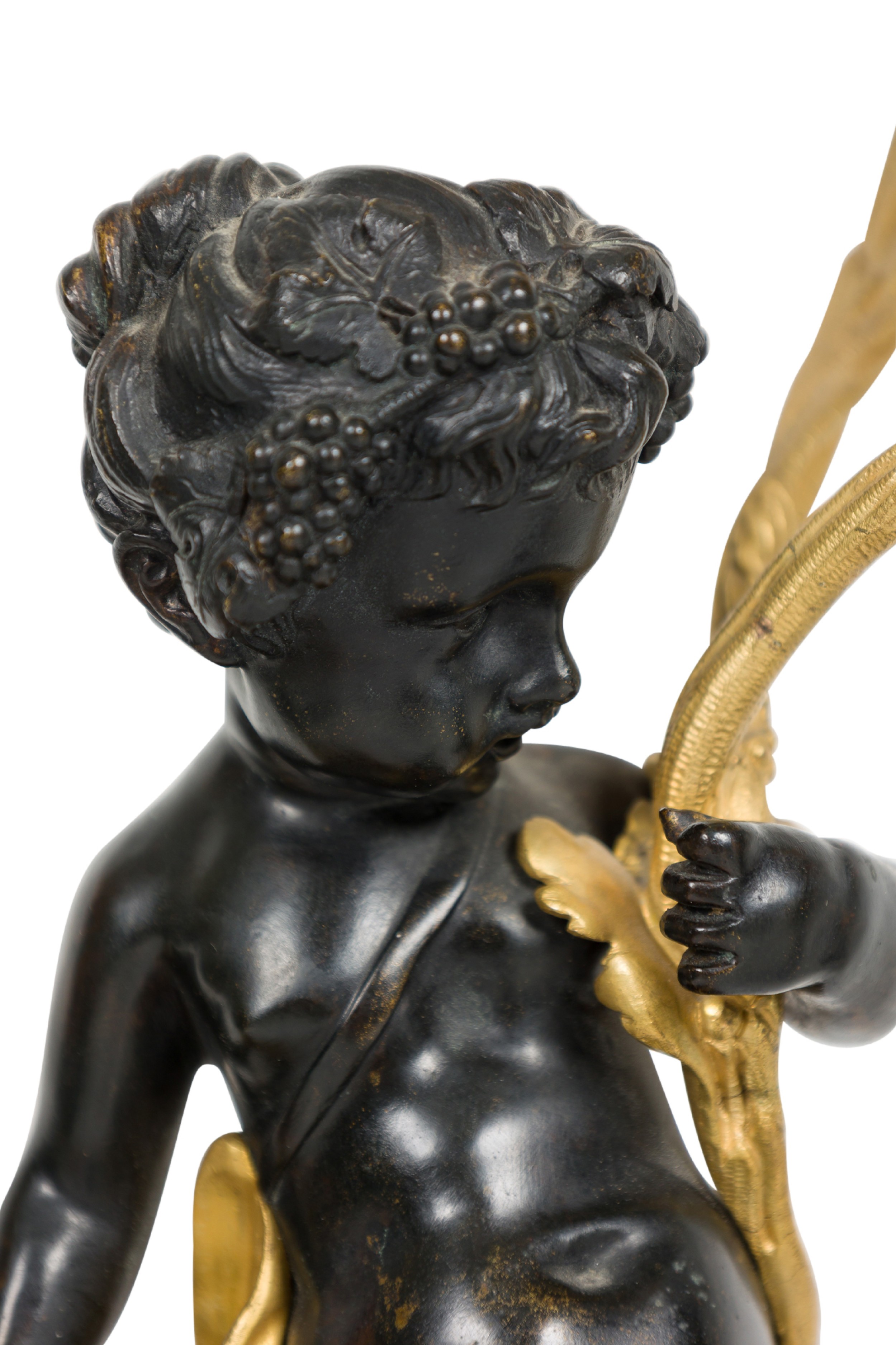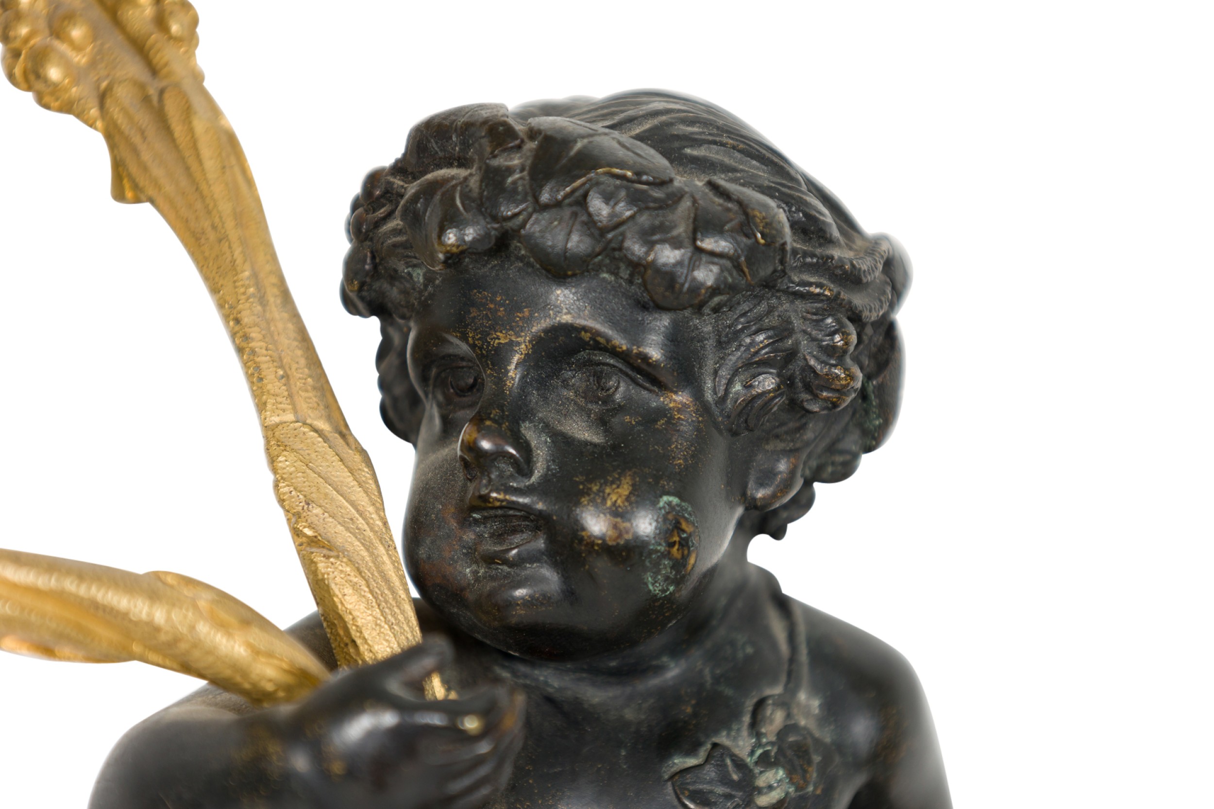 PAIR of French Louis XVI-style (19th Century) gilt and patinated bronze candelabra with a cupid/satyr figure holding 2 foliate arms and raised on rouge marble bases (PRICED AS PAIR).