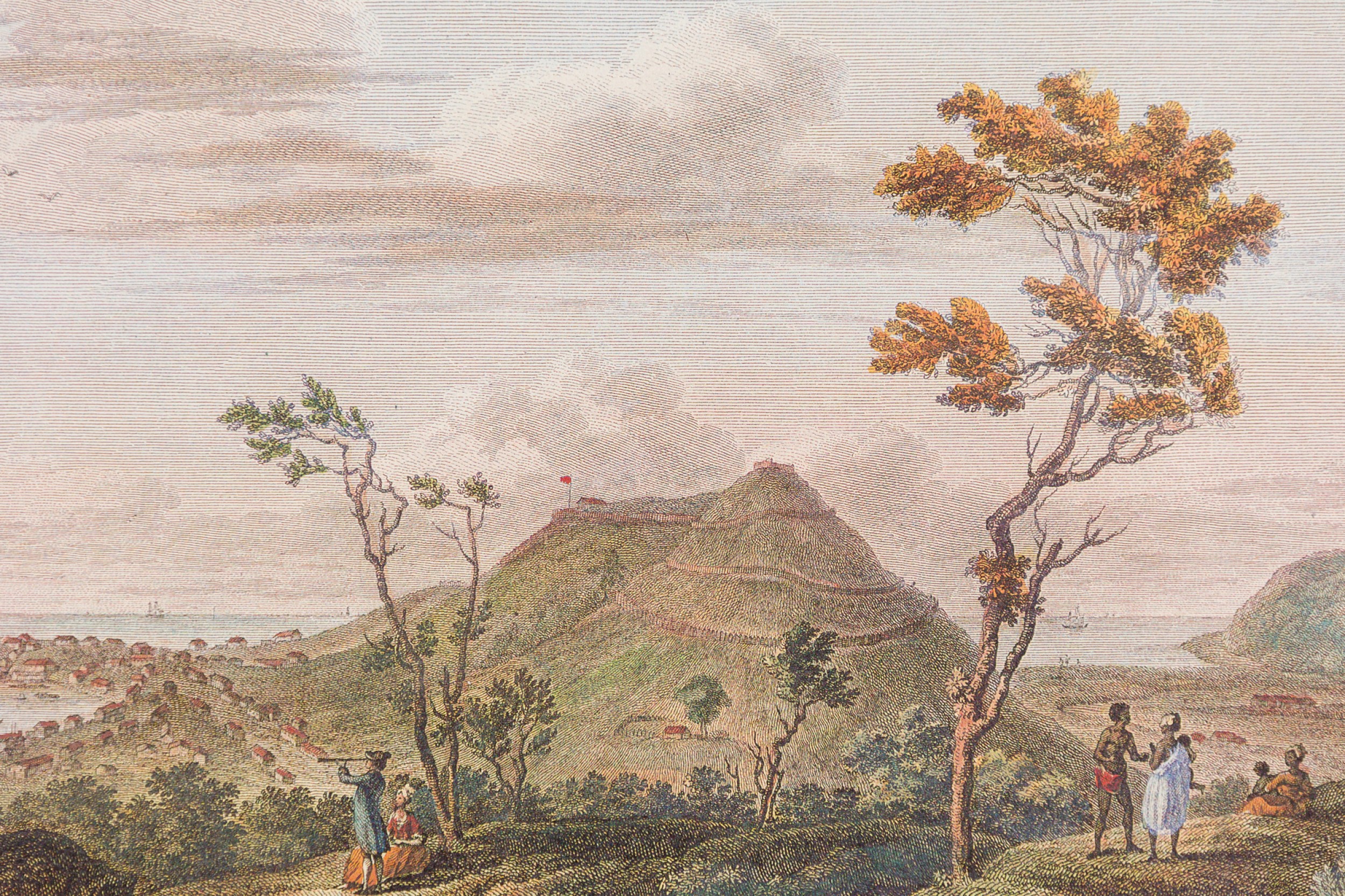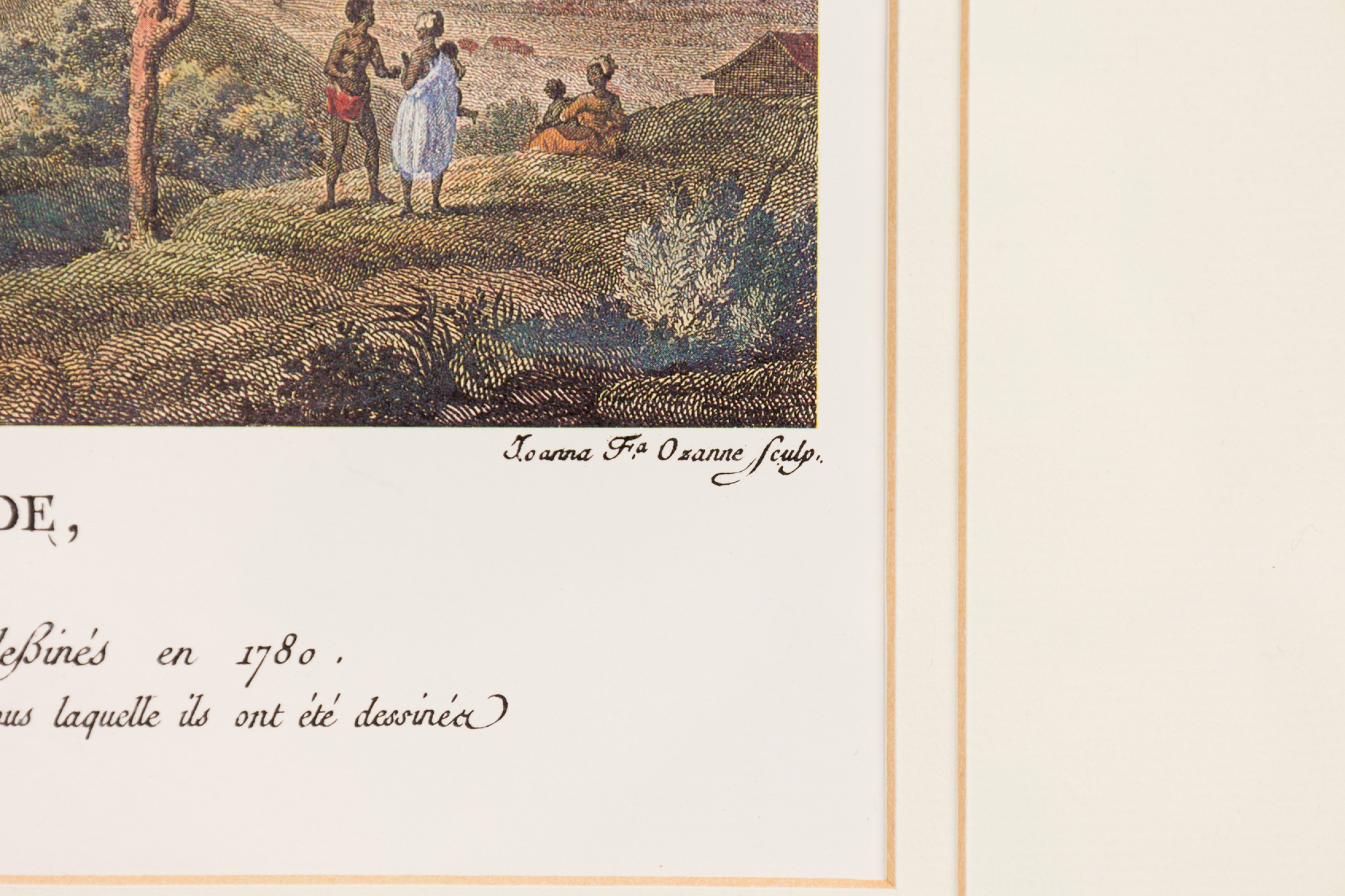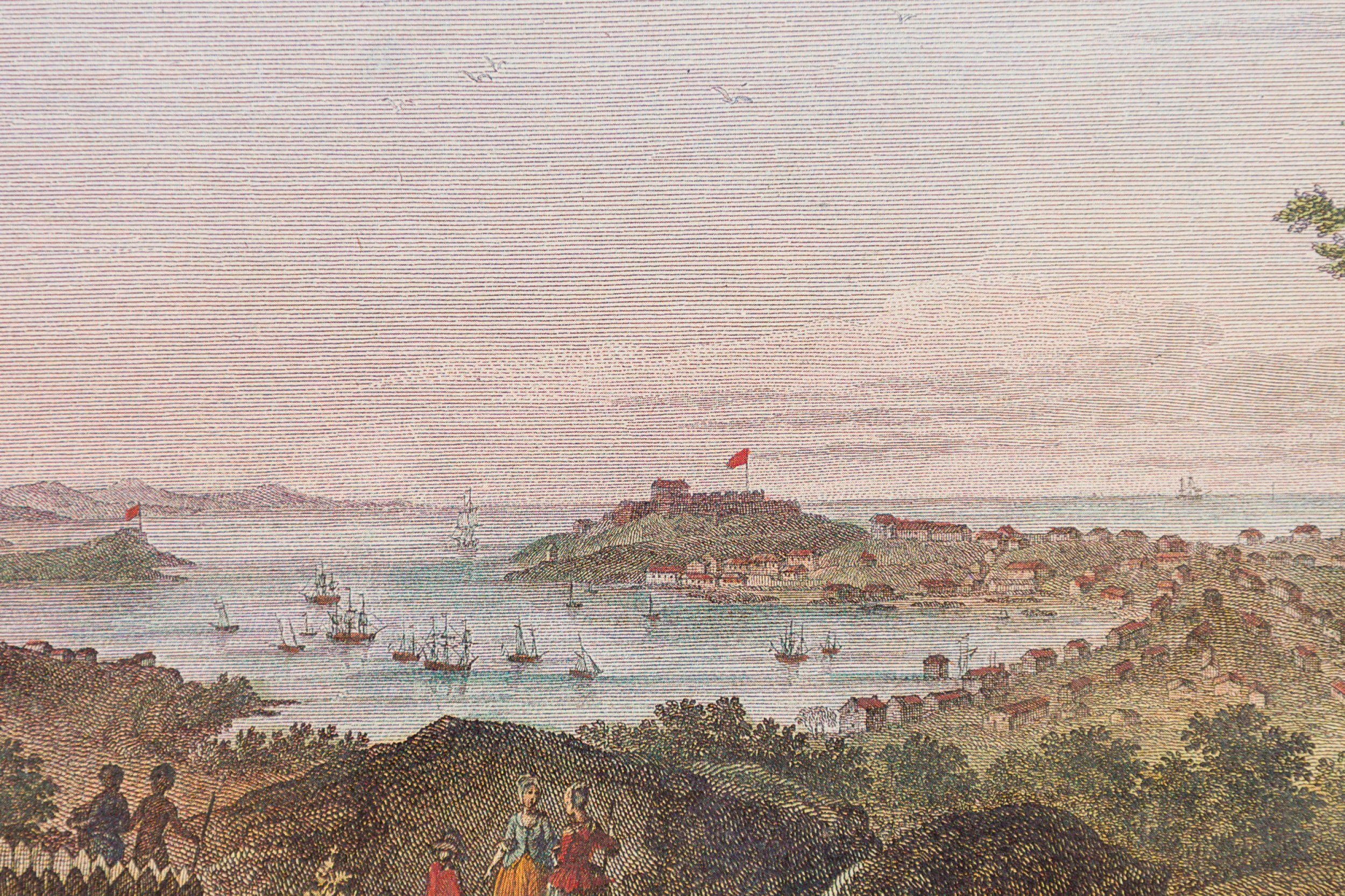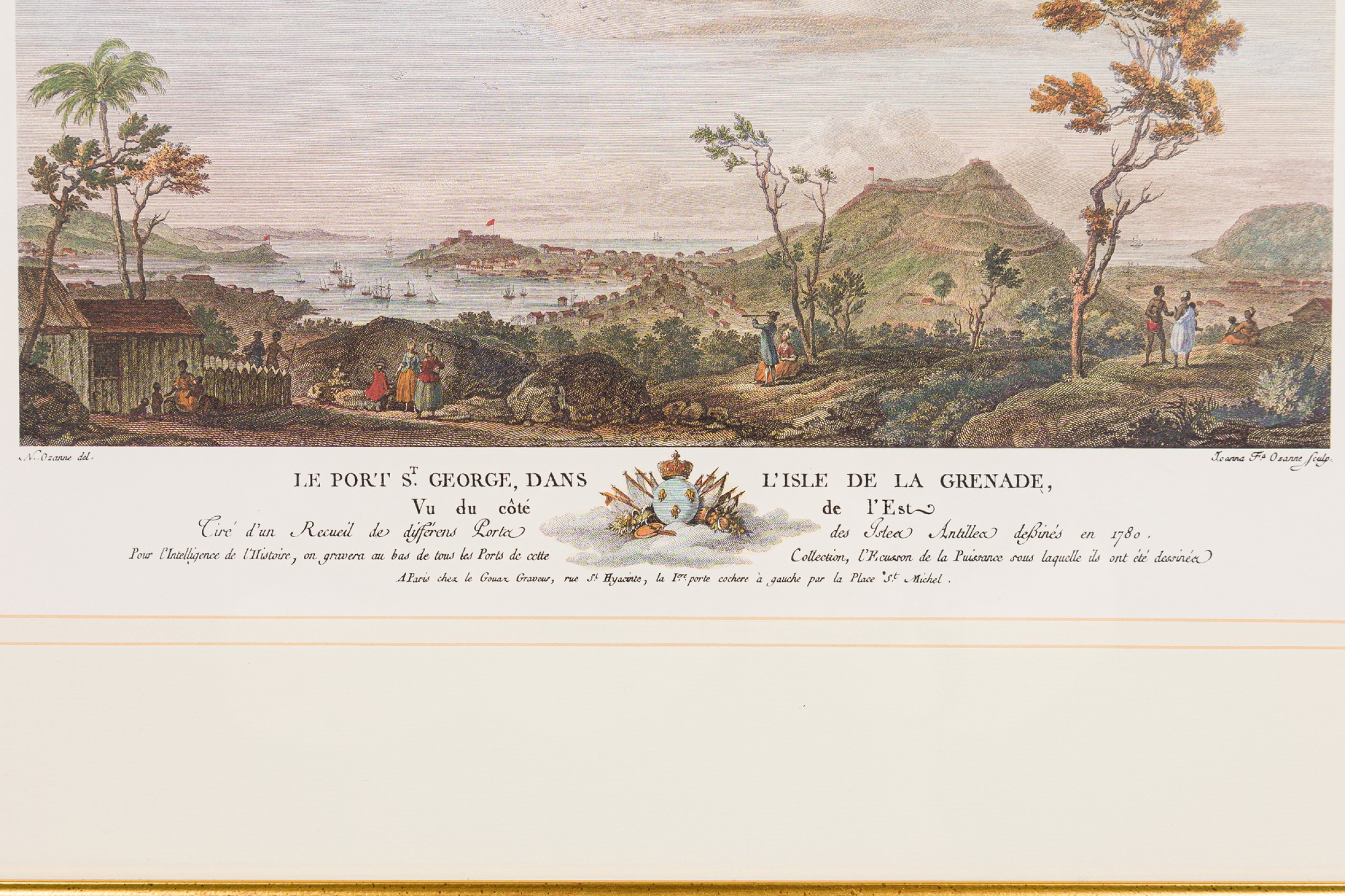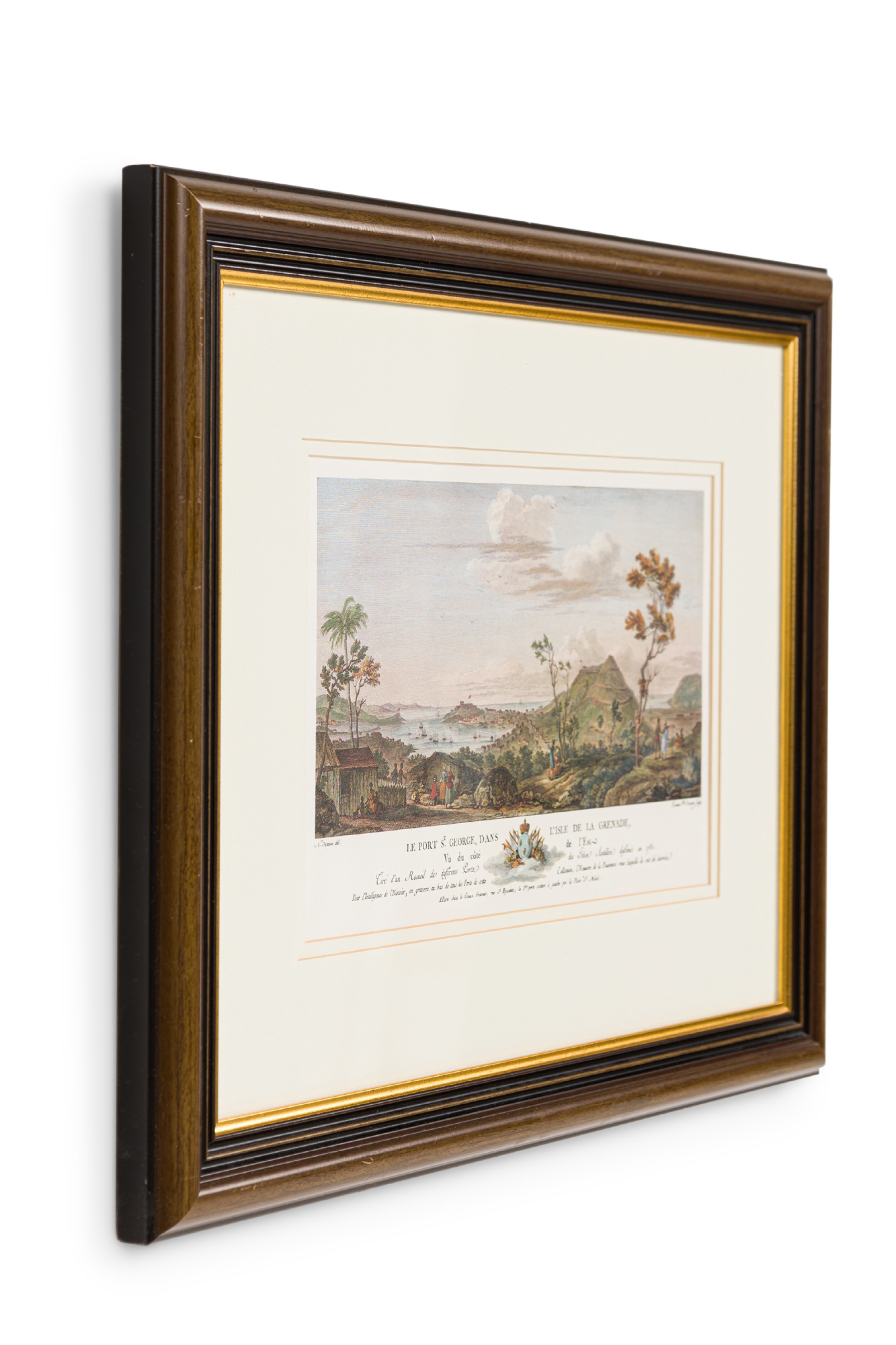 French Louis XVI pre-revolution reproduction print in a walnut and gilt trim frame titled: "Le Port St. George", depicting French colonial settlers surveying the port in Grenada (N. OZANNE)