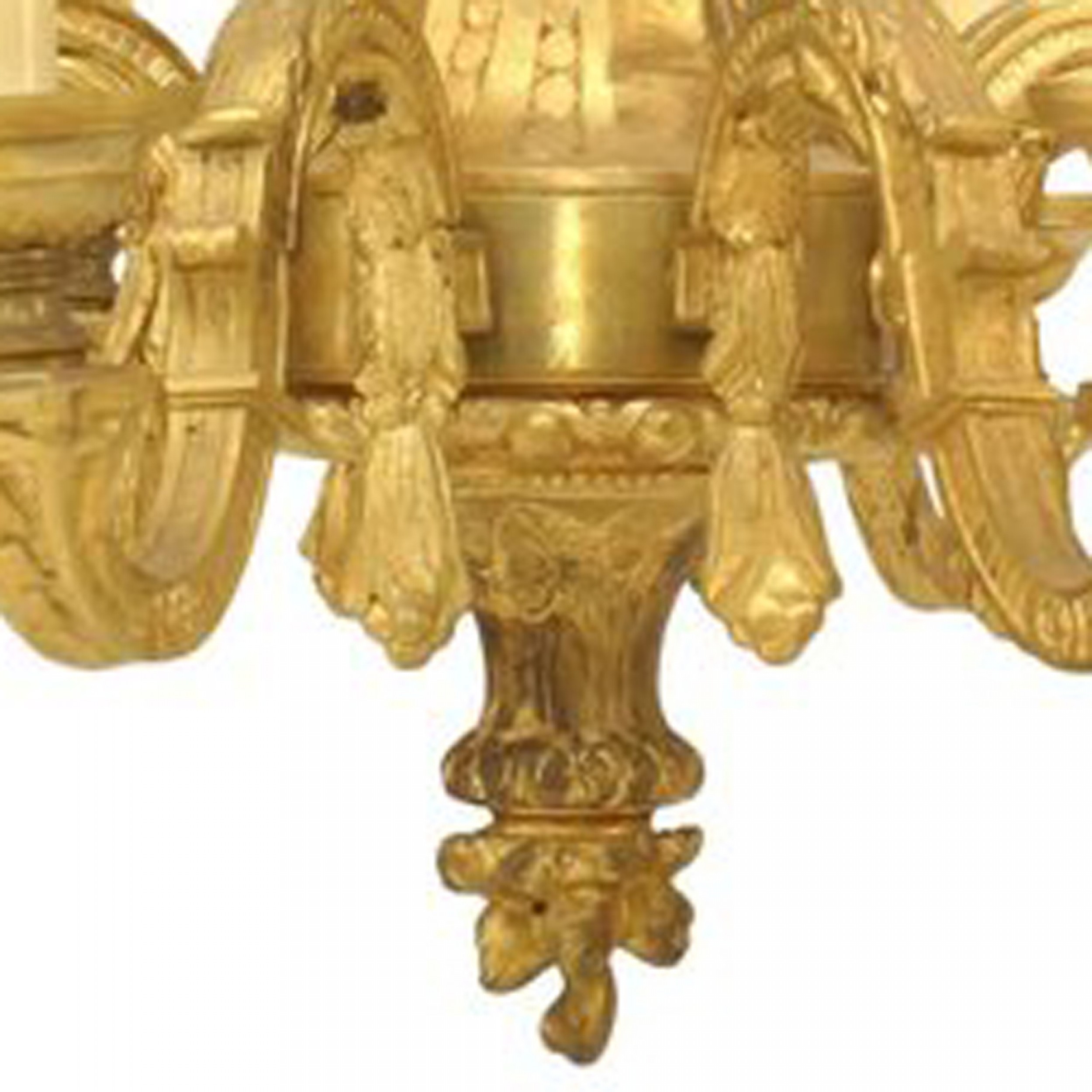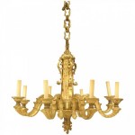 French Louis XVI-style (19th Century) gilt bronze chandelier with 8 scroll form arms emanating from a solid center shaft with a tapered finial bottom (with original chain)