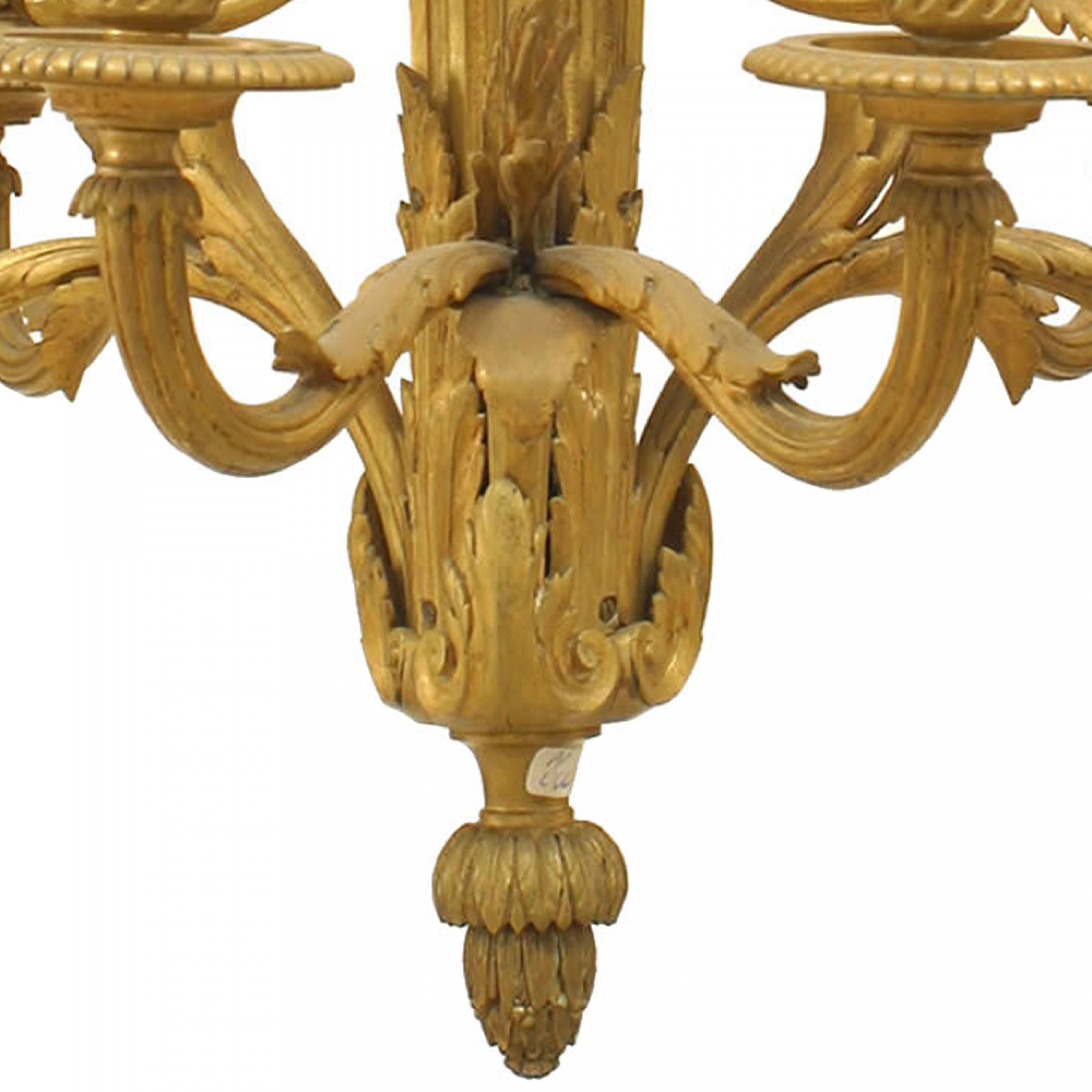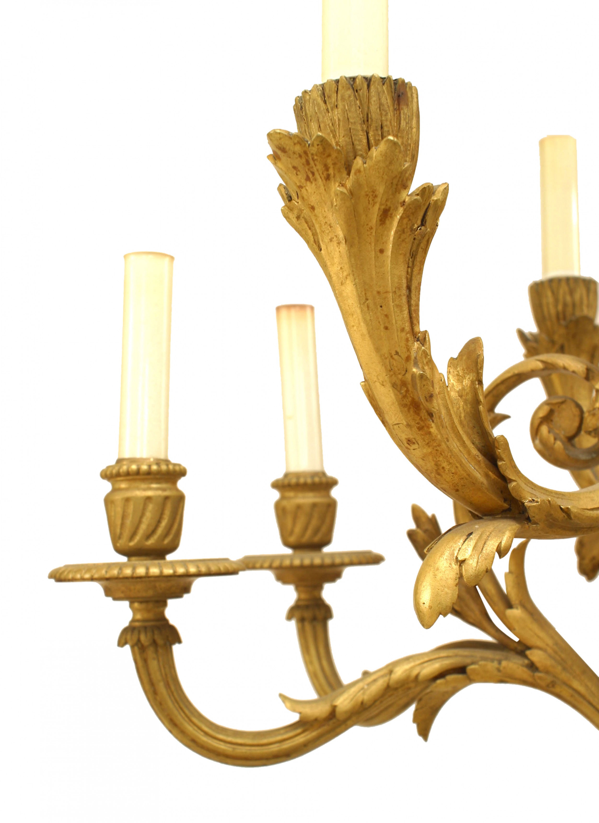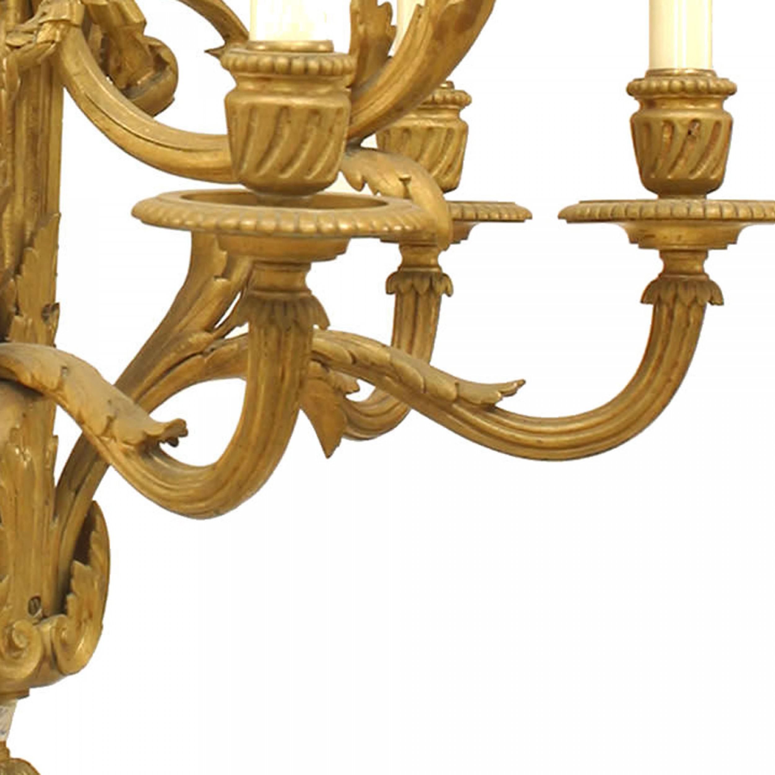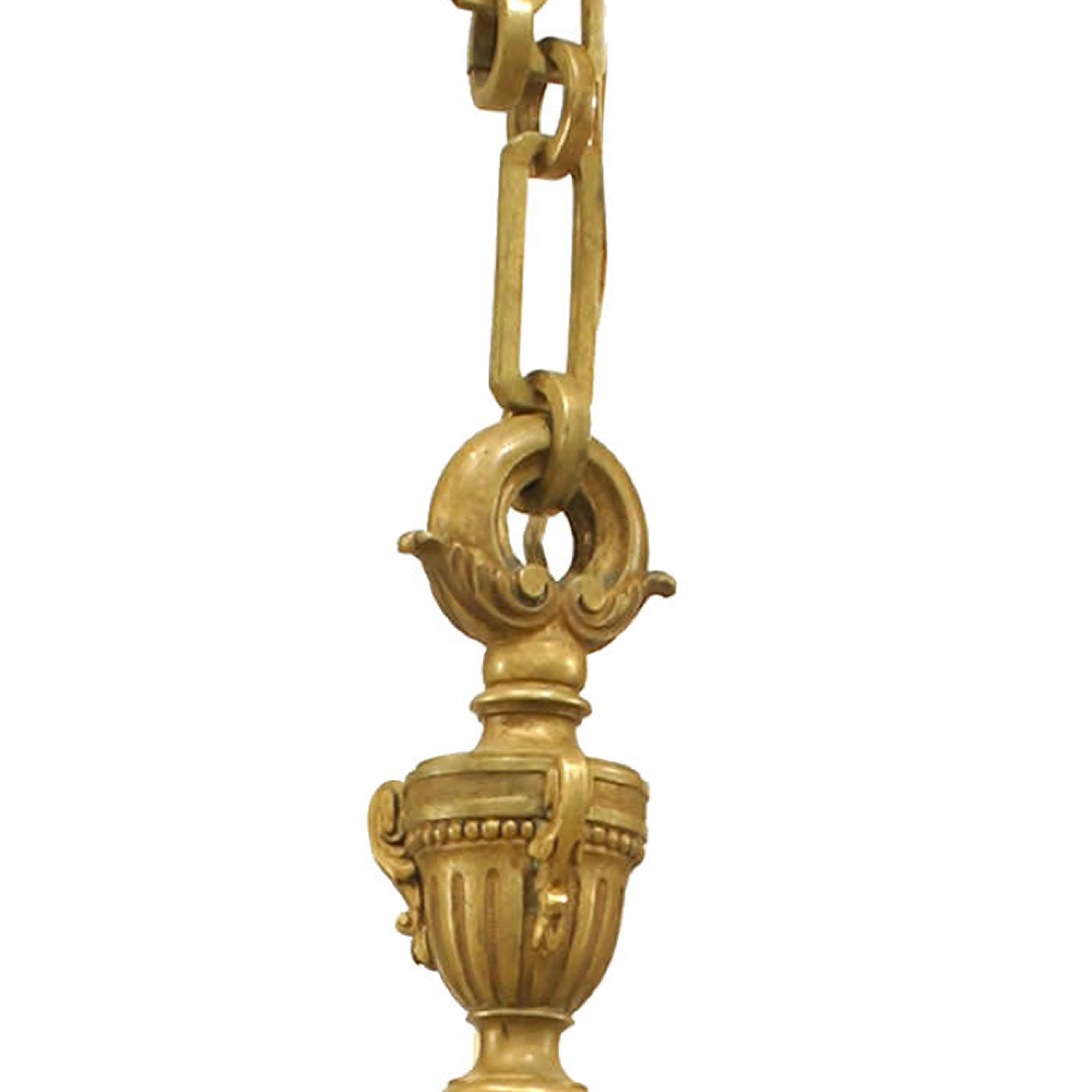 French Louis XVI-style (19th Century) gilt bronze chandelier with a 3 arm upper & 6 arm lower tiers emanating from a fluted center shaft with an urn top and acorn finial bottom.