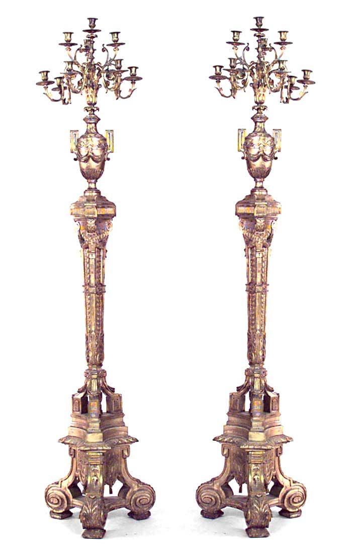 Pair of French Louis XVI-style (19th Century) gilt wood floor torchiere with urn design and 9 bronze arms (PRICED AS PAIR).