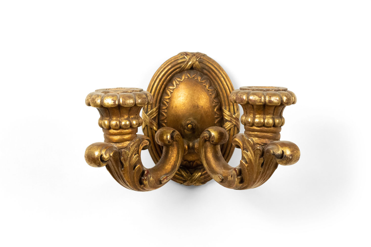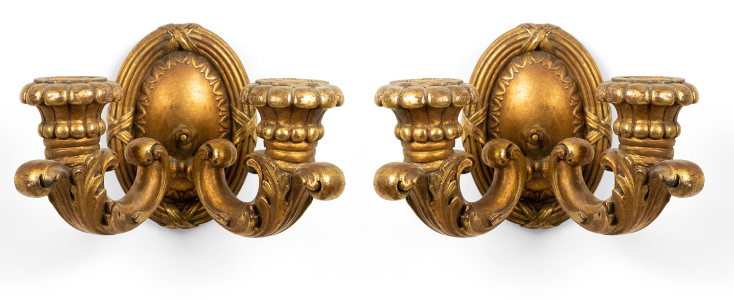 PAIR of French Louis XVI-style (19/20th Century) giltwood wall sconces with two arms and fluted oval backs. (PRICED AS PAIR).