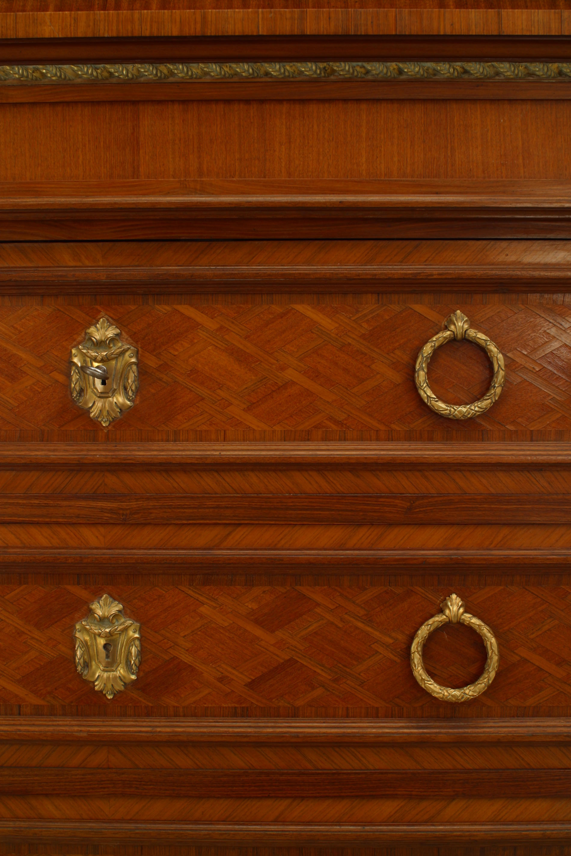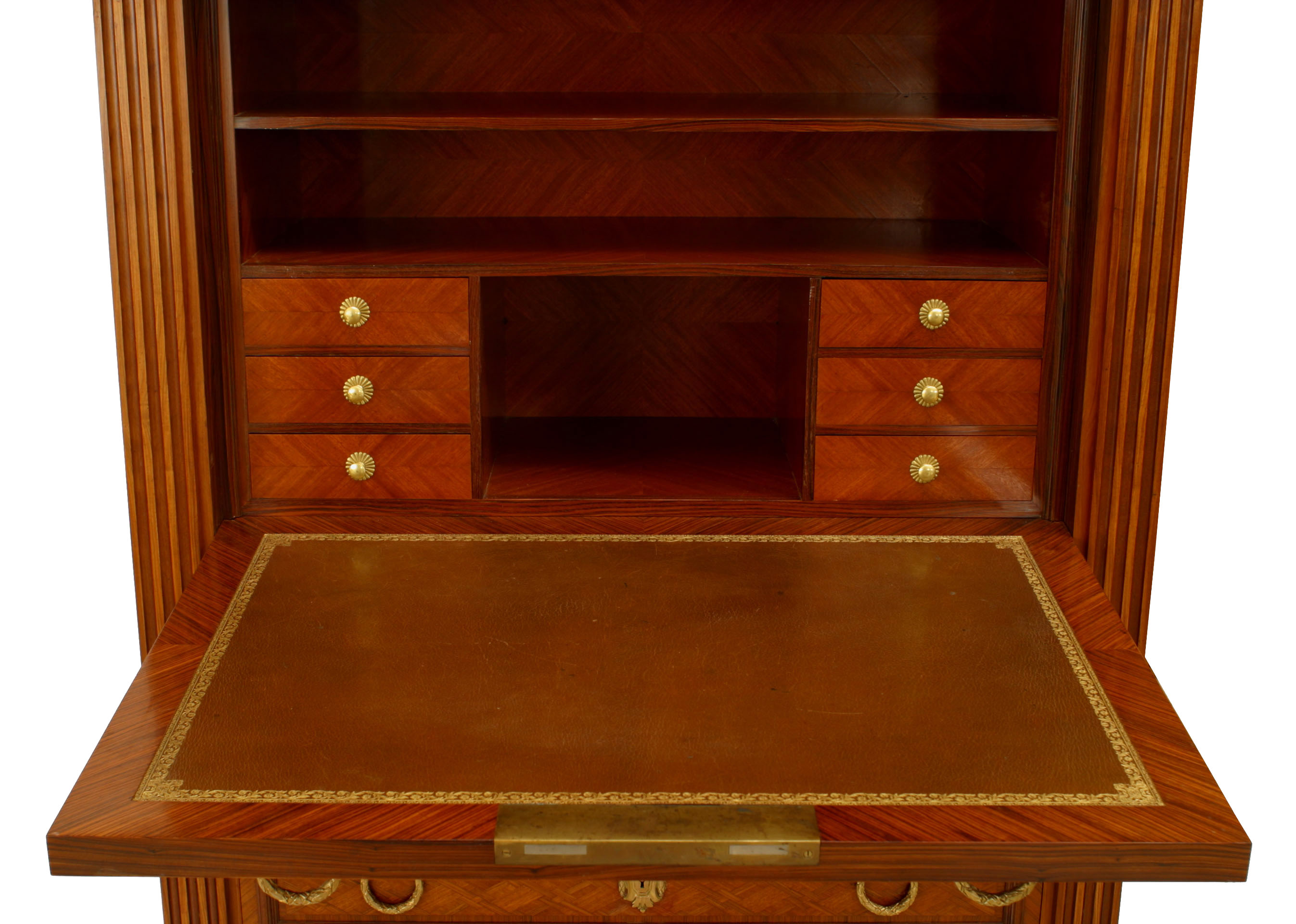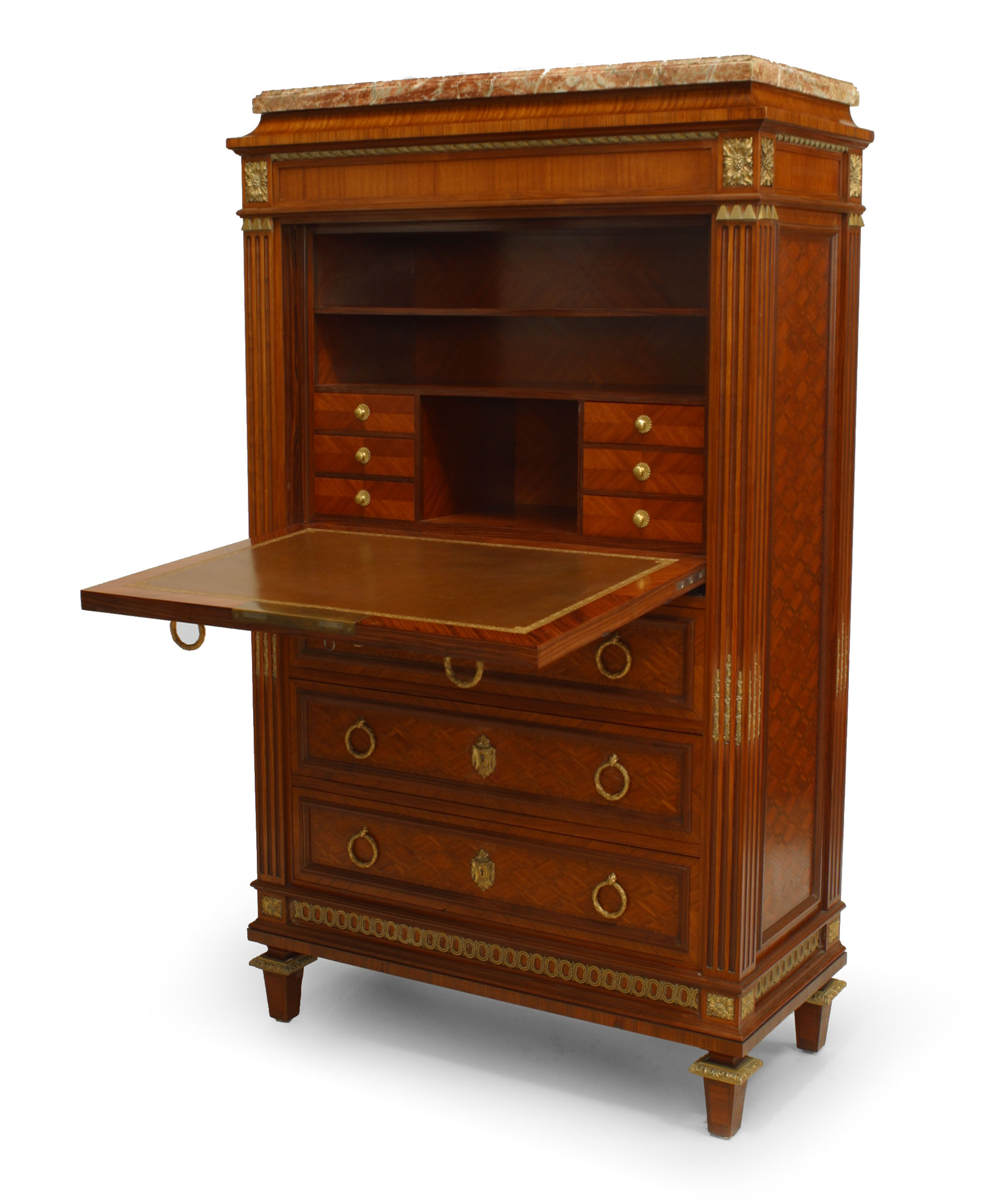 French Louis XVI-style (19th Century) parquetry inlaid drop front secretary abattant with gilt bronze trim and ring hands with 4 drawers below a fitted interior with a leather writing surface.