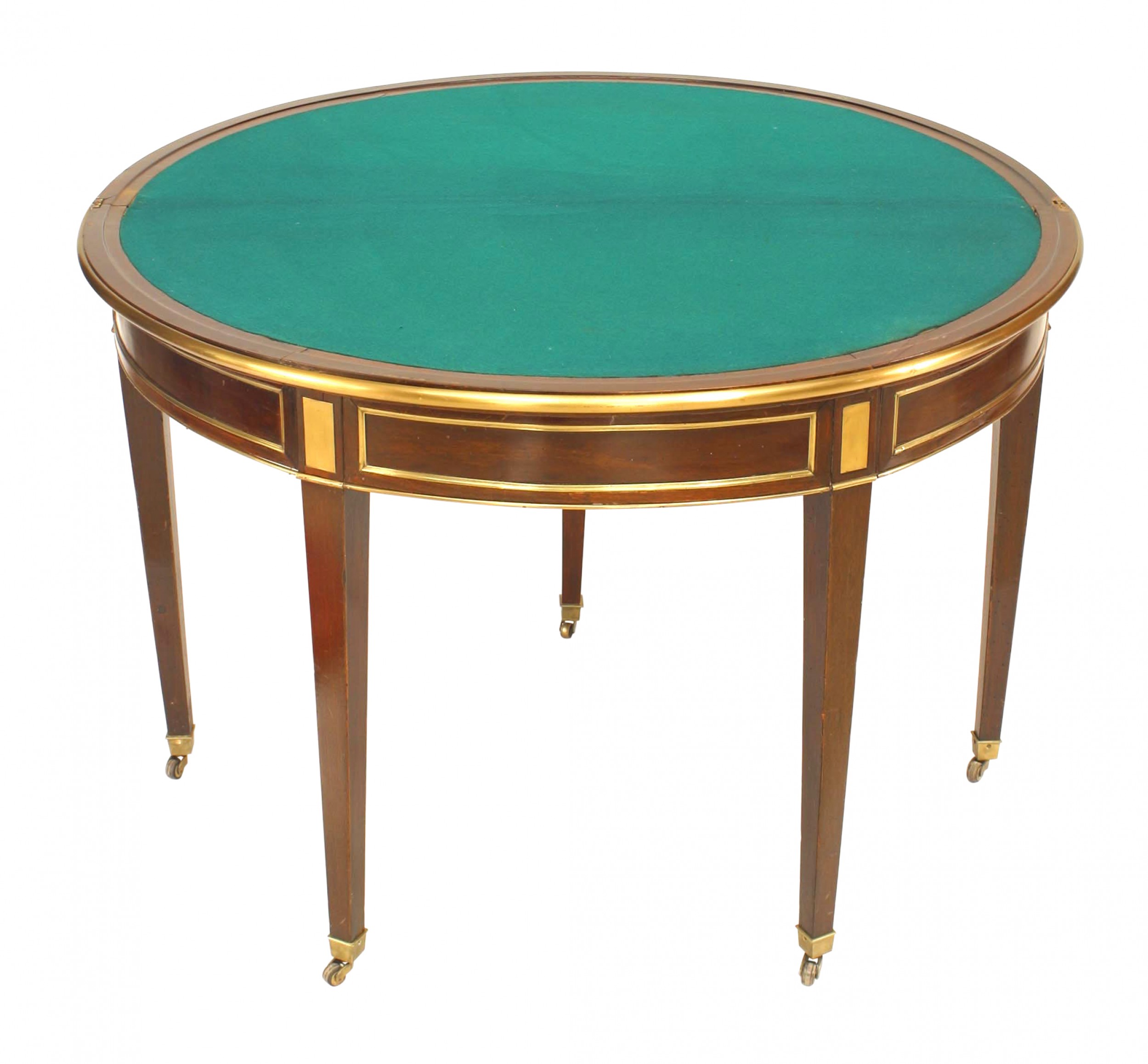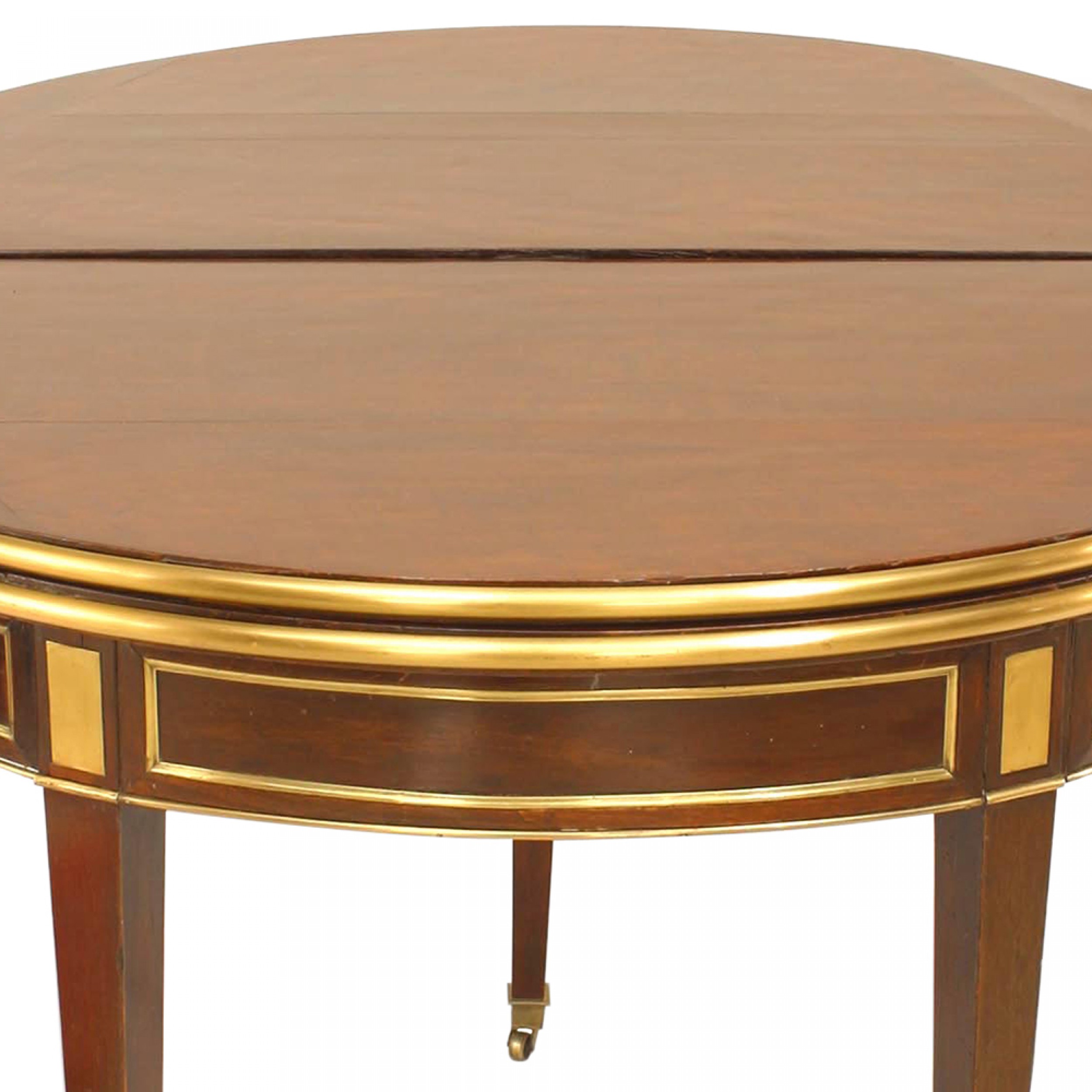 French Louis XVI-style (19th Century) demilune shaped double flip top console/game table with brass trim.