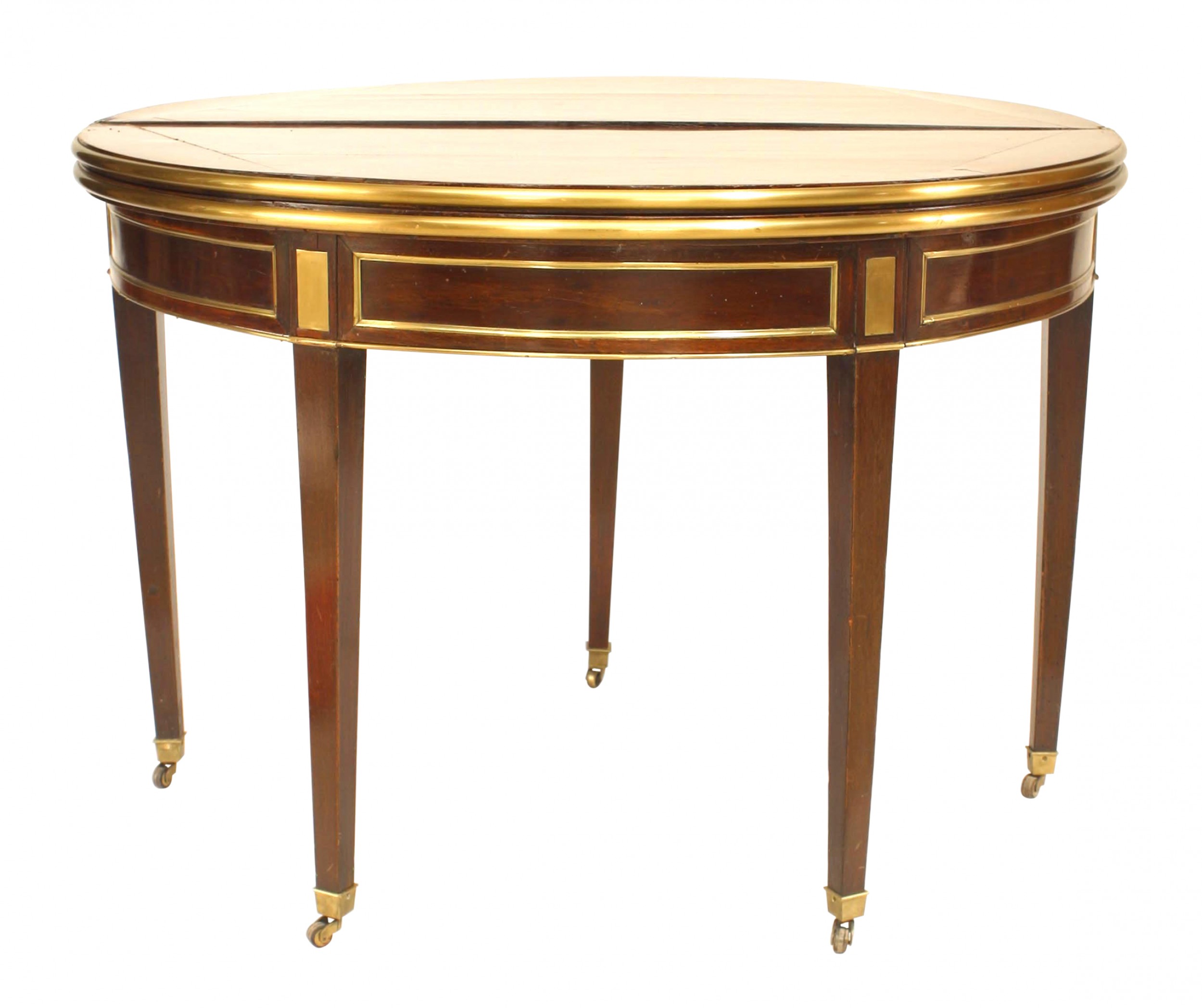 French Louis XVI-style (19th Century) demilune shaped double flip top console/game table with brass trim