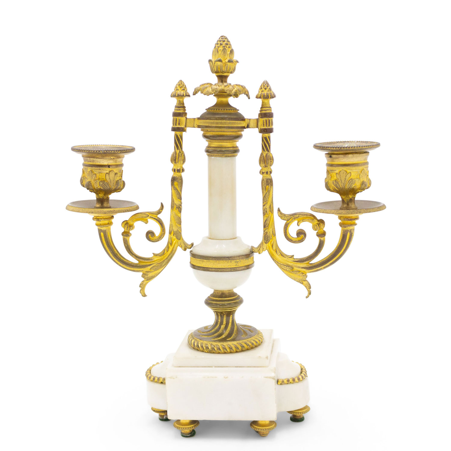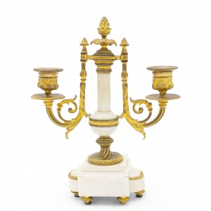 PAIR of French Louis XVI-style (19th Century) white marble and bronze 2 arm candelabras (PRICED AS PAIR).
