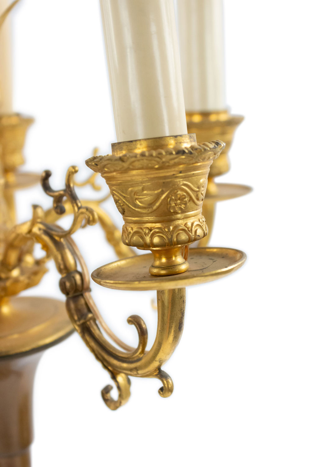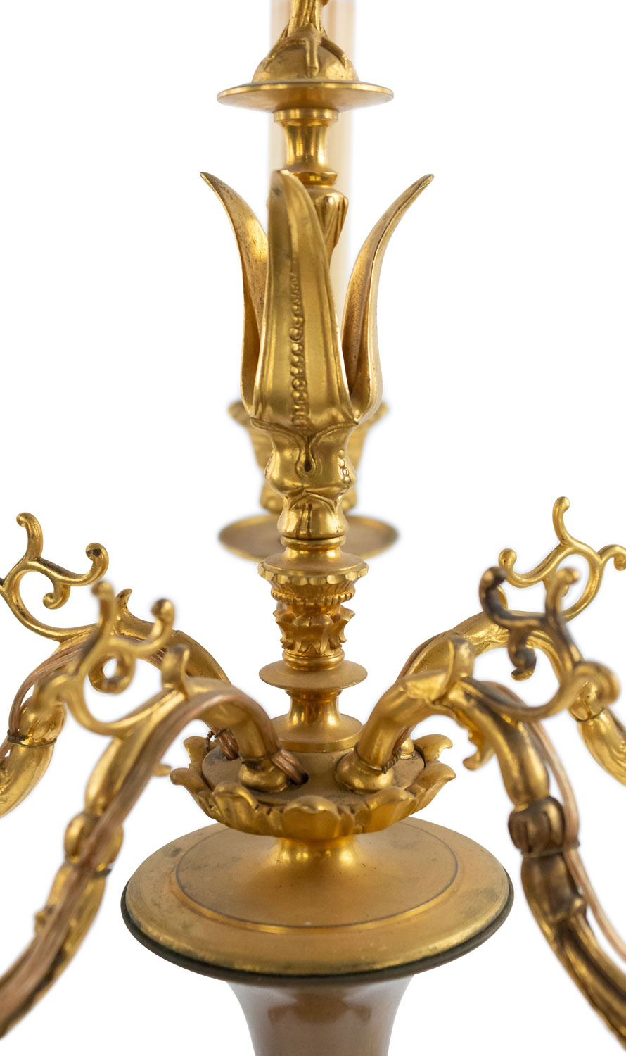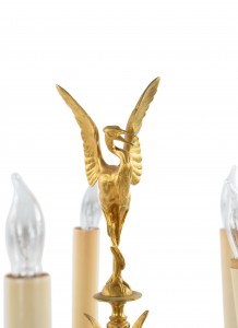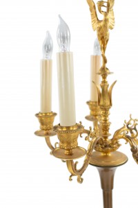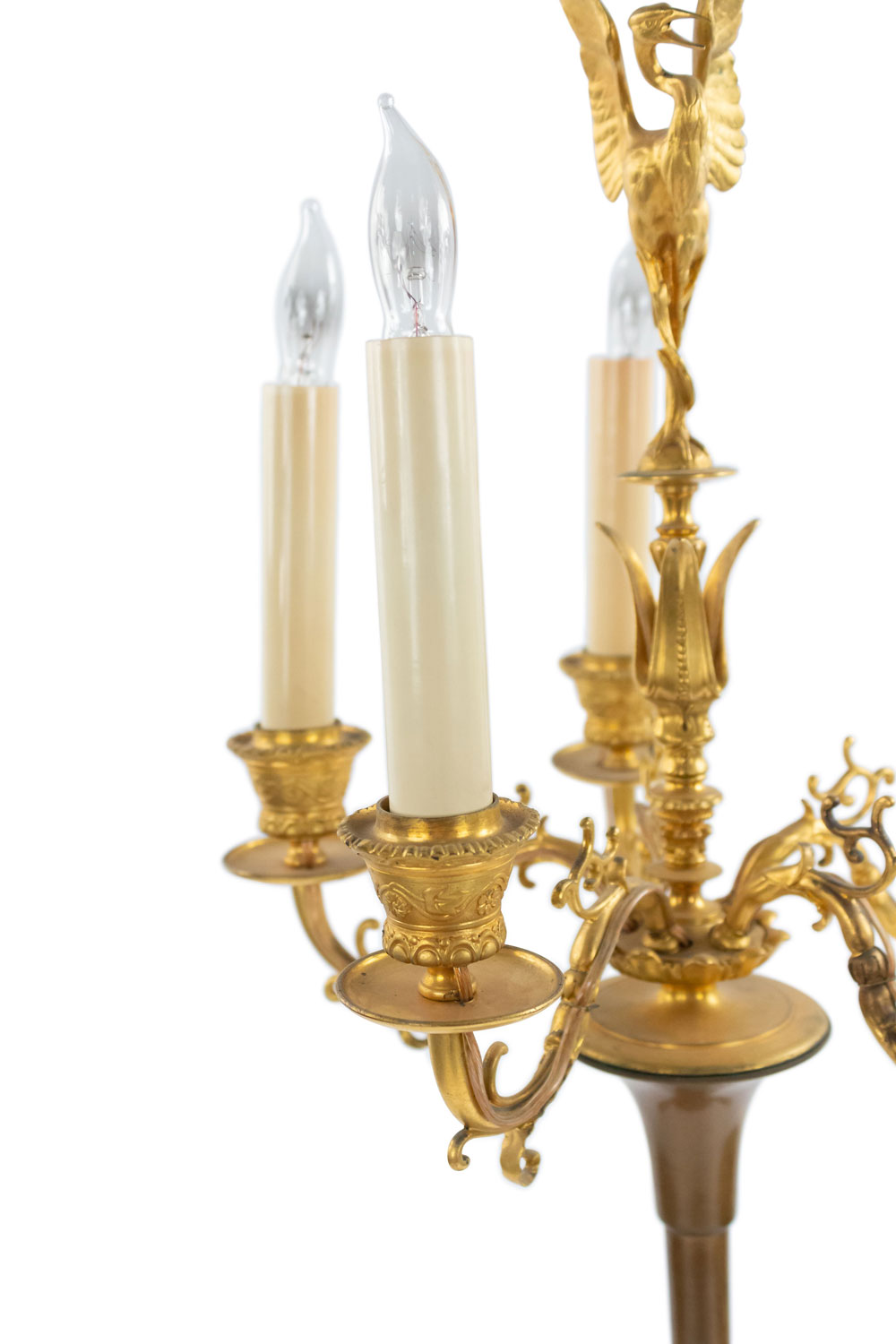 PAIR of French Louis XVI-style ormolu & patinated bronze five branch candelabras with heron finial above a rouge marble base (sgnd H.CAHIEUX and F.BARBEDIENNE, 1880) (PRICED AS PAIR)