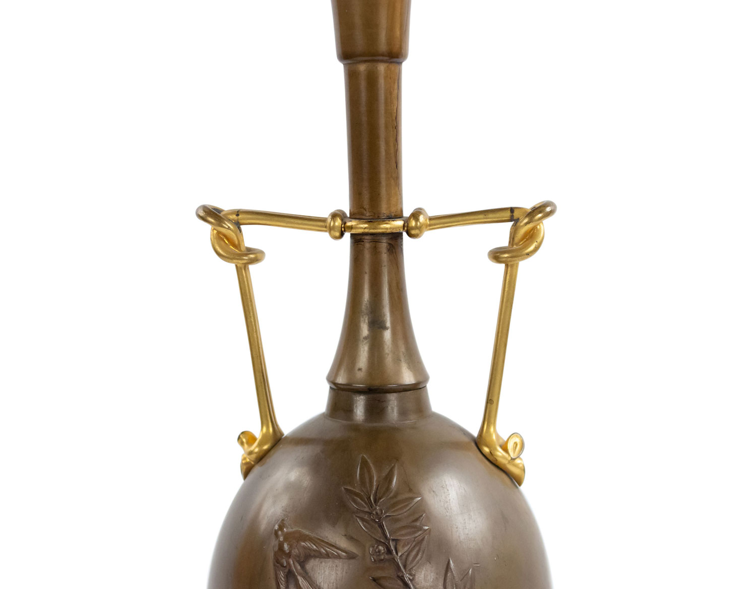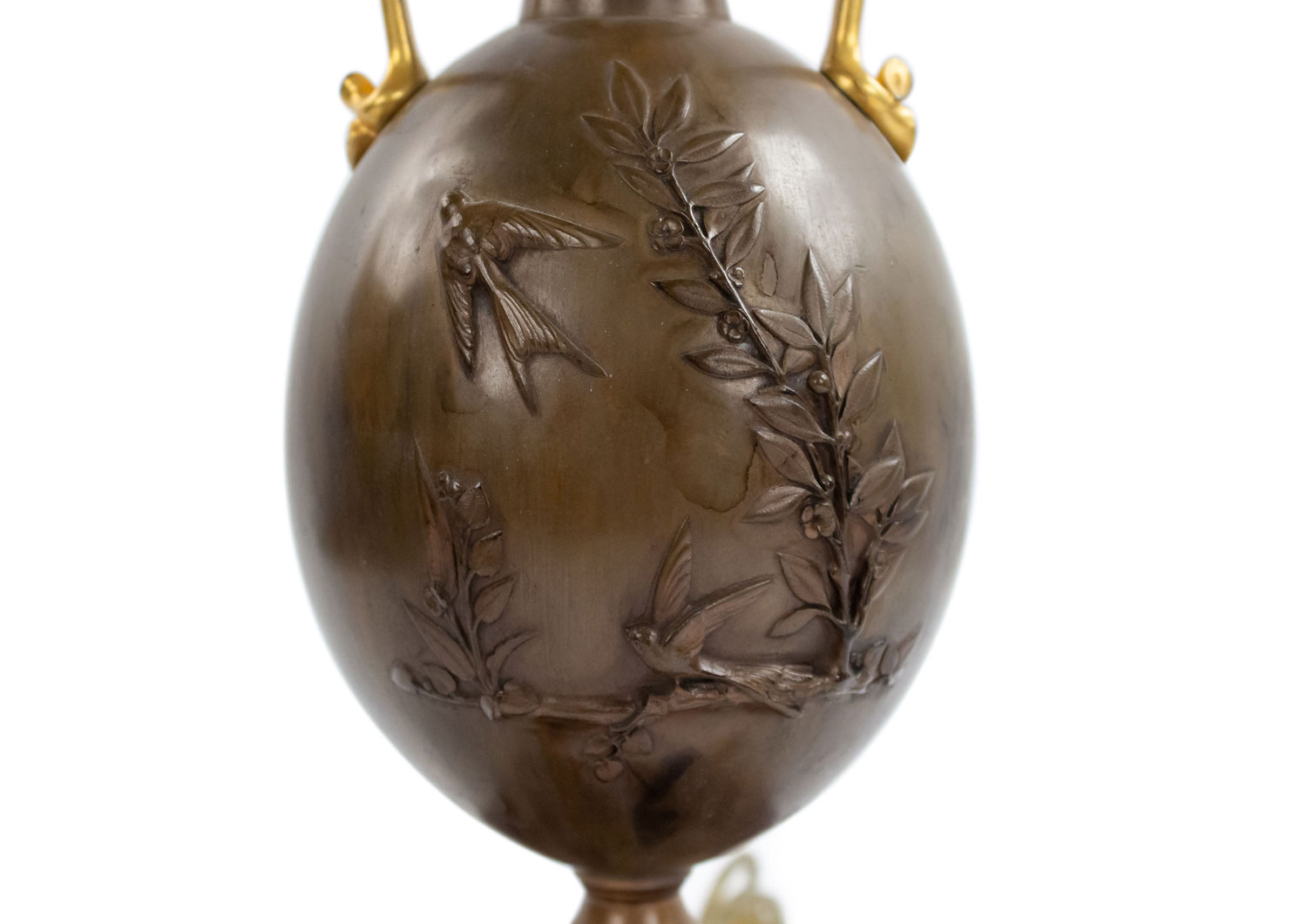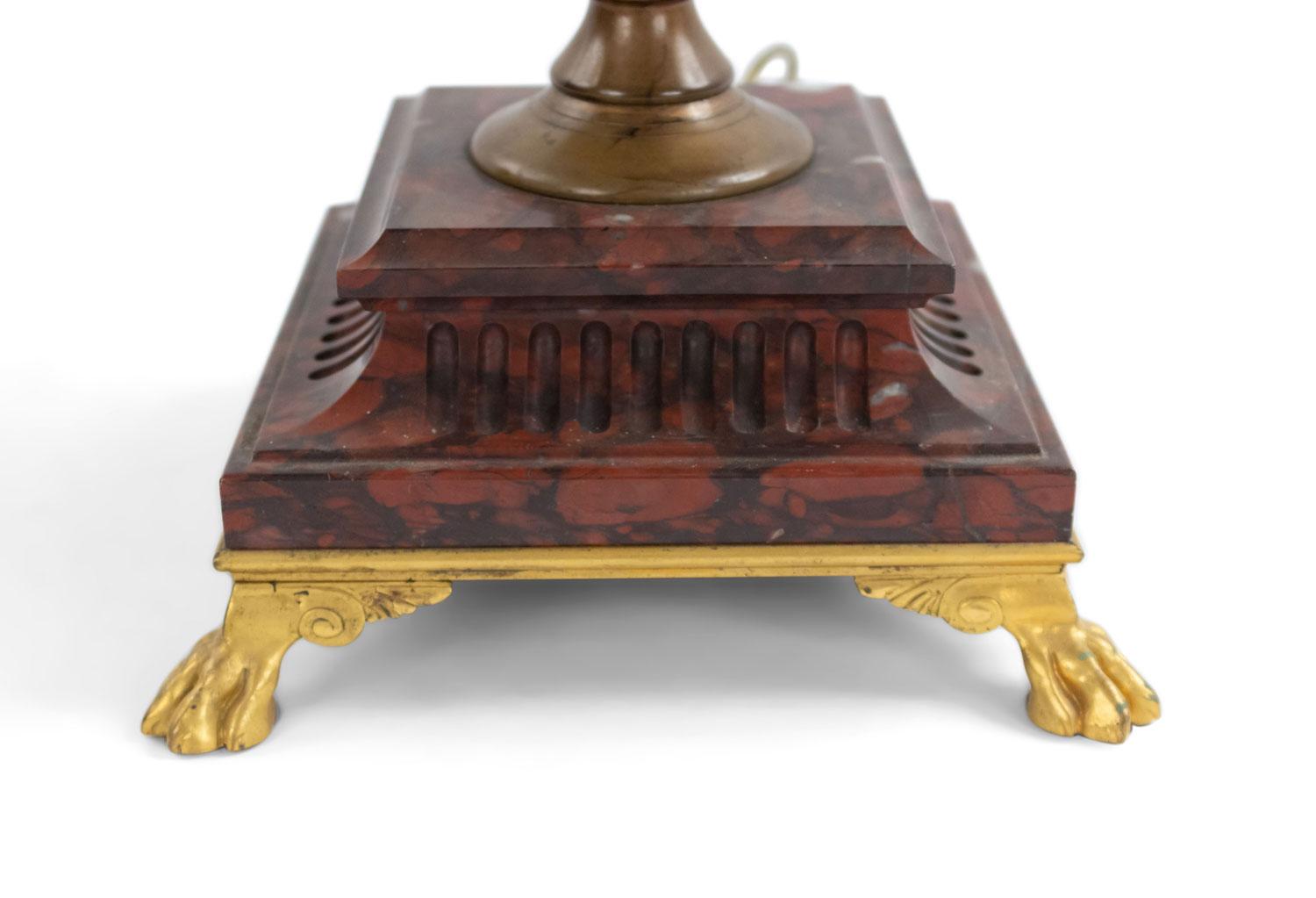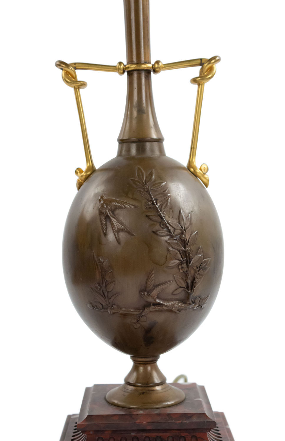 PAIR of French Louis XVI-style ormolu & patinated bronze five branch candelabras with heron finial above a rouge marble base (sgnd H.CAHIEUX and F.BARBEDIENNE, 1880) (PRICED AS PAIR)