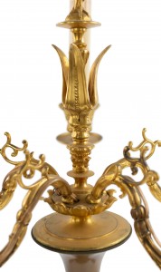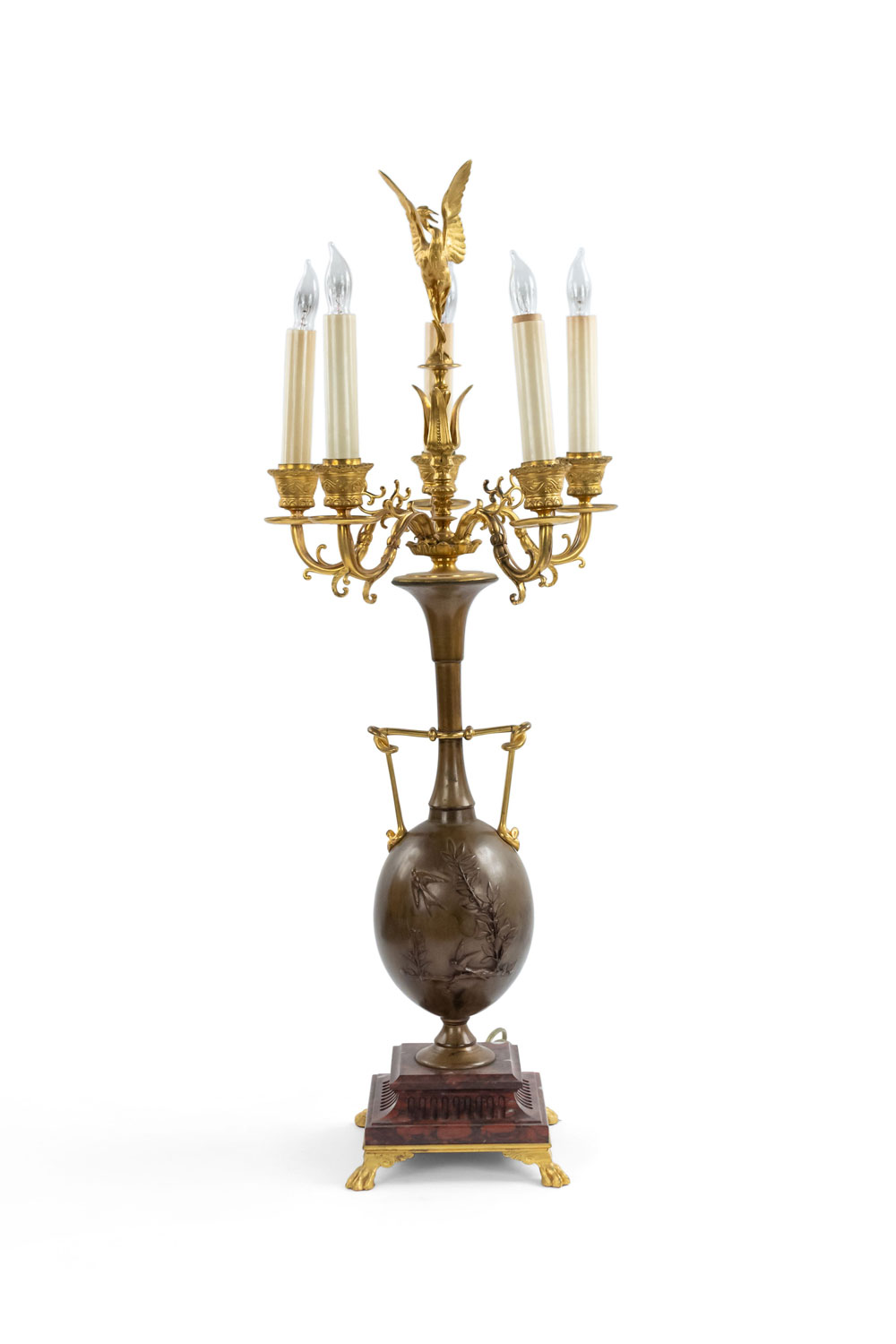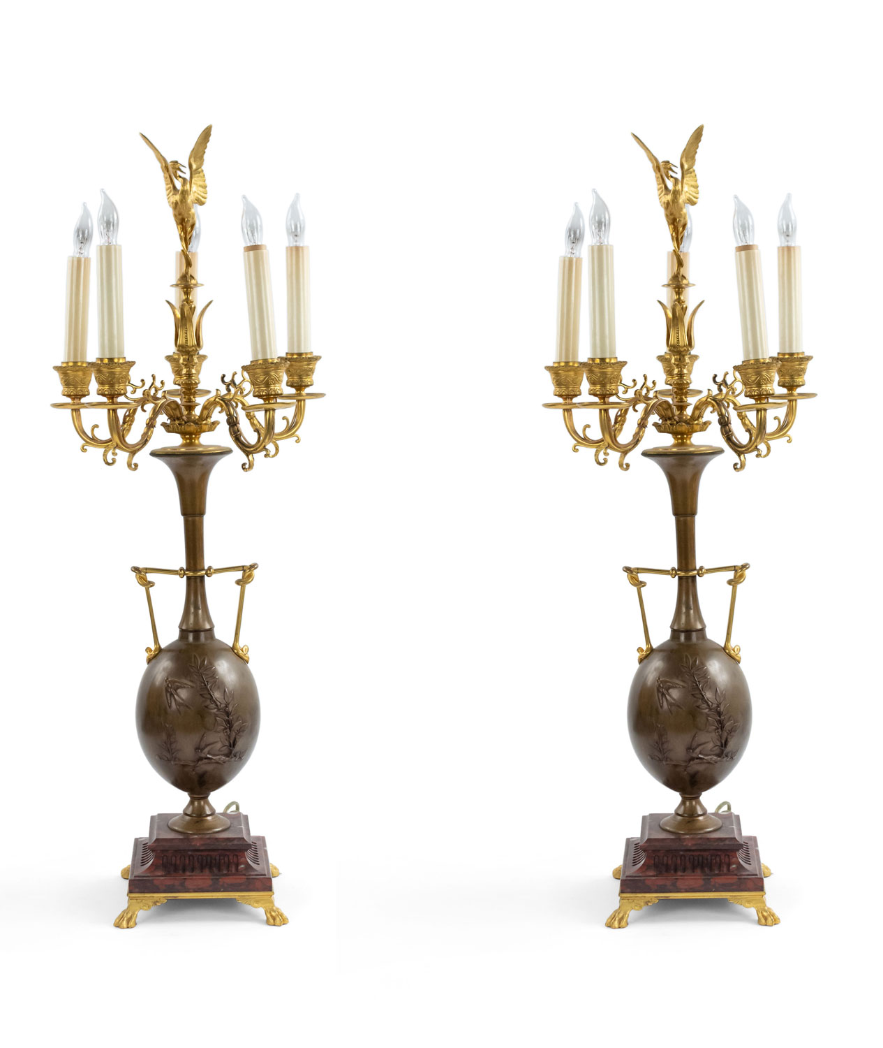 PAIR of French Louis XVI-style ormolu & patinated bronze five branch candelabras with heron finial above a rouge marble base (sgnd H.CAHIEUX and F.BARBEDIENNE, 1880) (PRICED AS PAIR).