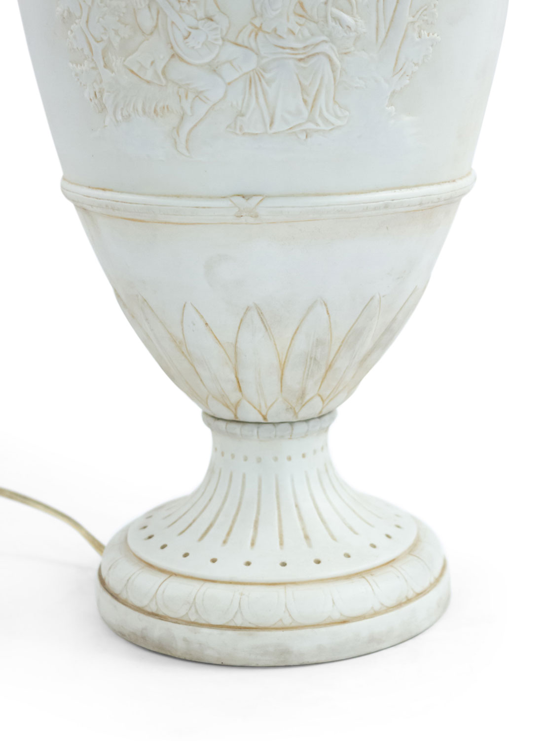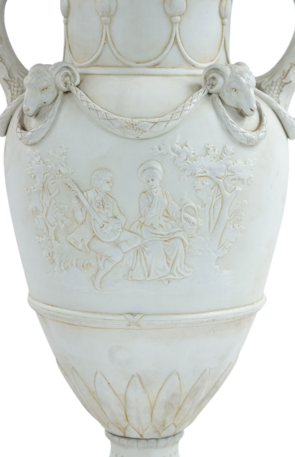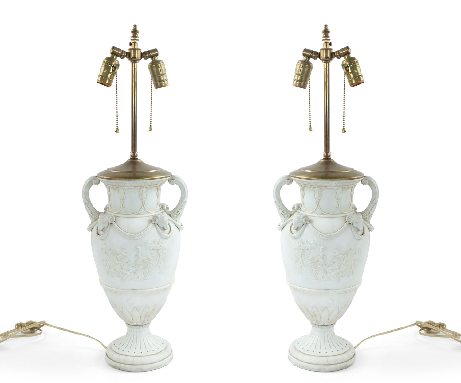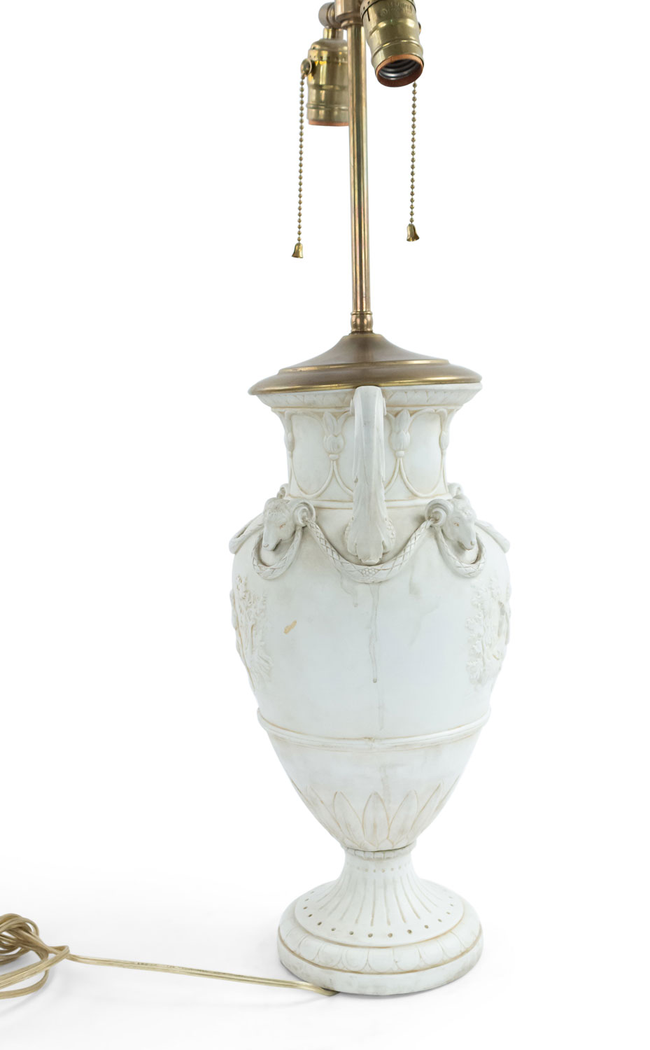PAIR of French Louis XVI-style (19/20th Century) white parian porcelain urn shaped table lamps with ram heads and handles (PRICED AS PAIR).