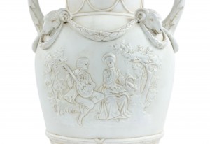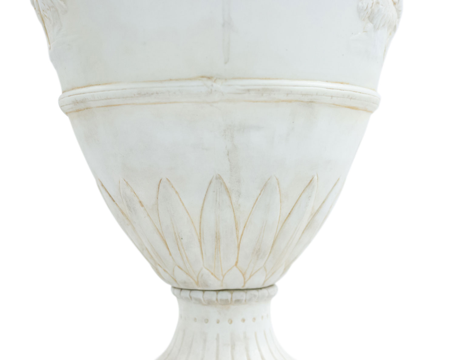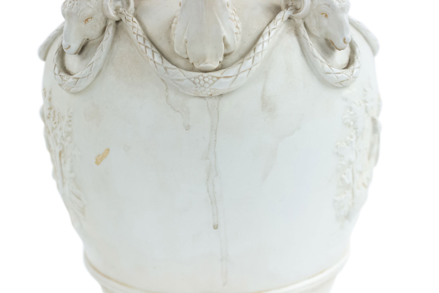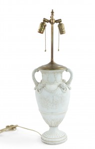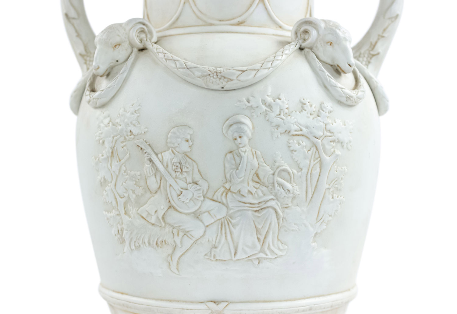 PAIR of French Louis XVI-style (19/20th Century) white parian porcelain urn shaped table lamps with ram heads and handles (PRICED AS PAIR).