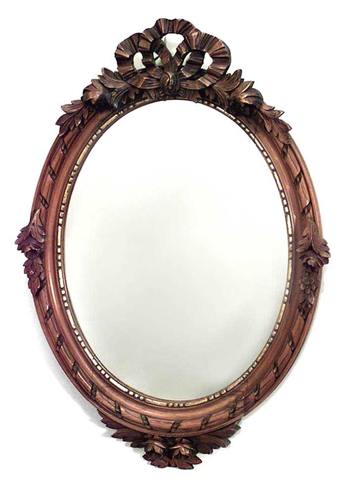 French Louis XVI-style (19/20th Century) carved walnut and gilt trimmed wall mirror with bow knot top..