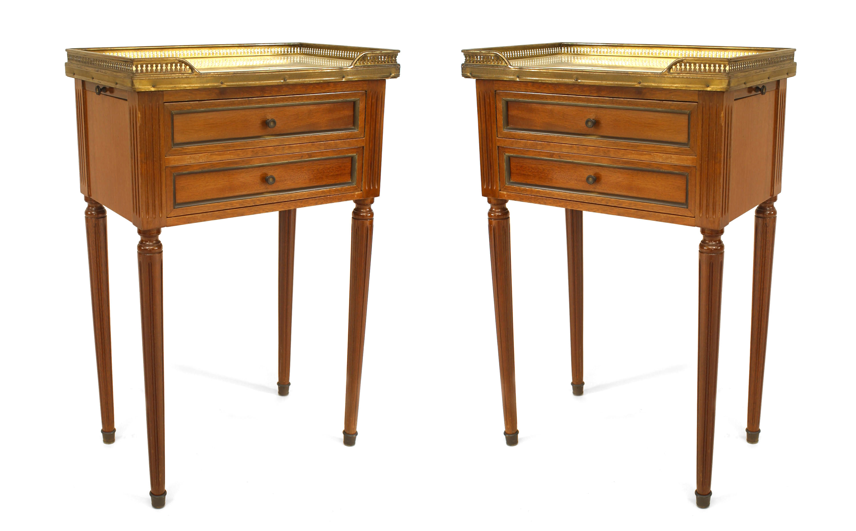 PAIR of French Louis XVI-style walnut low end tables with brass trim and 2 drawers with a white marble top and filigree gallery. (PRICED AS PAIR).
