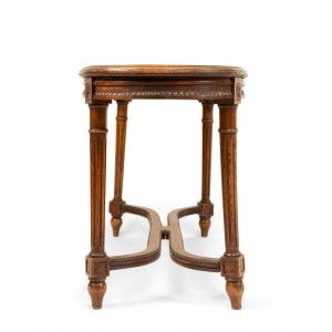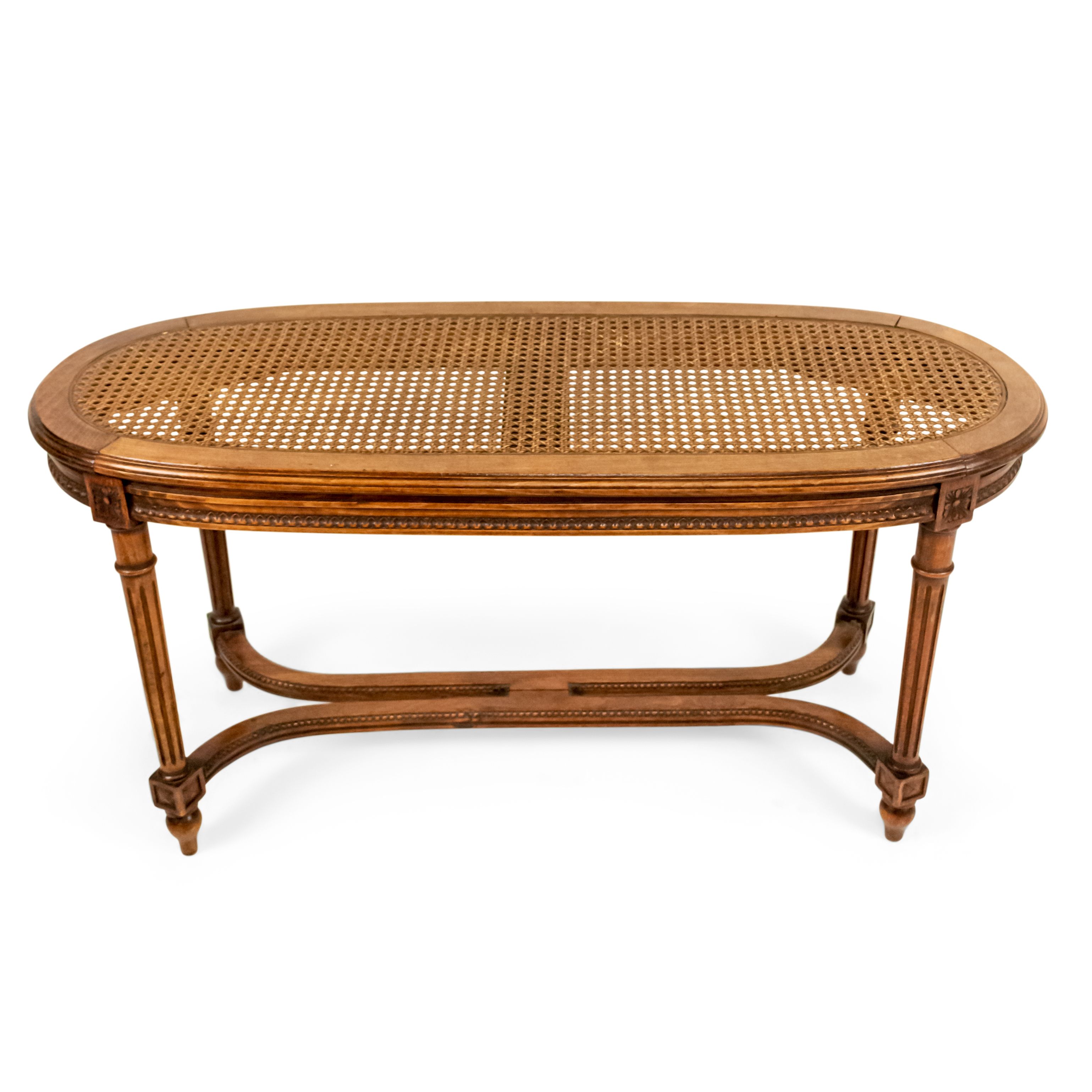 French Louis XVI style (19th Century) walnut oval shaped bench with double stretcher and inset cane seat..