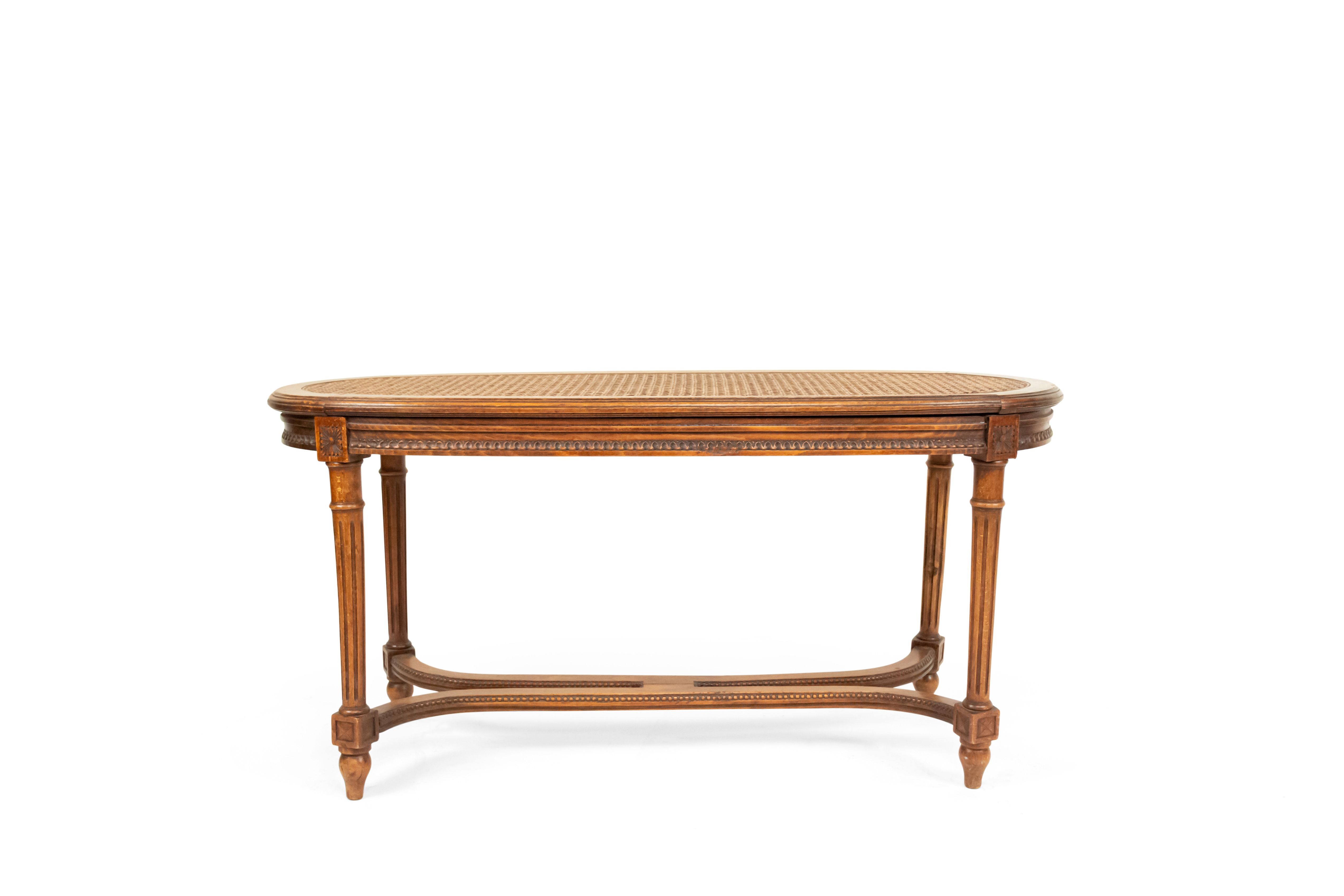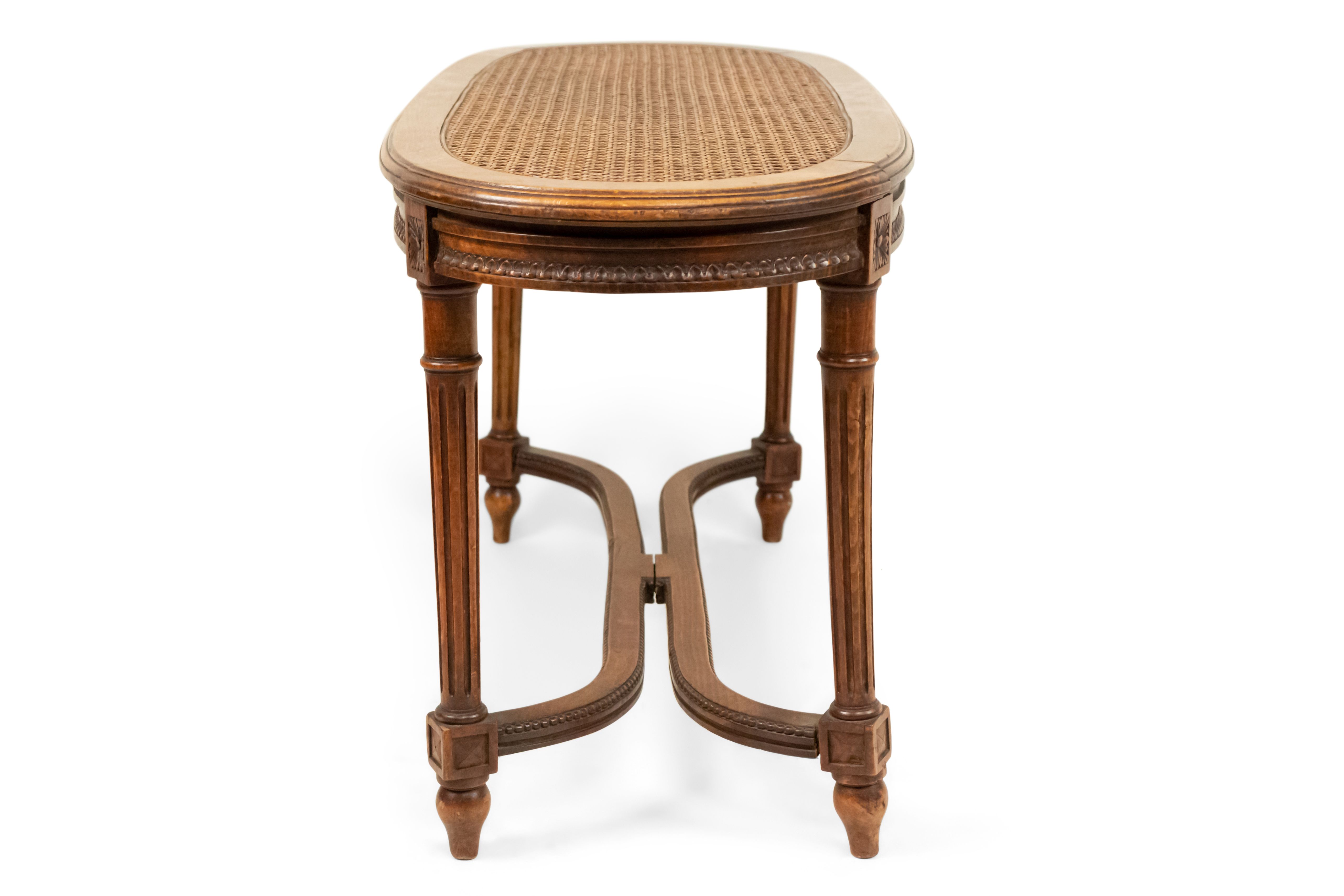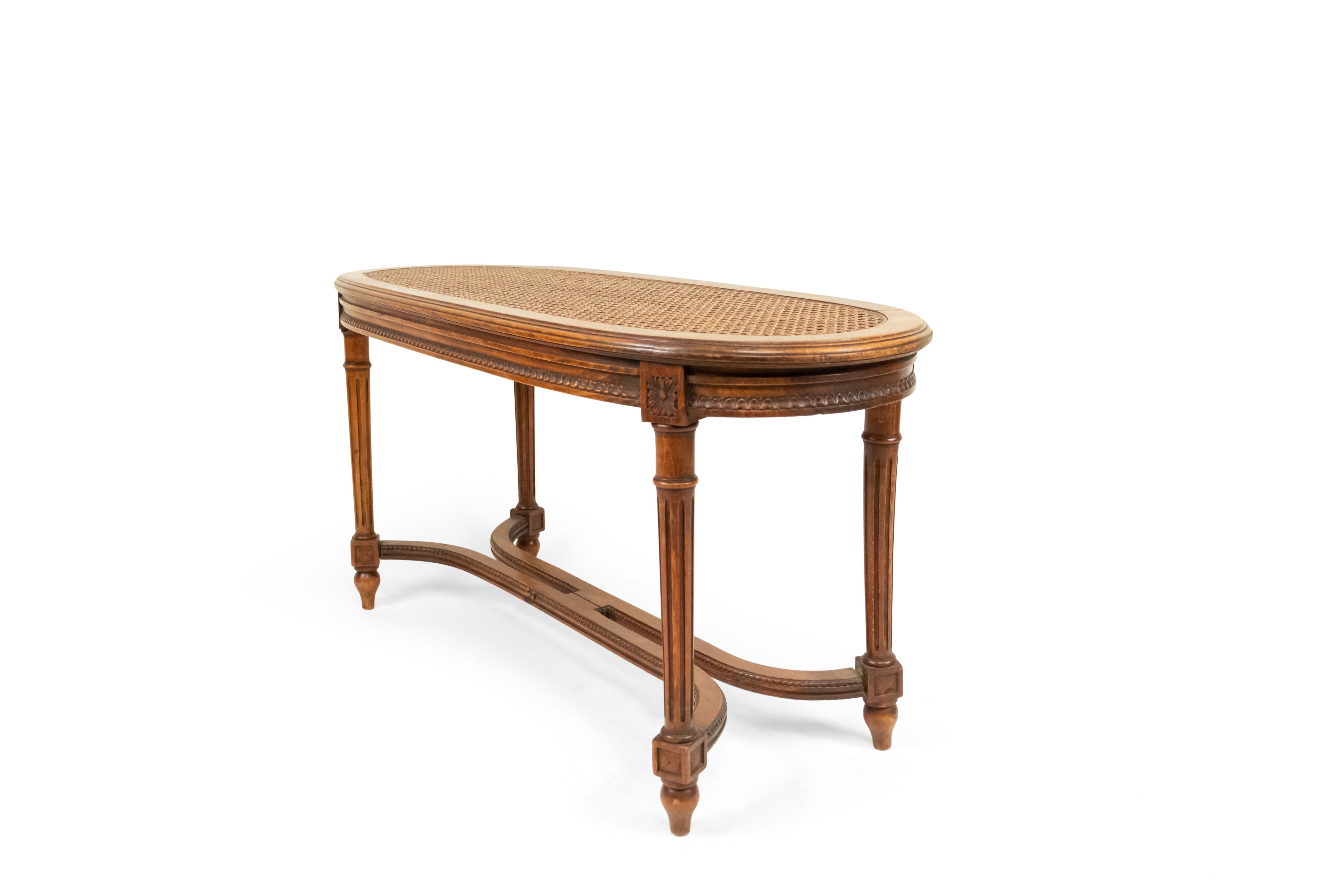 French Louis XVI style (19th Century) walnut oval shaped bench with double stretcher and inset cane seat.