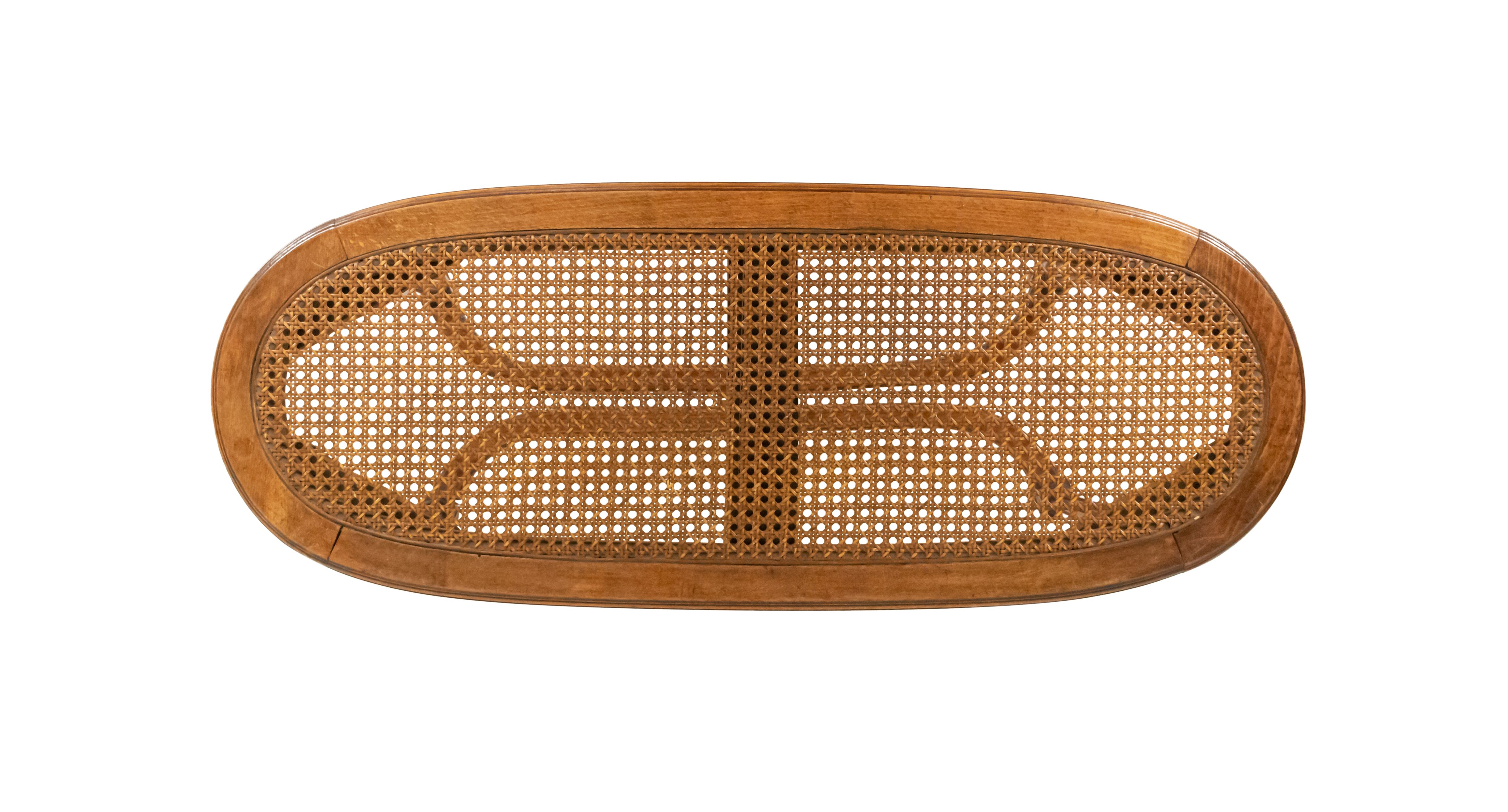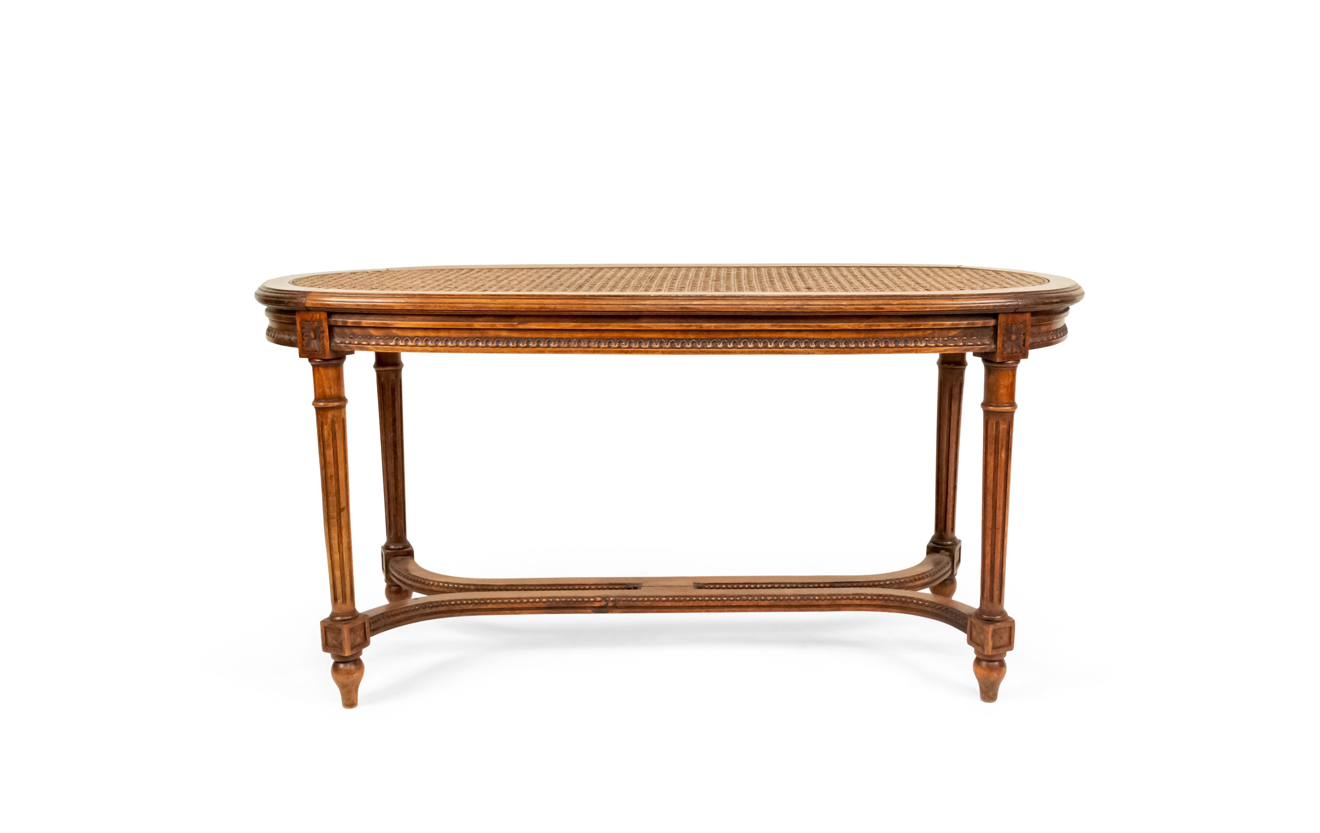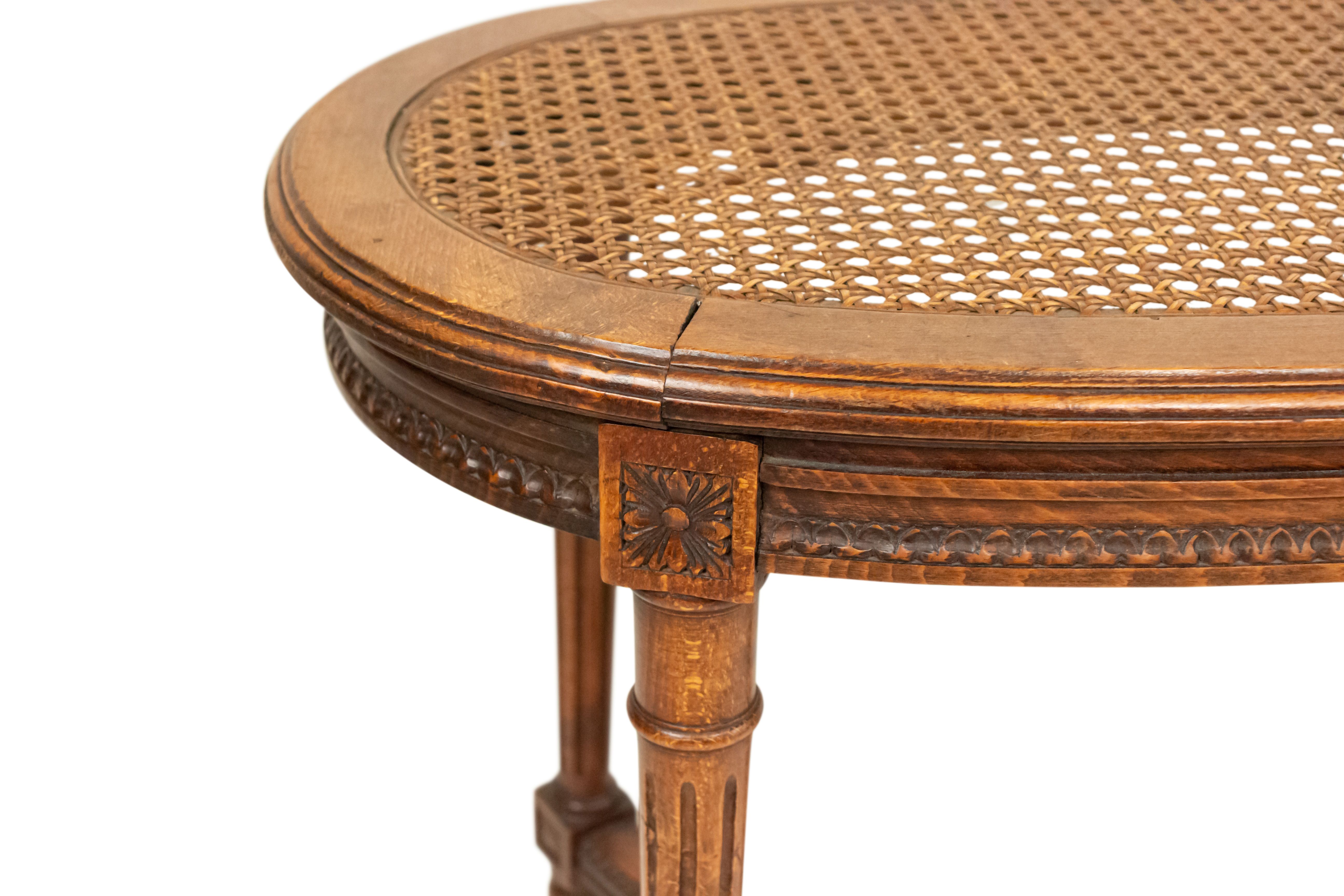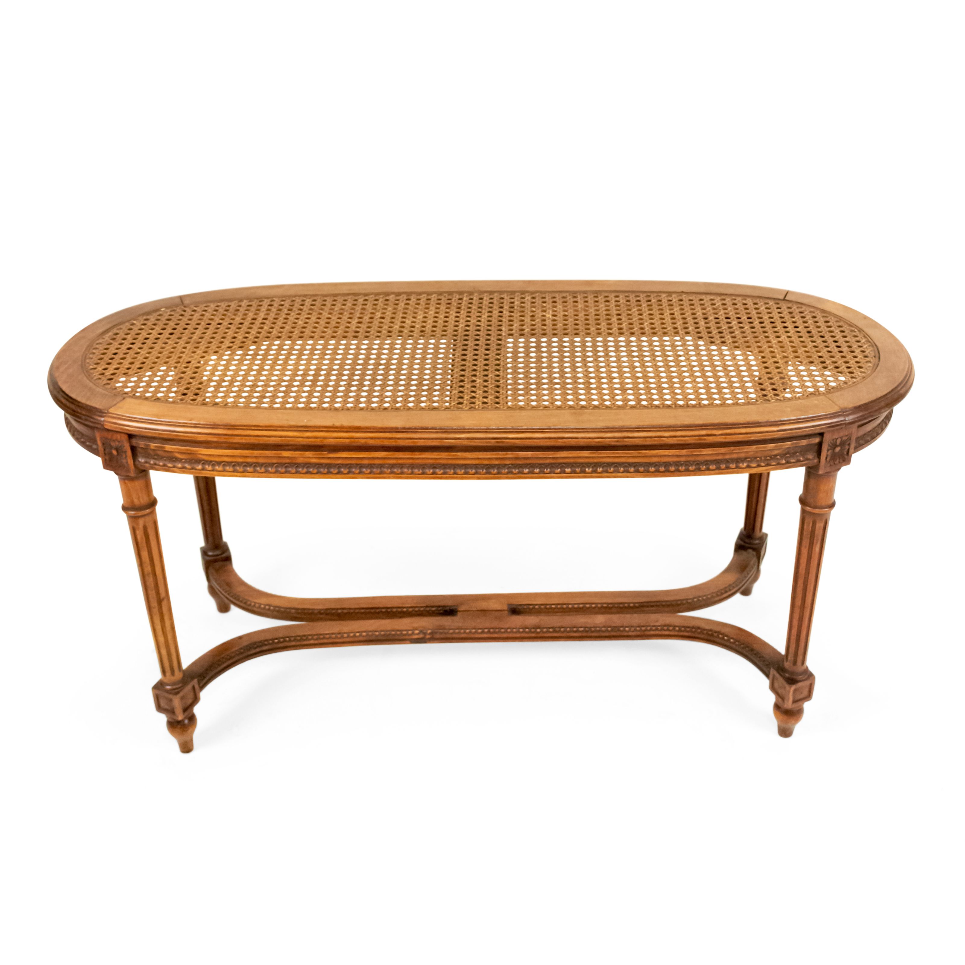 French Louis XVI style (19th Century) walnut oval shaped bench with double stretcher and inset cane seat.