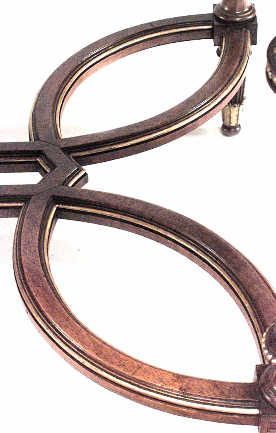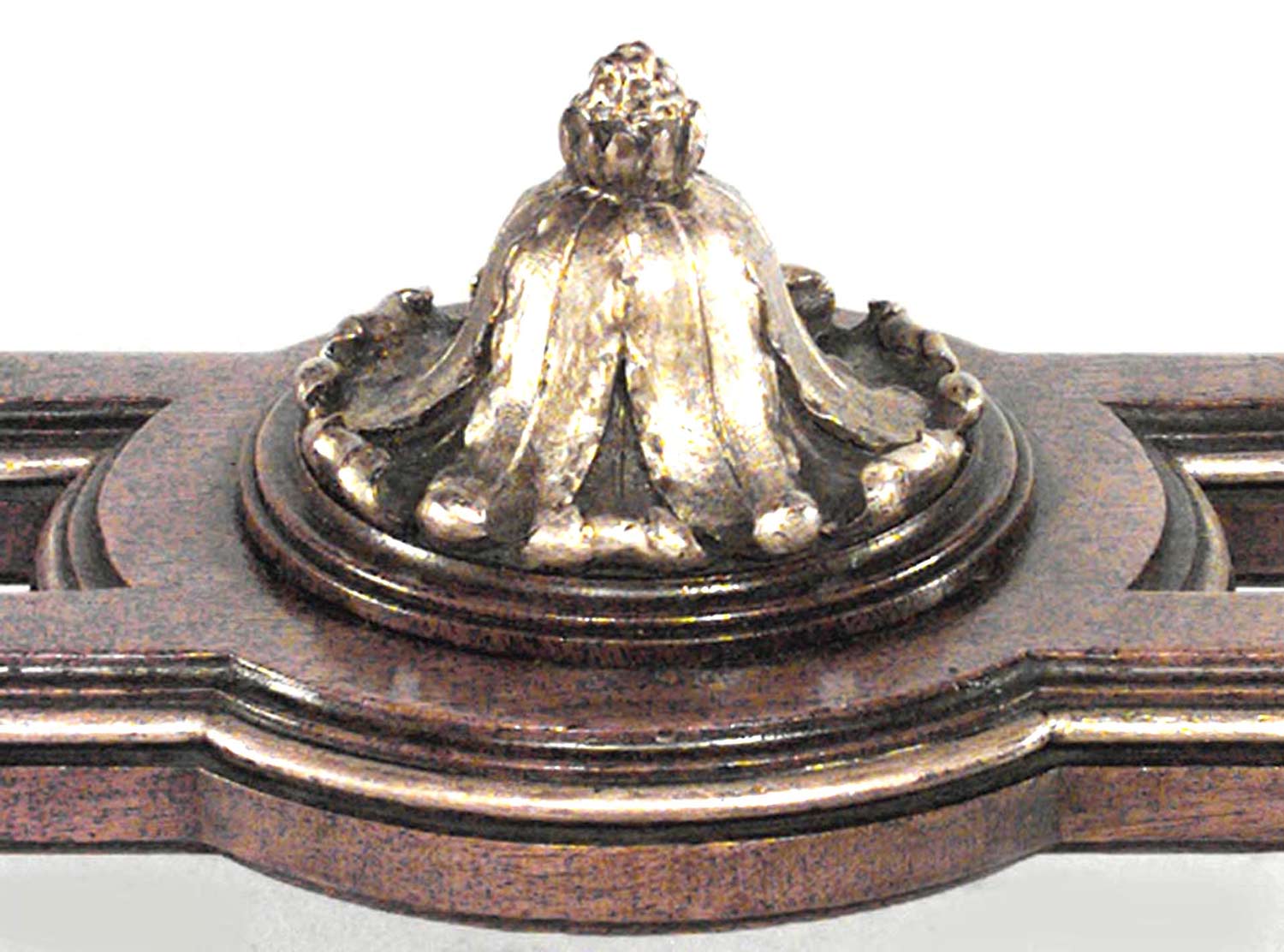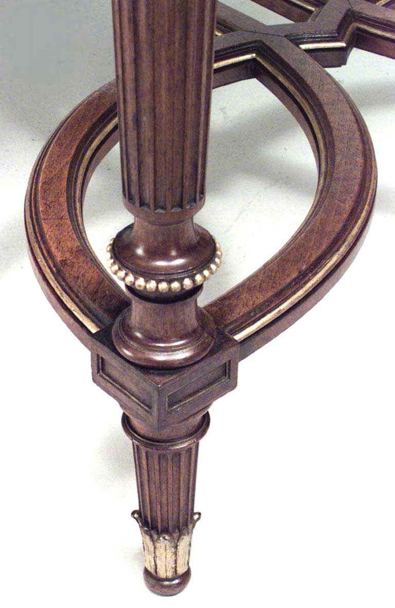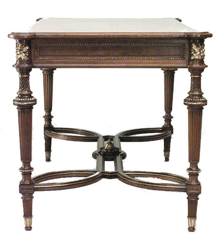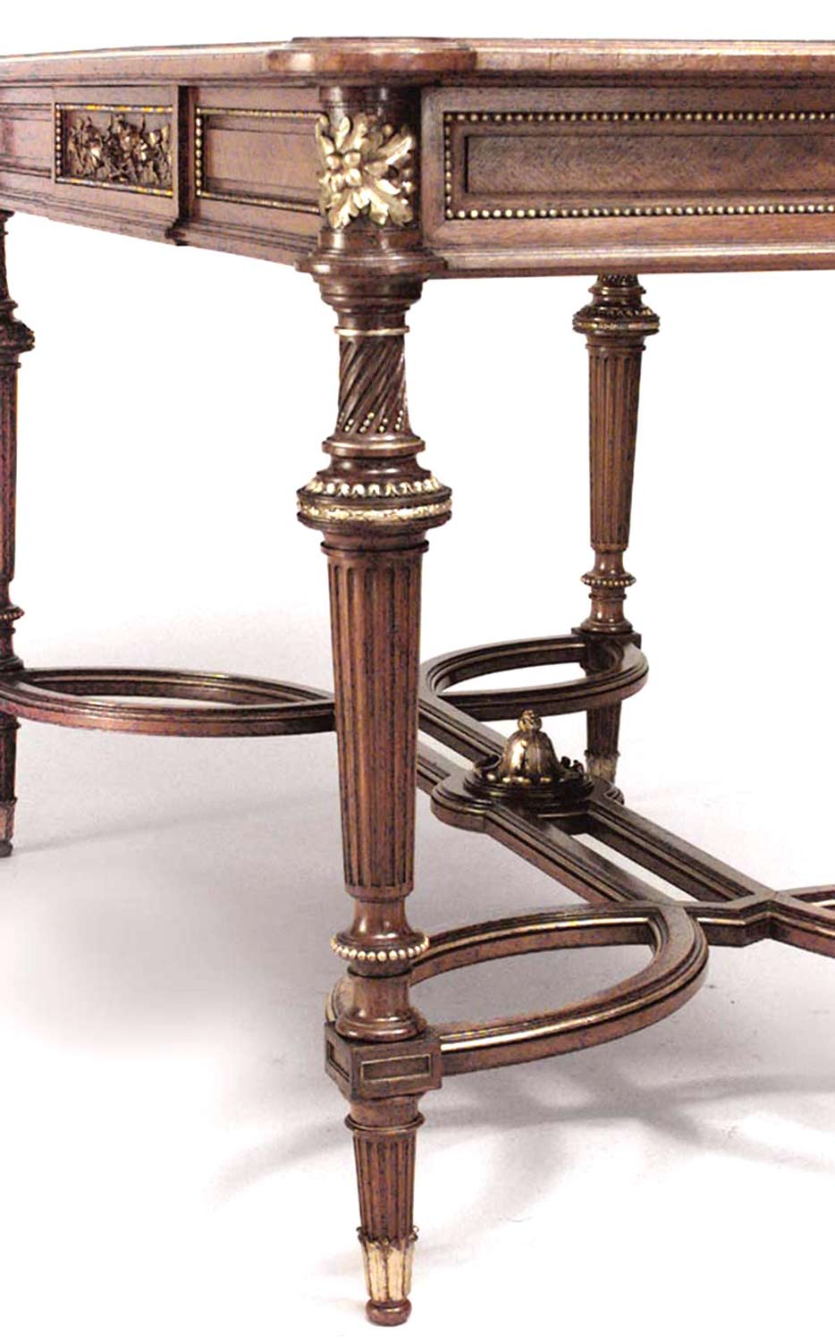 French Louis XVI style (19th Century) walnut center table with carved gilt trim and apron with carved floral design and open stretcher.