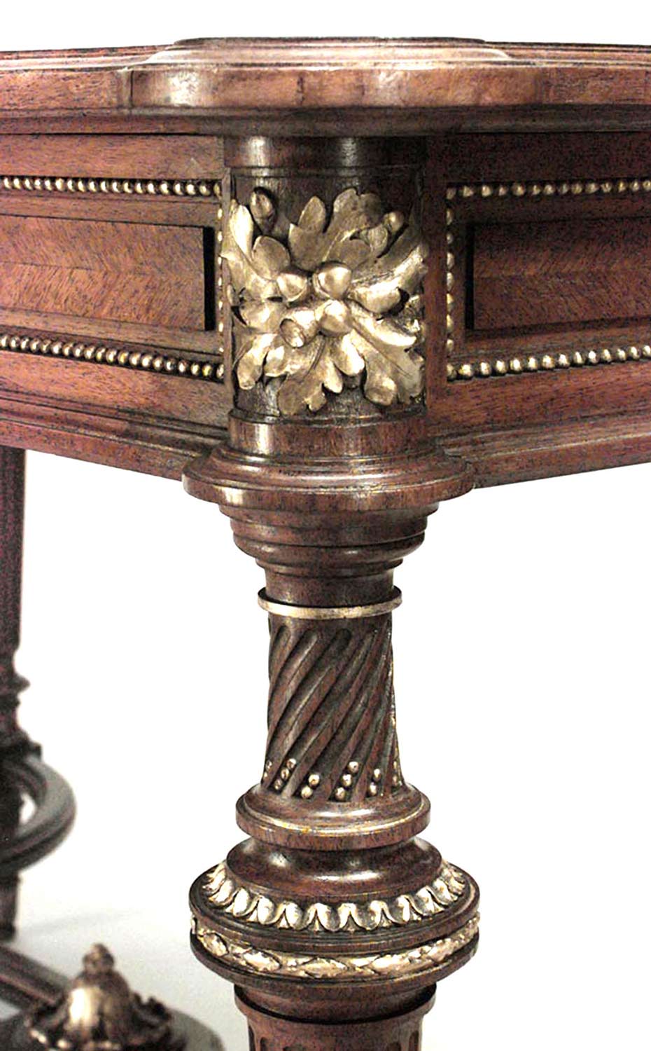 French Louis XVI style (19th Century) walnut center table with carved gilt trim and apron with carved floral design and open stretcher..