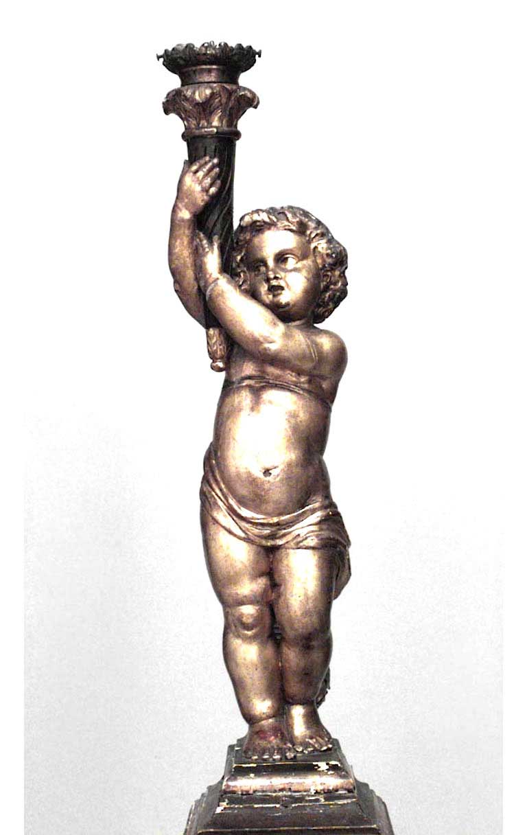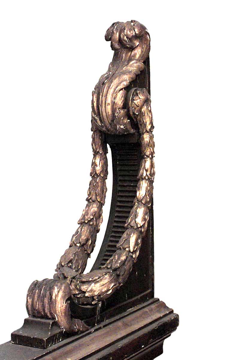 PAIR of French Louis XVI style (19th Century) walnut and gilt trimmed filigree railing with gilt cupid holding torch and wreath back (PRICED AS PAIR).