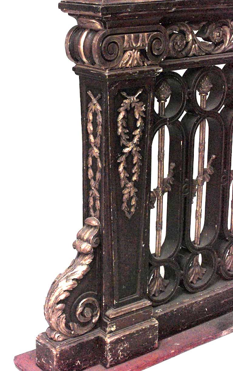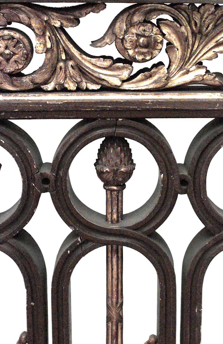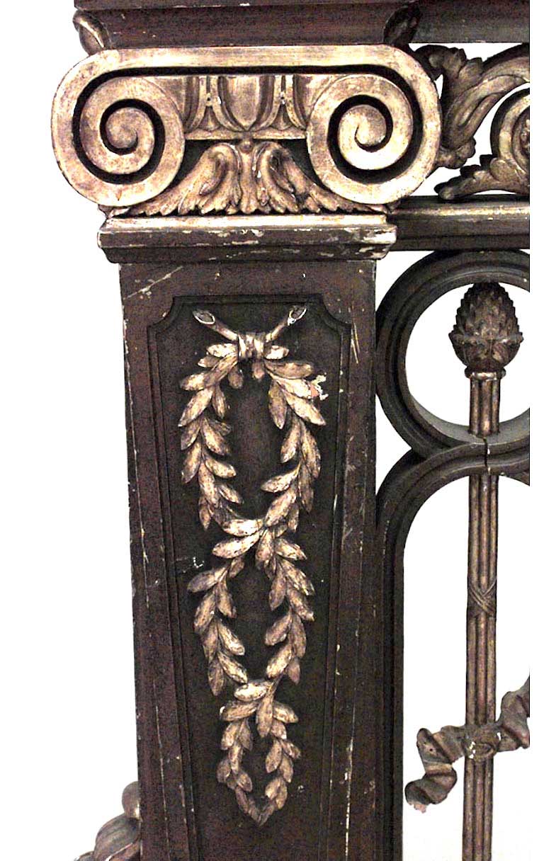 PAIR of French Louis XVI style (19th Century) walnut and gilt trimmed filigree railing with gilt cupid holding torch and wreath back (PRICED AS PAIR)..