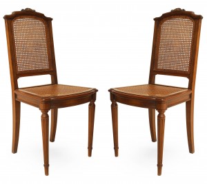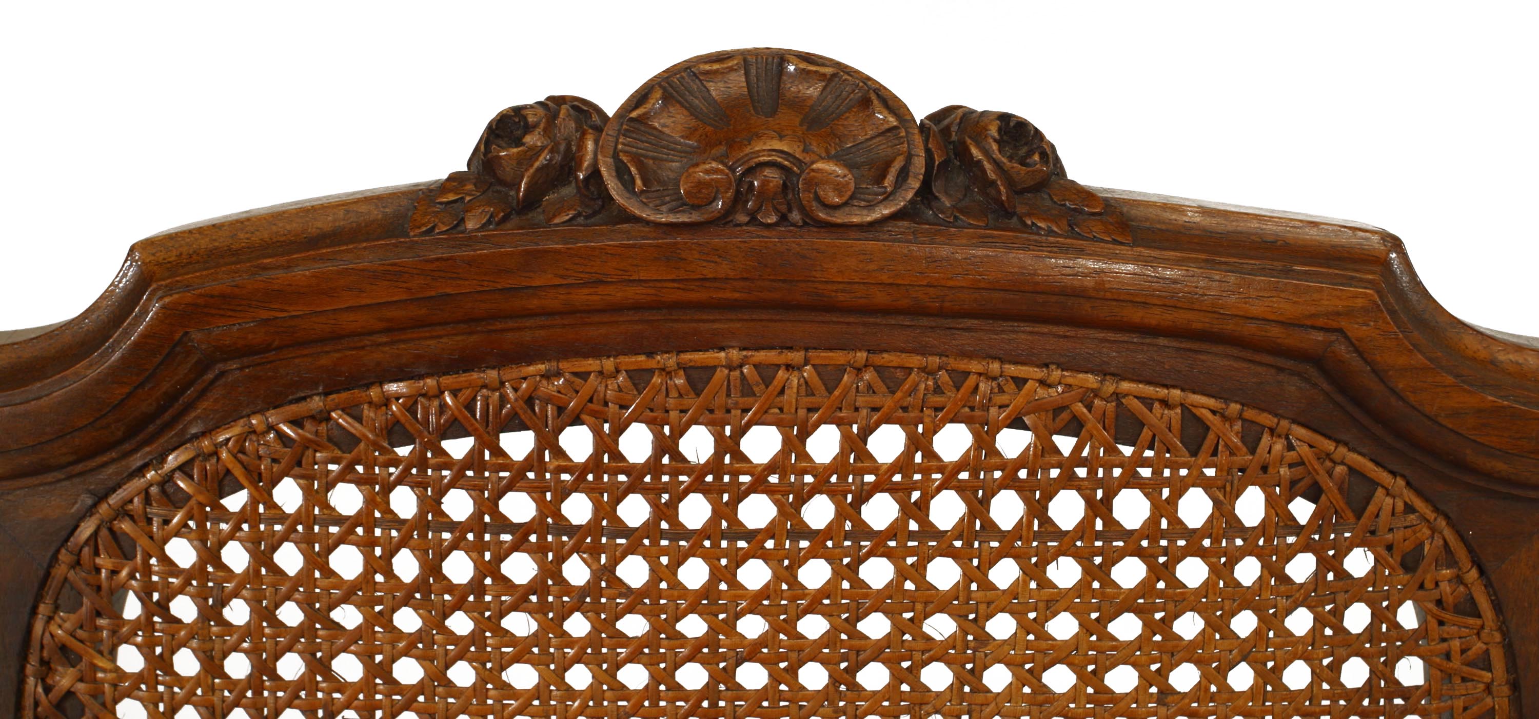 SET of 6 French Louis XVI style (19/20th Cent) walnut side chairs with cane seat and back with a carved back crest..