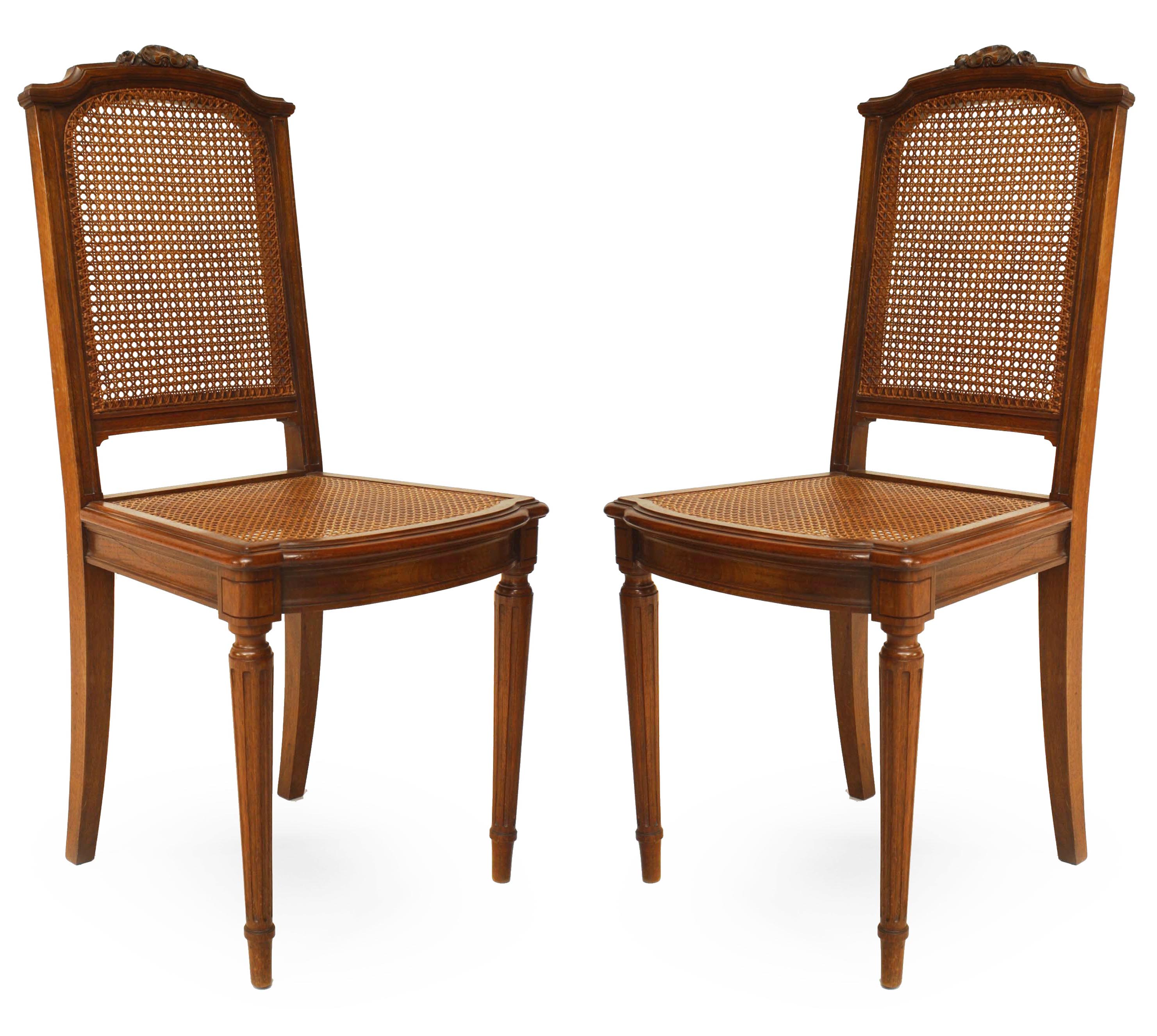 SET of 6 French Louis XVI style (19/20th Cent) walnut side chairs with cane seat and back with a carved back crest.