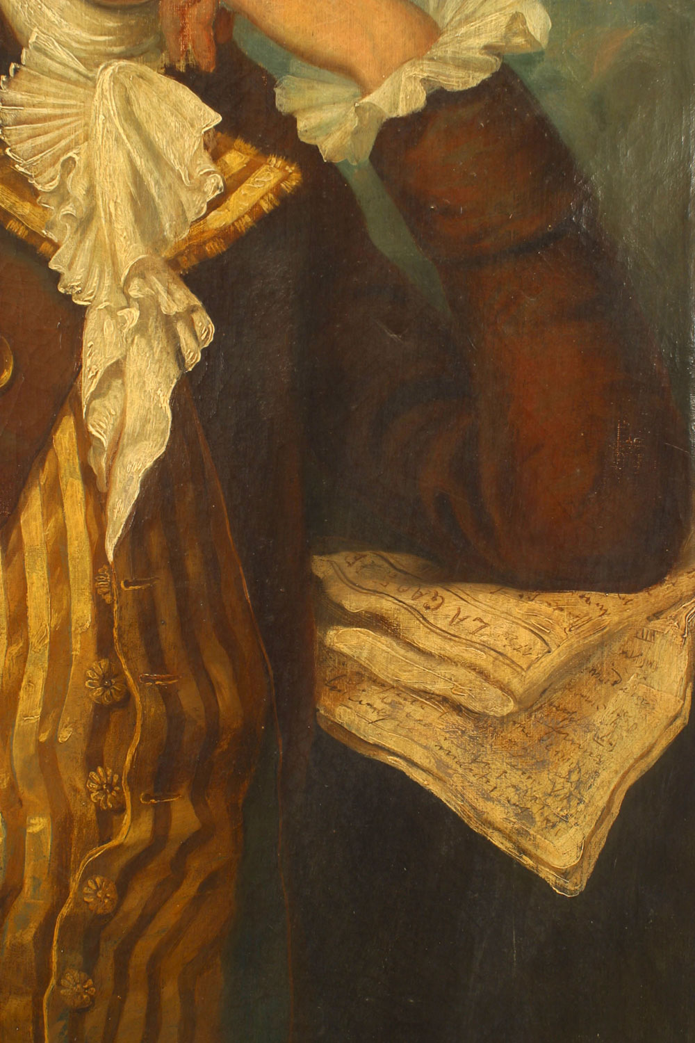 French Louis XVI (18th Cent) oil painting portrait of a young man in a brown jacket leaning on a table with papers in a stripped carved frame (att: JEAN-MARC NATTIER) (companion portrait of lady: 029045)