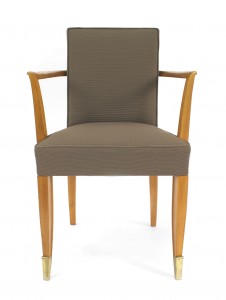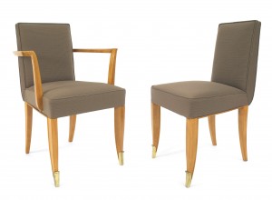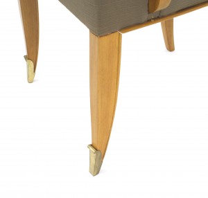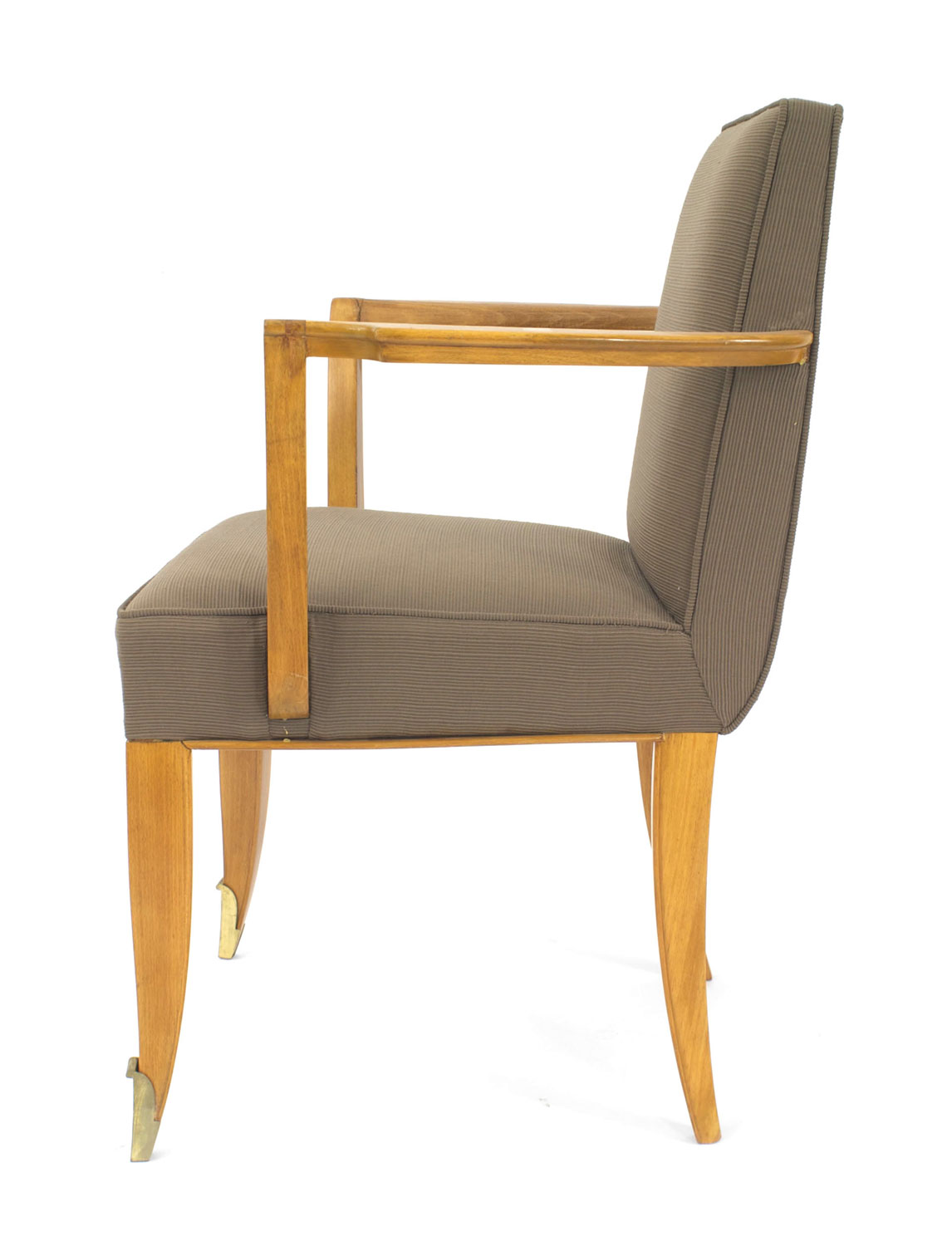 SET of 10 French 1940s mahogany chairs with grey upholstery on tapering square legs with ormolu sabot. 2 arms and 8 sides/arm: 23¼"w x 22"d x 33½"h) (att: JEAN PASCAUD)