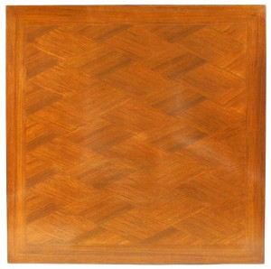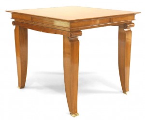 French 1940s square mahogany game table with diamond design inlaid top and scrolled capital top on square tapered legs with bronze sabot feet. (attributed to JEAN PASCAUD)