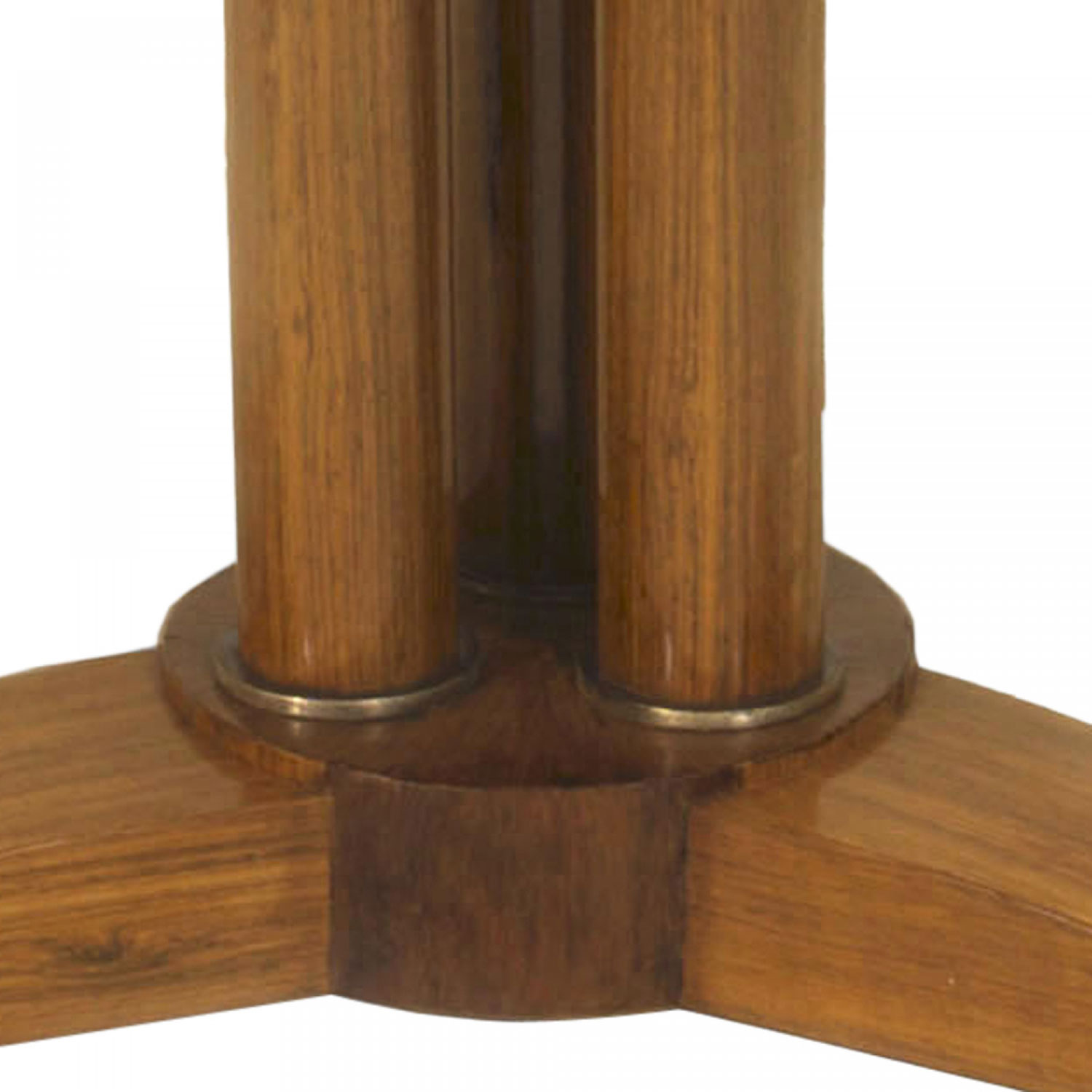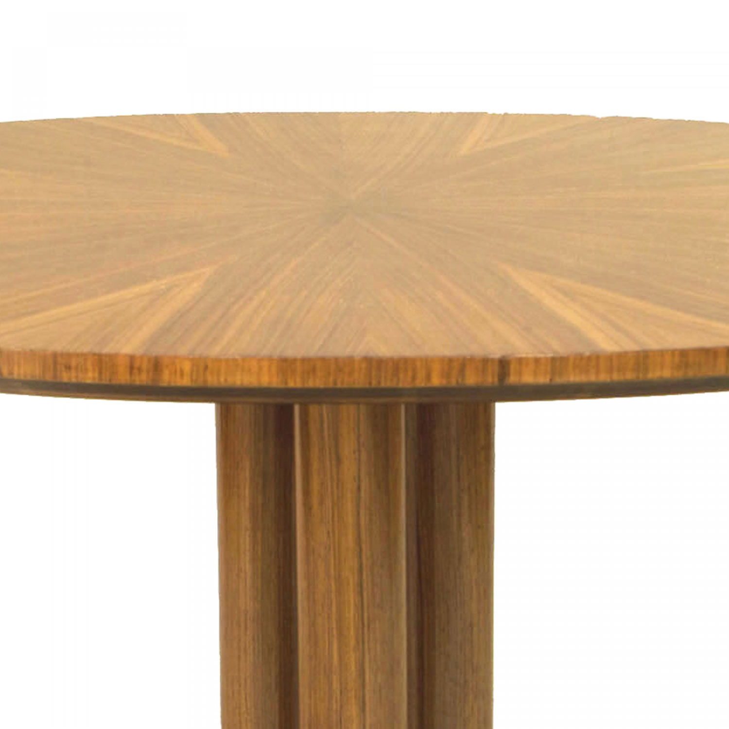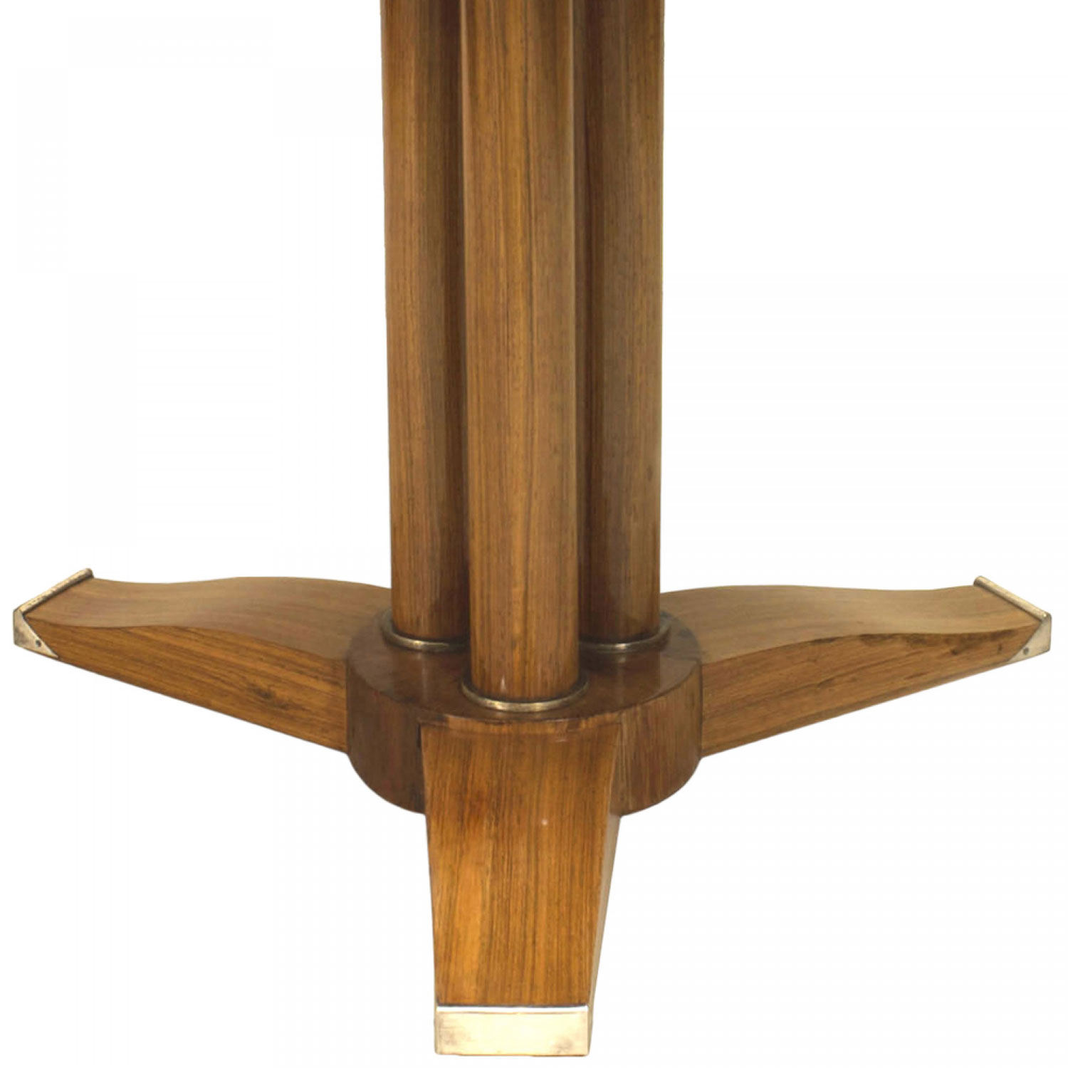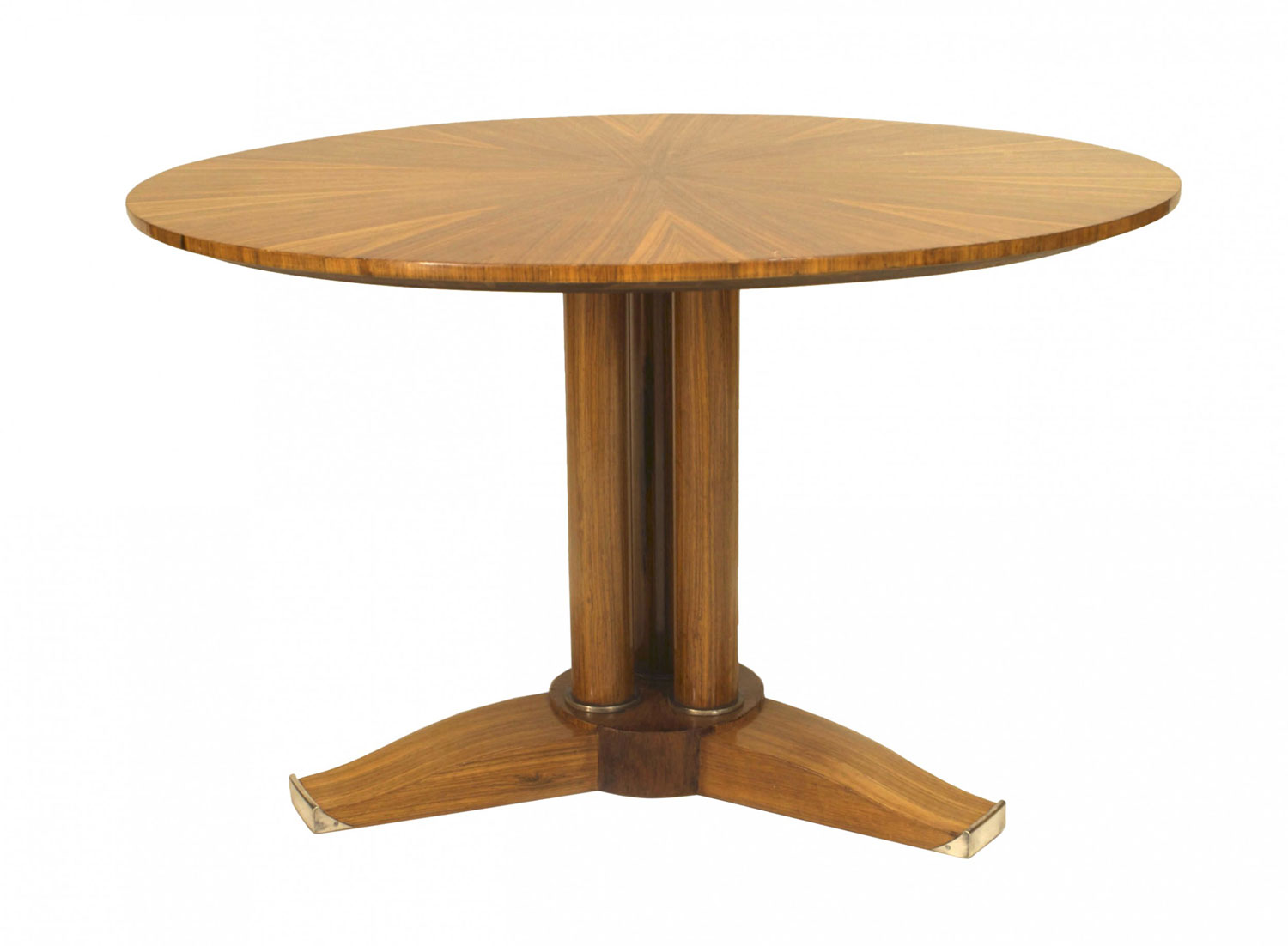 French Mid-Century (1940s) blond mahogany coffee table with a round sunburst design top supported on a three-column base with bronze trim and three flat feet. (JULES LELEU)