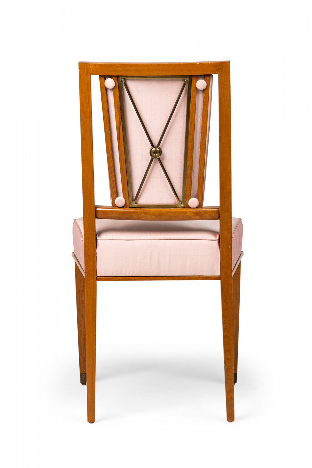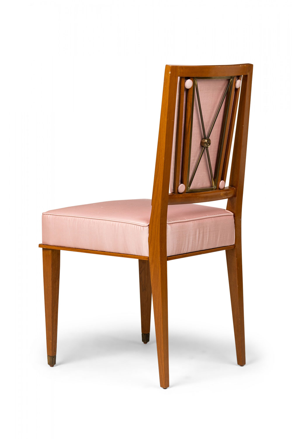 SET of 8 French (1940s) style brass & maple side chairs with X form open backs above removable pink silk upholstered backs and seats. (manner of JACQUES ADNET) (PRICED AS SET) (4 original chairs with beige upholstery: 059091)