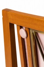 SET of 8 French (1940s) style brass & maple side chairs with X form open backs above removable pink silk upholstered backs and seats. (manner of JACQUES ADNET) (PRICED AS SET) (4 original chairs with beige upholstery: 059091).