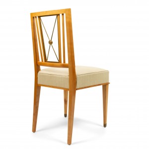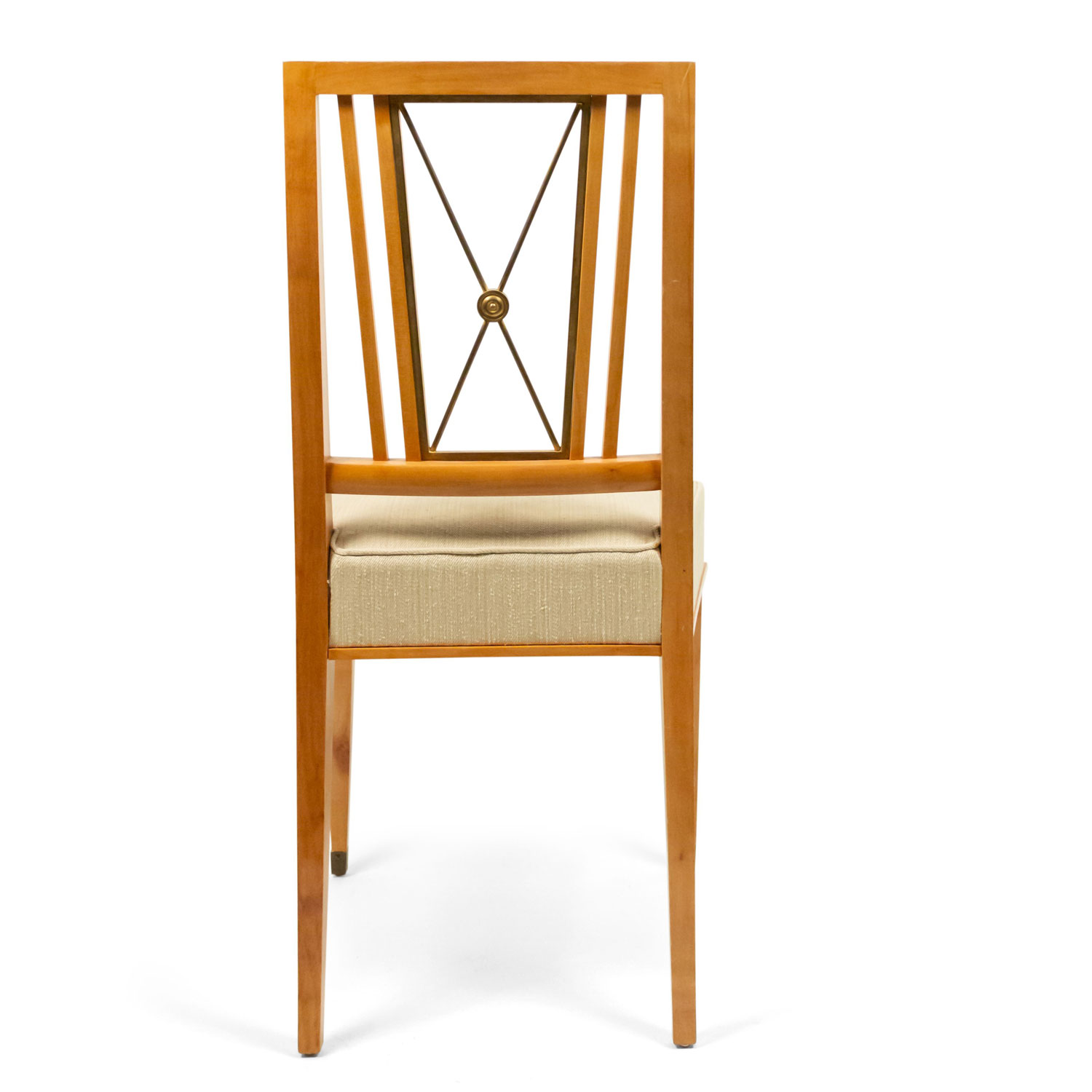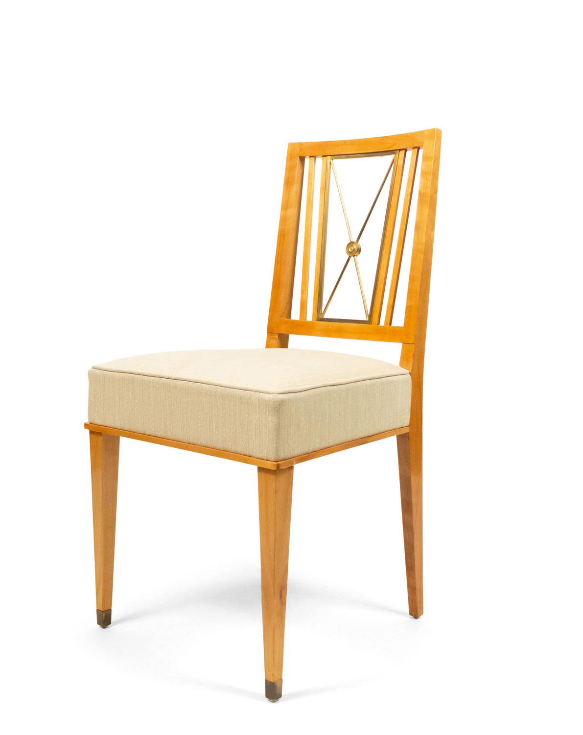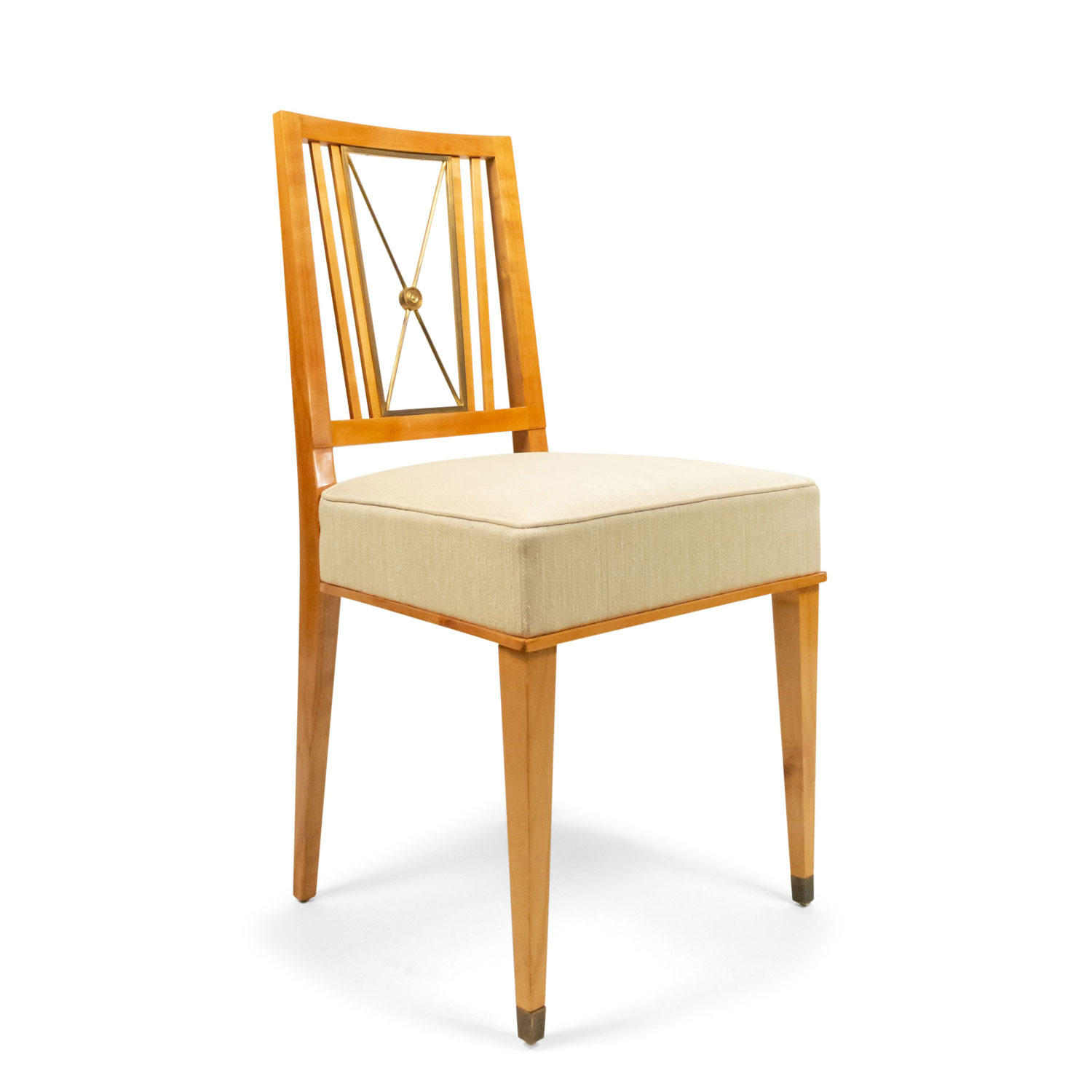 SET of 4 French (1940s) brass & maple side chairs with X form open backs above tan silk upholstered seats. (attributed to: JACQUES ADNET)(PRICED AS SET)(8 Similar chairs in pink: 059091A)
